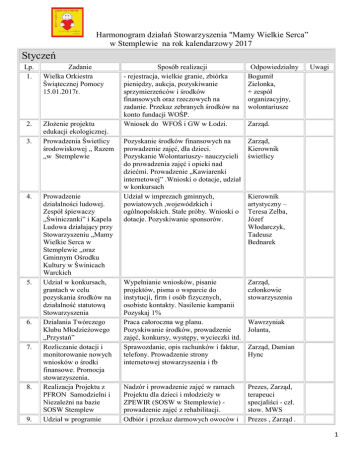 Harmonogram działań Stowarzyszenia "Mamy Wielkie Serca” w Stemplewie na rok kalendarzowy 2017 Styczeń Lp. 1. 2. 3. 4. 5. 6. 7. 8. 9. Zadanie Wielka Orkiestra Świątecznej Pomocy 15.01.2017r. Złożenie projektu edukacji ekologicznej. Prowadzenia Świetlicy środowiskowej „ Razem „w Stemplewie Prowadzenie działalności ludowej. Zespół śpiewaczy „Świniczanki” i Kapela Ludowa działający przy Stowarzyszeniu „Mamy Wielkie Serca w Stemplewie „oraz Gminnym Ośrodku Kultury w Świnicach Warckich Udział w konkursach, grantach w celu pozyskania środków na działalność statutową Stowarzyszenia Działania Twórczego Klubu Młodzieżowego „Przystań” Rozliczanie dotacji i monitorowanie nowych wniosków o środki finansowe. Promocja stowarzyszenia. Realizacja Projektu z PFRON Samodzielni i Niezależni na bazie SOSW Stemplew Udział w programie Sposób realizacji - rejestracja, wielkie granie, zbiórka pieniędzy, aukcja, pozyskiwanie sprzymierzeńców i środków finansowych oraz rzeczowych na zadanie. Przekaz zebranych środków na konto fundacji WOŚP. Wniosek do WFOŚ i GW w Łodzi. Odpowiedzialny Bogumił Zielonka, + zespół organizacyjny, wolontariusze Pozyskanie środków finansowych na prowadzenie zajęć, dla dzieci. Pozyskanie Wolontariuszy- nauczycieli do prowadzenia zajęć i opieki nad dziećmi. Prowadzenie „Kawiarenki internetowej” .Wnioski o dotacje, udział w konkursach Udział w imprezach gminnych, powiatowych ,wojewódzkich i ogólnopolskich. Stałe próby. Wnioski o dotacje. Pozyskiwanie sponsorów. Zarząd, Kierownik świetlicy Wypełnianie wniosków, pisanie projektów, pisma o wsparcie do instytucji, firm i osób fizycznych, osobiste kontakty. Nasilenie kampanii Pozyskaj 1% Praca całoroczna wg planu. Pozyskiwanie środków, prowadzenie zajęć, konkursy, występy, wycieczki itd. Sprawozdanie, opis rachunków i faktur, telefony. Prowadzenie strony internetowej stowarzyszenia i fb Zarząd, członkowie stowarzyszenia Nadzór i prowadzenie zajęć w ramach Projektu dla dzieci i młodzieży w ZPEWIR (SOSW w Stemplewie) prowadzenie zajęć z rehabilitacji. Odbiór i przekaz darmowych owoców i Prezes, Zarząd, terapeuci specjaliści - czł. stow. MWS Prezes , Zarząd . Uwagi Zarząd. Kierownik artystyczny – Teresa Zelba, Józef Włodarczyk, Tadeusz Bednarek Wawrzyniak Jolanta, Zarząd, Damian Hync 1 Agencji Rynku Rolnego 10. Choinka Noworoczna w ZPEWIR Stemplew warzyw dla instytucji publicznych w tym szkoły, placówki oświatowe, przedszkola itp. Pomoc w organizacji dnia, zakup paczek i upominków dla dzieci, Zarząd Luty Lp. 1. 2. 5. 6. 7. 8. Zadanie Sposób realizacji Turniej Warcabowo Pozyskanie środków finansowych i Szachowy dla dzieci i sprzymierzeńców. Organizacja. młodzieży w Stemplewie Nagrody, dyplomy, Kino familijne dla dzieci, młodzieży i dorosłych Szkolenia i warsztaty dla kadry zarządzającej, nauczycieli i członków stowarzyszeń OPP Udział w konkursach, grantach w celu pozyskania środków na działalność statutową Stowarzyszenia Wybór Człowieka Roku 2016 w Gminie Świnice Warckie. Wolontariusza Roku w szkołach Organizacja Walnego Zebrania ogółu członków stowarzyszenia Projekcja filmów poprzez rzutnik multimedialny Odpowiedzialny P.Gawron, D.Hync, Zarząd, Uwagi Kierownik świetlicy, Zaplanowanie cyklu i form szkoleń Zarząd, Prezes stacjonarnych oraz wyjazdowych w celu uzyskania stosownych certyfikatów. Zatrudnienie odpowiedniej kadry kształcącej i dostosowanie programów do oczekiwań uczestników. Dobór bazy Wypełnianie wniosków, pisanie Zarząd, Prezes, projektów. Pozyskanie środków finansowych i sprzymierzeńców. Organizacja Gali Zarząd, Kapituła konkursu Ogłoszenie na www, wysłanie zaproszeń, organizacja wg scenariusza Prezes, Zarząd Sposób realizacji Program ekologiczny Program socjoterapeutyczny Program rehabilitacyjny z PFRON Program sportowy Program turystyczny Program kulturalny I inne Przygotowanie materiałów, zlecenie do druku. Odpowiedzialny Kierownik świetlicy, instruktorzy, opiekunowie Zarząd Marzec Lp. 1. 2. Zadanie Realizacja programów całorocznych wg złożonych wniosków Wydanie kolejnego numeru kwartalnika „Nasza Gazeta” Uwagi Redaktor naczelny Zarząd 2 3. 4. Projekt - Siedziba Stowarzyszenia MWS – „OAZA dla dzieci i młodzieży pod lasem”. Rozwój bazy do hipoterapii w ZPEWIR (SOSW ) w Stemplewie. Wsparcie przy rozbudowie bazy. 5. Pozyskanie środków na lato 2017 Praca nad koncepcją- cd. Zarząd Pomoc przy budowie i rozbudowie stajni i zaplecza do hipoterapii. Wykorzystanie zakupionego konia i sprzętu ze środków „Reklama Dzieciom” do prowadzenie zajęć z hipoterapii dla podopiecznych stowarzyszenia. Wsparcie promocji Szlaku konnego województwa Łódzkiego. Pozyskanie środków finansowych i rzeczowych. Wystąpienia do fundacji, stowarzyszeń, udział w konkursach dotacyjnych, grantach, wnioski o dotację letniego wypoczynku Zarząd , Instruktor sportowy Sposób realizacji Osobiste kontakty, pisma, wnioski, oferty, udział w zebraniach, sesjach, szkoleniach, konferencjach, współorganizacja imprez. Wymiana doświadczeń, pomoc w promocji imprez ,szkolenia, konferencje, warsztaty, wspólne imprezy, udzielanie wsparcia. Wymiana doświadczeń, organizacja imprez, szkolenia, konferencje, warsztaty. Pomoc wzajemna. Odpowiedzialny Zarząd Konkurs na piosenkę indywidualną, zespołową, pozyskanie funduszy na dekorację, poczęstunek, nagrody, dyplomy i upominki dla uczestników Festiwalu. Złożenie sprawozdania i faktur. Zarząd Zarząd Kwiecień Lp. 1. 2. 3. Zadanie Współpraca z Samorządem Gminy, Powiatu, Województwa, Współpraca z instytucjami, szkołami, przedszkolami, ośrodkami kultury, Współpraca z fundacjami, stowarzyszeniami, towarzystwami, 4. Organizacja Festiwalu Piosenki Zuchowej i Harcerskiej Hufca ZHP Uniejów w Stemplewie. 5. Rozliczenie Projektu z PFRON Samodzielni i Niezależni. Uwagi Zarząd Zarząd Prezes, Zarząd 3 Ma