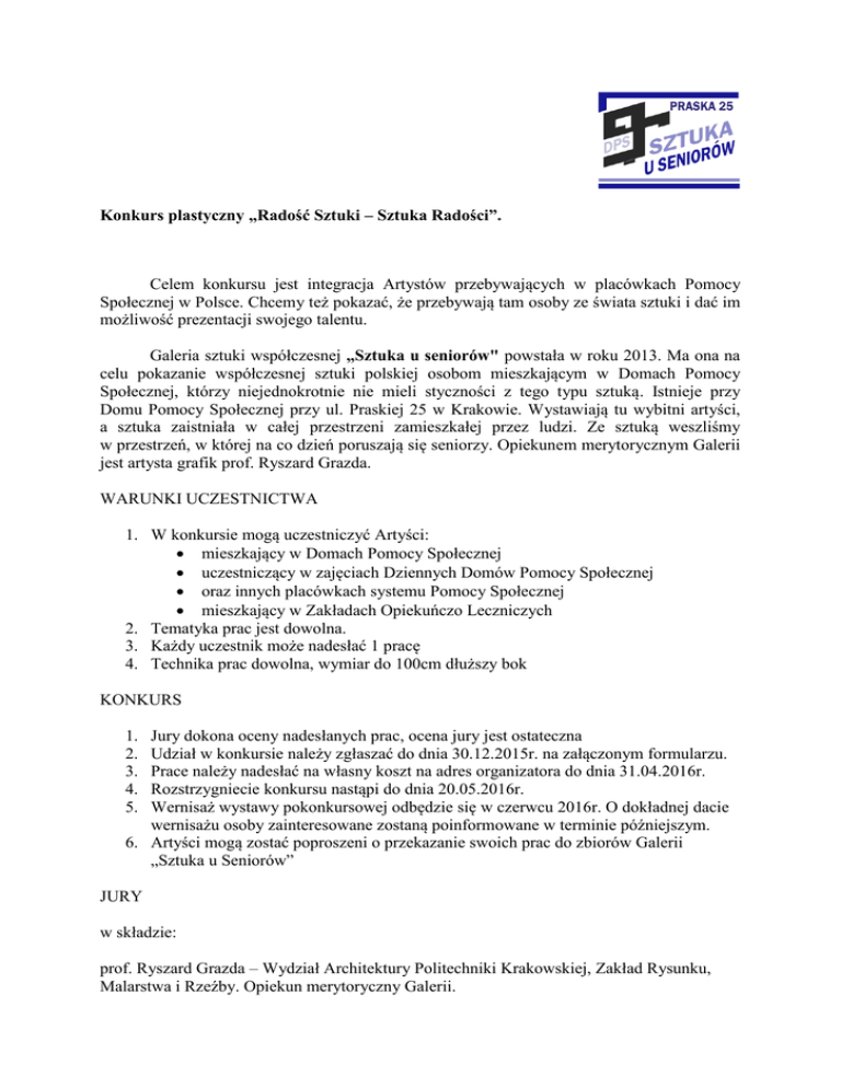 Konkurs plastyczny „Radość Sztuki – Sztuka Radości”. Celem konkursu jest integracja Artystów przebywających w placówkach Pomocy Społecznej w Polsce. Chcemy też pokazać, że przebywają tam osoby ze świata sztuki i dać im możliwość prezentacji swojego talentu. Galeria sztuki współczesnej „Sztuka u seniorów" powstała w roku 2013. Ma ona na celu pokazanie współczesnej sztuki polskiej osobom mieszkającym w Domach Pomocy Społecznej, którzy niejednokrotnie nie mieli styczności z tego typu sztuką. Istnieje przy Domu Pomocy Społecznej przy ul. Praskiej 25 w Krakowie. Wystawiają tu wybitni artyści, a sztuka zaistniała w całej przestrzeni zamieszkałej przez ludzi. Ze sztuką weszliśmy w przestrzeń, w której na co dzień poruszają się seniorzy. Opiekunem merytorycznym Galerii jest artysta grafik prof. Ryszard Grazda. WARUNKI UCZESTNICTWA 1. W konkursie mogą uczestniczyć Artyści: mieszkający w Domach Pomocy Społecznej uczestniczący w zajęciach Dziennych Domów Pomocy Społecznej oraz innych placówkach systemu Pomocy Społecznej mieszkający w Zakładach Opiekuńczo Leczniczych 2. Tematyka prac jest dowolna. 3. Każdy uczestnik może nadesłać 1 pracę 4. Technika prac dowolna, wymiar do 100cm dłuższy bok KONKURS Jury dokona oceny nadesłanych prac, ocena jury jest ostateczna Udział w konkursie należy zgłaszać do dnia 30.12.2015r. na załączonym formularzu. Prace należy nadesłać na własny koszt na adres organizatora do dnia 31.04.2016r. Rozstrzygniecie konkursu nastąpi do dnia 20.05.2016r. Wernisaż wystawy pokonkursowej odbędzie się w czerwcu 2016r. O dokładnej dacie wernisażu osoby zainteresowane zostaną poinformowane w terminie późniejszym. 6. Artyści mogą zostać poproszeni o przekazanie swoich prac do zbiorów Galerii „Sztuka u Seniorów” 1. 2. 3. 4. 5. JURY w składzie: prof. Ryszard Grazda – Wydział Architektury Politechniki Krakowskiej, Zakład Rysunku, Malarstwa i Rzeźby. Opiekun merytoryczny Galerii. prof. Lucjan Orzech - Wydział Sztuki Uniwersytetu Pedagogicznego w Krakowie Joanna Warchoł – Prezes Związku Polskich Artystów Plastyków Okręg Krakowski Beata Magiera – Dyrektor DPS przy ul. Praskiej 25 w Krakowie Konrad Prośniak – opiekun Galerii Organizatorzy przewidują w konkursie nagrody: I nagroda - 1000 zł II nagroda - 600 zł III nagroda - 400 zł Nagrody mogą być w formie pieniężnej lub rzeczowej. Jury zastrzega prawo przyznania dodatkowych nagród i wyróżnień. 1. Laureaci konkursu zostaną poinformowani listownie, e-mailem, telefonicznie na adresy i numery telefonów podane w zgłoszeniu. 2. Wręczenie nagród nastąpi podczas wernisażu wystawy pokonkursowej, zorganizowanej w Galerii „Sztuka u Seniorów” w DPS przy ul. Praskiej 25 w Krakowie . Wszelkich informacji na temat konkursu udziela p. Konrad Prośniak tel. 12 266 03 64; 502 658 263 Galeria „Sztuka u Seniorów” Dom Pomocy Społecznej ul. Praska 25 30-686 Kraków