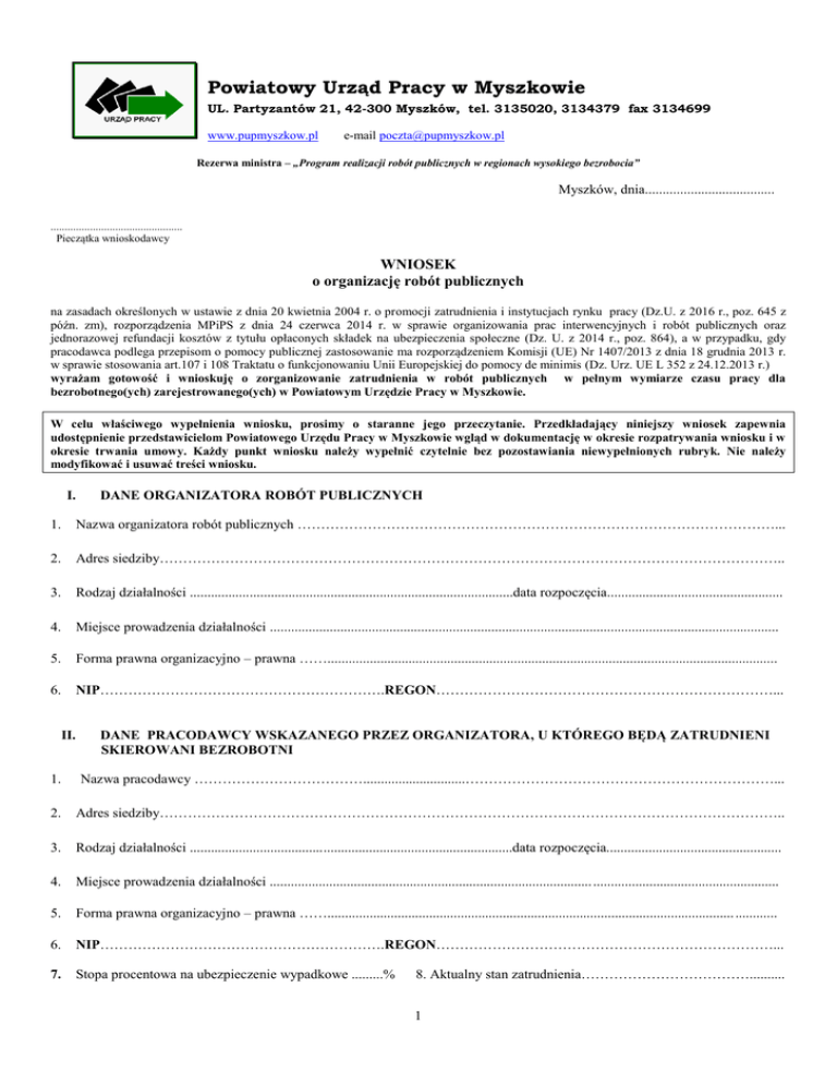 Powiatowy Urząd Pracy w Myszkowie UL. Partyzantów 21, 42-300 Myszków, tel. 3135020, 3134379 fax 3134699 www.pupmyszkow.pl e-mail [email protected] Rezerwa ministra – „Program realizacji robót publicznych w regionach wysokiego bezrobocia” Myszków, dnia..................................... ............................................... Pieczątka wnioskodawcy WNIOSEK o organizację robót publicznych na zasadach określonych w ustawie z dnia 20 kwietnia 2004 r. o promocji zatrudnienia i instytucjach rynku pracy (Dz.U. z 2016 r., poz. 645 z późn. zm), rozporządzenia MPiPS z dnia 24 czerwca 2014 r. w sprawie organizowania prac interwencyjnych i robót publicznych oraz jednorazowej refundacji kosztów z tytułu opłaconych składek na ubezpieczenia społeczne (Dz. U. z 2014 r., poz. 864), a w przypadku, gdy pracodawca podlega przepisom o pomocy publicznej zastosowanie ma rozporządzeniem Komisji (UE) Nr 1407/2013 z dnia 18 grudnia 2013 r. w sprawie stosowania art.107 i 108 Traktatu o funkcjonowaniu Unii Europejskiej do pomocy de minimis (Dz. Urz. UE L 352 z 24.12.2013 r.) wyrażam gotowość i wnioskuję o zorganizowanie zatrudnienia w robót publicznych w pełnym wymiarze czasu pracy dla bezrobotnego(ych) zarejestrowanego(ych) w Powiatowym Urzędzie Pracy w Myszkowie. W celu właściwego wypełnienia wniosku, prosimy o staranne jego przeczytanie. Przedkładający niniejszy wniosek zapewnia udostępnienie przedstawicielom Powiatowego Urzędu Pracy w Myszkowie wgląd w dokumentację w okresie rozpatrywania wniosku i w okresie trwania umowy. Każdy punkt wniosku należy wypełnić czytelnie bez pozostawiania niewypełnionych rubryk. Nie należy modyfikować i usuwać treści wniosku. I. DANE ORGANIZATORA ROBÓT PUBLICZNYCH 1. Nazwa organizatora robót publicznych …………………………………………………………………………………………... 2. Adres siedziby…………………………………………………………………………………………………………………….. 3. Rodzaj działalności ............................................................................................data rozpoczęcia.................................................. 4. Miejsce prowadzenia działalności ................................................................................................................................................. 5. Forma prawna organizacyjno – prawna ……................................................................................................................................ 6. NIP…………………………………………………….REGON………………………………………………………………... II. DANE PRACODAWCY WSKAZANEGO PRZEZ ORGANIZATORA, U KTÓREGO BĘDĄ ZATRUDNIENI SKIEROWANI BEZROBOTNI 1. Nazwa pracodawcy ……………………………….............................…………………………………………………………... 2. Adres siedziby…………………………………………………………………………………………………………………….. 3. Rodzaj działalności ............................................................................................data rozpoczęcia.................................................. 4. Miejsce prowadzenia działalności ............................................................................................ ..................................................... 5. Forma prawna organizacyjno – prawna …….................................................................................................................... ............ 6. NIP…………………………………………………….REGON………………………………………………………………... 7. Stopa procentowa na ubezpieczenie wypadkowe .........% 8. Aktualny stan zatrudnienia……………………………….......... 1 DANE DOTYCZACE ORGANIZACJI ROBÓT PUBLICZNYCH III. 1. Liczba bezrobotnych proponowana do zatrudnienia .................................................................................................................... 2. Szczegółowy plan zatrudnienia nowoutworzonych stanowisk pracy: LP STANOWISKO Ilość stanowisk Proponowane wynagrodzenie brutto Proponowana kwota refundacji Proponowana data zatrudnienia Okres zatrudnienia (od-do) 1. 2. 3. 3. Pożądane lub niezbędne kwalifikacje do zatrudnienia bezrobotnych: …………………………………………………………………………………………………………………………………….. 4. …………………………………………………………………………………………………………………………………….. Miejsce i rodzaj prac, które mają być wykonywane przez skierowanych bezrobotnych …………………………………………………………………………………………………………………………………….. …………………………………………………………………………………………………………………………………….. 5. Imię i nazwisko osoby odpowiedzialnej za współpracę z urzędem:……………………………………………………………… stanowisko…………………………… telefon,………………………………….e-mail:…………….………………………… 6. Numer konta i nazwa Banku na które przekazywana będzie refundacja: …………………………………………………………………………………………………………………………………….. 7. Po zakończeniu robót publicznych zapewniam zatrudnienie dla ...............................osób w formie: umowy o pracę na czas określony* - na okres ……………. - wymiar czau pracy ………………………….. umowy o pracę na czas nieokreślony - na okre