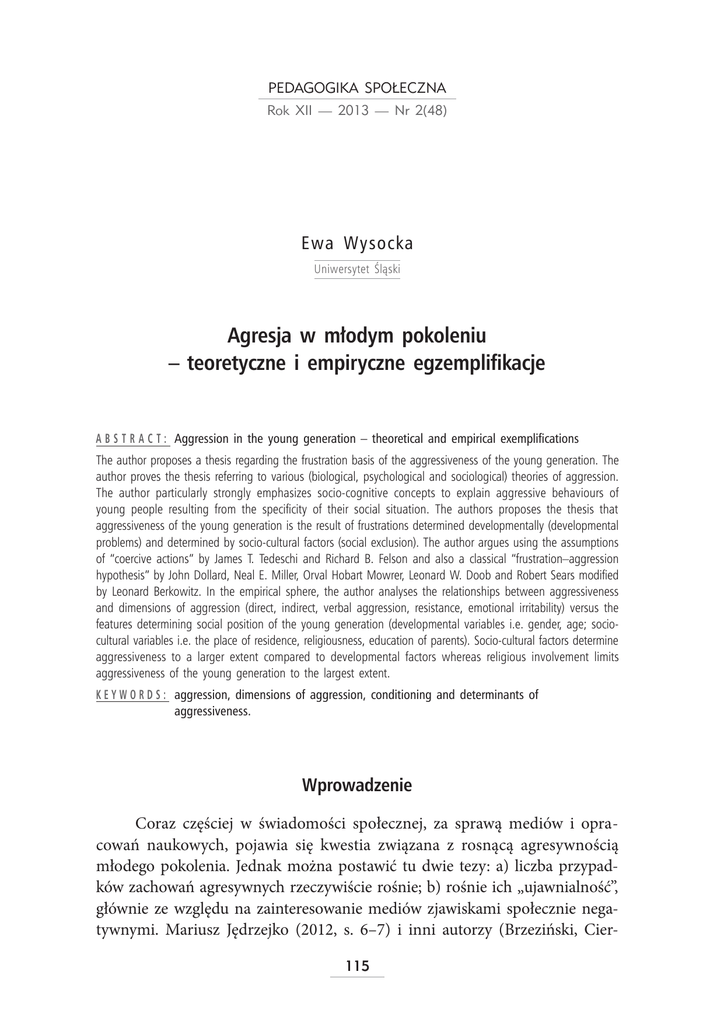 (miejsce zamieszkania, religijność), zaś znacznie słabiej koreluje z zmiennymi, których natura jest złożona – rozwojowo-społecznymi (płeć, wiek). Potwierdza to tezę o frustracyjnej naturze agresji, która wynika z marginalizacji