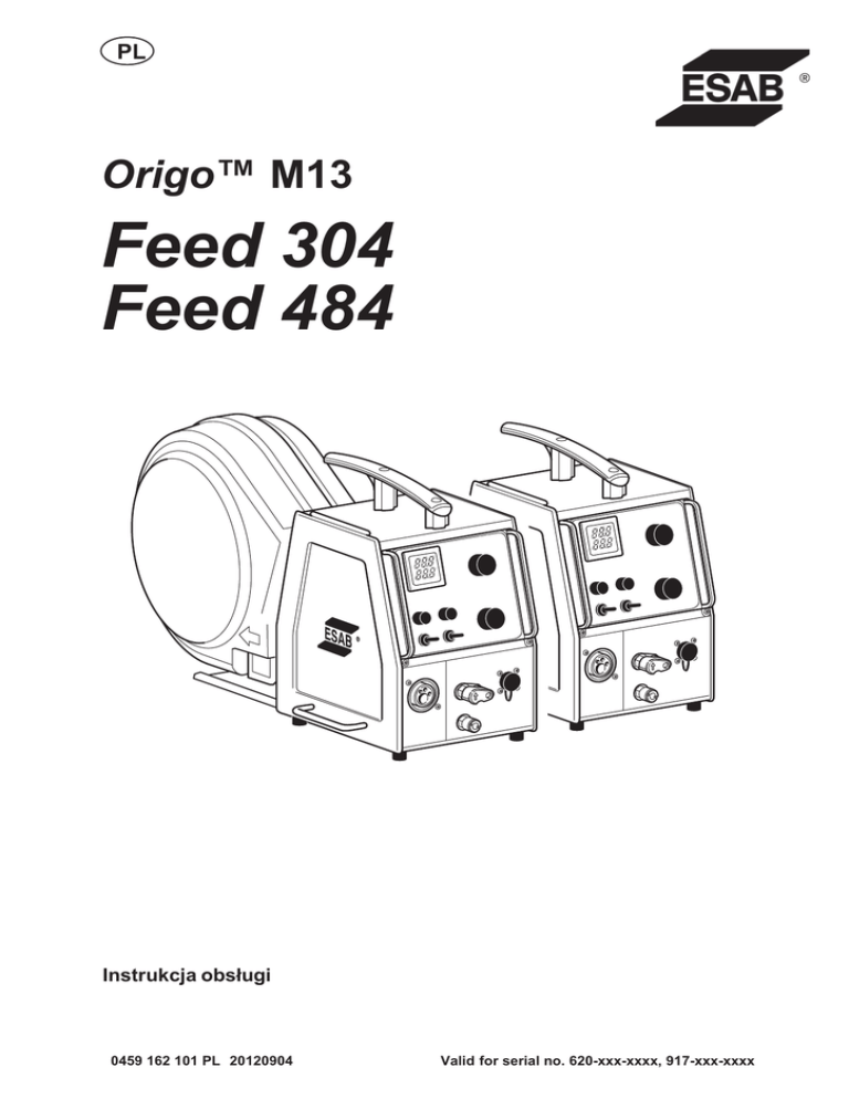 PL Origo™ M13 Feed 304 Feed 484 Instrukcja obsługi 0459 162 101 PL 20120904 Valid for serial no. 620-xxx-xxxx, 917-xxx-xxxx -2- 1 BEZPIECZEŃSTWO . . . . . . . . . . . . . . . . . . . . . . . . . . . . . . . . . . . . . . . . . . . . . . . . 2 WSTĘP . . . . . . . . . . . . . . . . . . . . . . . . . . . . . . . . . . . . . . . . . . . . . . . . . . . . . . . . . . . . 2.1 4 6 Wyposażenie . . . . . . . . . . . . . . . . . . . . . . . . . . . . . . . . . . . . . . . . . . . . . . . . . . . . . . . . . . . . . 6 3 DANE TECHNICZNE . . . . . . . . . . . . . . . . . . . . . . . . . . . . . . . . . . . . . . . . . . . . . . . . 4 INSTALACJA . . . . . . . . . . . . . . . . . . . . . . . . . . . . . . . . . . . . . . . . . . . . . . . . . . . . . . 6 7 4.1 Instrukcje podnoszenia . . . . . . . . . . . . . . . . . . . . . . . . . . . . . . . . . . . . . . . . . . . . . . . . . . . . . 8 5 DZIAŁANIE . . . . . . . . . . . . . . . . . . . . . . . . . . . . . . . . . . . . . . . . . . . . . . . . . . . . . . . . 8 5.1 5.2 5.3 5.4 5.5 5.6 5.7 5.8 5.9 Złącza i sterowanie . . . . . . . . . . . . . . . . . . . . . . . . . . . . . . . . . . . . . . . . . . . . . . . . . . . . . . . . Przylącze wodne . . . . . . . . . . . . . . . . . . . . . . . . . . . . . . . . . . . . . . . . . . . . . . . . . . . . . . . . . . Procedura startowa . . . . . . . . . . . . . . . . . . . . . . . . . . . . . . . . . . . . . . . . . . . . . . . . . . . . . . . . Opisy funkcji . . . . . . . . . . . . . . . . . . . . . . . . . . . . . . . . . . . . . . . . . . . . . . . . . . . . . . . . . . . . . . Nacisk podajnika drutu . . . . . . . . . . . . . . . . . . . . . . . . . . . . . . . . . . . . . . . . . . . . . . . . . . . . . Zmiana / ładowanie drutu Feed 304 . . . . . . . . . . . . . . . . . . . . . . . . . . . . . . . . . . . . . . . . . . Zmiana / ładowanie drutu Feed 484 . . . . . . . . . . . . . . . . . . . . . . . . . . . . . . . . . . . . . . . . . . Zmiana rolek podających w urządzeniu Feed 304 . . . . . . . . . . . . . . . . . . . . . . . . . . . . . . Zmiana rolek podających w urządzeniu Feed 484 . . . . . . . . . . . . . . . . . . . . . . . . . . . . . . 9 10 10 10 11 12 12 12 13 6 KONSERWACJA . . . . . . . . . . . . . . . . . . . . . . . . . . . . . . . . . . . . . . . . . . . . . . . . . . . 13 6.1 Sprawdzanie i czyszczenie . . . . . . . . . . . . . . . . . . . . . . . . . . . . . . . . . . . . . . . . . . . . . . . . . 13 7 ZAMAWIANIE CZĘŚCI ZAMIENNYCH . . . . . . . . . . . . . . . . . . . . . . . . . . . . . . . . SCHEMAT . . . . . . . . . . . . . . . . . . . . . . . . . . . . . . . . . . . . . . . . . . . . . . . . . . . . . . . . . . . . NUMER ZAMÓWIENIOWY . . . . . . . . . . . . . . . . . . . . . . . . . . . . . . . . . . . . . . . . . . . . . CZĘŚCI EKSPLOATACYJNE . . . . . . . . . . . . . . . . . . . . . . . . . . . . . . . . . . . . . . . . . . . WYPOSAŻENIE . . . . . . . . . . . . . . . . . . . . . . . . . . . . . . . . . . . . . . . . . . . . . . . . . . . . . . . 14 16 21 22 26 Zastrzegamy sobie prawo do wprowadzenia zmian. TOCo -3- PL 1 BEZPIECZEŃSTWO Użytkownicy sprzętu firmy ESAB są odpowiedzialni za przestrzeganie odpowiednich przepisów bezpieczeństwa przez osoby pracujące z lub przy tym sprzęcie. Zasady bezpieczeństwa muszą być zgodne z wymaganiami stawianymi tego rodzaju sprzętowi. Poza standardowymi przepisami dotyczącymi miejsca pracy należy przestrzegać przedstawionych zaleceń. Wszelkie prace muszą być wykonywane przez przeszkolony personel, dobrze znający zasady działania sprzętu. Niewłaściwe działanie sprzętu może prowadzić do sytuacji niebezpiecznych, a w rezultacie do obrażeń operatora oraz uszkodzenia sprzętu. 1. Każdy, kto używa sprzętu spawalniczego, musi znać się na: S jego obsłudze S lokalizacji wyłacznika awaryjnego zatrzymania S jego działaniu S Przestrzeganiu odpowiednich środków ostrożności i przepisów BHP S spawaniu i cięciu 2. Operator musi upewnić się, że: S w momencie uruchomienia sprzętu w miejscu pracy nie znajduje się żadna nieupoważniona osoba S w chwili zajarzenia łuku wszystkie osoby są odpowiednio zabezpieczone 3. Miejsce pracy musi być: S Zabezpieczone przed zagrożeniem wypadkiem, pożarem, wybuchem i promieniowaniem łuku na zewnątrz S Dobrze wentylowane, ale wolne od przeciągów 4. Sprzęt ochrony osobistej S Należy zawsze stosować zalecany sprzęt ochrony osobistej, taki jak okulary ochronne, odzież ognioodporna, rękawice ochronne. S Nie należy nosić żadnych luźnych przedmiotów, takich jak szaliki, bransolety, pierścionki, itp., które mogłyby się o coś zahaczyć lub spowodować poparzenie. 5. Ogólne środki ostrożności S Należy upewnić się czy przewód powrotny został prawidłowo podłączony. S Praca na sprzęcie zasilanym energią elektryczną powinna być wykonywana wyłącznie przez osoby posiadające odpowiednie kwalifikacje w zakresie eksploatacji takich urządzeń. S Odpowiedni sprzęt gaśniczy powinien być wyraźnie oznaczony i znajdować się w pobliżu. S Smarowania i konserwacji sprzętu nie wolno przeprowadzać podczas jego pracy. UWAGA! Przed instalacją i rozruchem urządzenia należy zapoznać się z niniejszą instrukcją. OSTROŻNIE! Urządzenia Class A nie są przeznaczone do użytku w budynkach, gdzie zasilanie elektryczne pochodzi z publicznego niskonapięciowego układu zasilania. Ze względu na przewodzone i emitowane zakłócenia, w takich lokalizacjach mogą występować potencjalne trudności w zapewnieniu kompatybilności elektromagnetycznej urządzeń Class A. bm34d1oa -4- © ESAB AB 2002 PL OSTROŻNIE! Produkt przeznaczony jest wyłącznie do spawania łukiem spawalniczym. OSTRZEŻENIE Spawanie i cięcie łukowe może zagrażać bezpieczeństwu operatora i pozostałych osób przebywających w pobliżu. Dlatego podczas spawania i cięcia należy zachować szczególne środki ostrożności. Przed przystąpieniem do spawania zapoznaj się z przepi