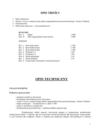 SPIS TREŚCI • • • • Opis techniczny Wypis i wyrys z miejscowego planu zagospodarowania przestrzennego Gminy Chełmża Oświadczenia Obliczenia statyczno - wytrzymałościowe RYSUNKI Rys. I. Mapa Rys. II. Plan zagospodarowania terenu 1:500 1:500 POMOST Rys. 1 Rys. 2 Rys. 3 Rys. 4 Rys. 5 Rys. 6 Rys. 7 Rys. 8 Rzut palowania Rzut belkowania Rzut deskowania Przekrój 1-1 Przekrój 2-2 Detal balustrady Detal drabinki Zestawienie elementów konstrukcyjnych 1:100 1:100 1:100 1:50 1:50 1:10 1:10 - OPIS TECHNICZNY UWAGI WSTĘPNE Podstawa opracowania - program użytkowy Inwestora - koncepcja zatwierdzona przez Inwestora - wypis i wyrys z miejscowego planu zagospodarowania przestrzennego Gminy Chełmża - mapa sytuacyjno – wysokościowa w skali 1:500 - normy i normatywy techniczne - dokumentacja geotechniczna – badania podłoża gruntowego Projektowane obiekt stanowi inwestycję mającą w zamierzeniu, podniesienie atrakcyjności plaży w Zalesiu, jak też stworzenie nowej przestrzeni dla aktywnego wypoczynku, w tym również dla wędkarzy. Plaża w Zalesiu jest miejscem chętnie odwiedzanym w okresie 1 letnim przez stale rosnącą liczbę wczasowiczów, stąd celowym jest podjęcie przedsięwzięć inwestycyjnych mających na celu podniesienie walorów wypoczynkowych tego miejsca. 1. Pomost Obiekt zlokalizowany przy nabrzeżu Jeziora Chełmżyńskiego, zaprojektowany został głównie z myślą o wypoczywających jak też wędkarzach liczne korzystają z bogatych w ryby wód Jeziora Chełmżyńskiego. Pomost składa się z dwóch ramion i kładki równoległej do nabrzeża, ukształtowanych w formie litery „H”. Jedno z ramion równoległych do brzegu jeziora zakończone jest, od strony lądu, zadaszoną wiatą przeznaczona dla wędkarzy oraz osób pragnących odpocząć niezależnie od kaprysów pogody. Pod zadaszeniem rozmieszczone są ławki. Szerokość kładek pomostu wynosi 2,4 m, natomiast w obrębie zadaszenia wynosi do 10,6m. Konstrukcja pomostu opiera się na palach stalowych, na których rozmieszczone są belki podwalinowe z drewna klejonego, do których przytwierdzone jest poszycie nawierzchni wykonanej z desek. Deski nawierzchni od belek oddziela – stanowiąc przestrzeń dystansującą drut ocynkowany o średnicy 6 mm. Zestawienie powierzchni POWIERZCHNIA POMOSTU 381 m² Opis budowlany – stan surowy Wykonawstwo - obiekt wykonany metodą tradycyjną Konstrukcja obiektu - konstrukcja stalowo-drewniana Palowanie - posadowienie stanowi układ palowania, pale φ 244,5 mm stalowe, zagłębione w gruncie co najmniej na 6,5m warstwy nośnej. Pale wbijane w grunt przy użyciu kafara . Konstrukcja pomostu - Konstrukcję pomostu stanowią: • 53 pale z rur Ø 244,5/8 mm • dźwigary z drewna warstwowo klejonego • dźwigary drewniane (nie klejone) • pokład pomostu z bali gr. 50 mm • poprzeczne stężenia podporowe • stężenia wiatrowe dźwigarów 2 2.1 Podpory palowe Pomost ze względu na złożone warunki gruntowe zaprojektowano na 53 palach – w dwóch rzędach z rur stalowych Ø 244,5 mm/8 z dnem otwartym. Głębokość wbicia rur 6,5 – 12,0 m – rzędna obcięcia pali (rur) 83,04 ( poza wiatą), 82,77 w obrębie wiaty. Rozstaw poprzeczny pali wynosi 1,8 m, a podłużny - w zależności od długości przęseł od 5 do 7,5 m. Wbite rury wypełnione zostaną po wypompowaniu wody i namułu, betonem C16/20 (B20) na głębokość ~ 2,5 m. Zwieńczenie pali stanowią głowice 0,4x0,4 m z blachy gr. 10 mm z żebrami wewnętrznymi i kotwami ze stali Ø 10 mm, które zabetonowane zostaną w palach oraz przyspawane na obwodzie do rur spoiną pachwinową a = 3 mm. Poziome stężenia poprzeczne pali zaprojektowano z dwóch ceowników 80 mm, kątowników nierównoramiennych 150x100x10 i blach węzłowych gr. 10 mm przyspawanych do głowic pali na montażu. Wykonstruowane kątowniki stanowią łoża oporowe dla dźwigarów nośnych pomostu. Pale nr 10 z 14 i 25 z 37 połączone zostaną ceownikami 80 przyspawanymi do głowic pali. Stężenia podporowe i wiatrowe oraz głowice należy wykonać w wytwórni konstrukcji stalowych. 2.2 Dźwigary nośne Dźwigary o przekroju 18x36 cm i dł. 24,0 m oraz 7,0 m zaprojektowano z drewna warstwowo klejonego. Dźwigary osadzone zostaną w łożach oporowych stężeń poprzecznych pali i skręcone śrubami budowlanymi M 16 x 240 mm. Dźwigary o długości 22,5 m stanowią belke ciągłą o rozpiętości przęseł 7,5 + 7,5 + 7,5 m w pomostach prostopadłych do brzegu a w pomoście równoległym do brzegu mają rozpiętość 21,3 m ( rozpiętość 7,1+7,1+7,1). Belki nośne na połączeniu w narożnikach pomostu zespolone są standartowymi kątownikami z przetłoczeniem na wkręty do drewna z łbem sześciokątnym M 10x60 mm. Dźwigar drewniany pośredni 10 x 19 cm, umieszczony pomiędzy dźwigarami o przekroju 18x36 cm, mocowany śrubami Ø 8 do kątowników stężeń wiatrowych. Stężenia wiatrowe - po dwa na przęsłach 7,5 i 7,1 m zaprojektowano z kątowników 80 x 80 x 8 mm i blach węzłowych gr. 10mm mocowanych na wkręty do drewna z łbem sześciokątnym M 12 x 80 mm do dźwigarów nośnych. Dźwigary nośne wykonać w zakładach specjalistycznych wytwarzających konstrukcje z drewna warstwowo klejonego wraz z impregnacją. 2.3 Pokład Pokład pomostu o szerokości 2,4 m zaprojektowano z bali sosnowych K33 o grubości 50 mm po obróbce. Bale strugane z górną powierzchnią gładką. Bale o szerokości 12 – 15 cm przybite zostaną gwoździami Ø 4,5 x 125 mm z trzpieniem skręcanym lub pierścieniowym, po dwa gwoździe na jedno złącze. Szczelina podłużna 4 – 5 mm. Bale na połączeniu w narożnikach pomostu przykryć aluminiowym teownikiem niskim 60 x 30 x 4 mm i zamocować śrubami z łbem stożkowym M 6 x 70 mm z zabezpieczeniem nakrętki przed odkręceniem. Belki nawierzchni od belek oddziela – stanowiąc przestrzeń dystansującą - drut ocynkowany o średnicy 6 mm. Bale pokładu wykonać w zakładzie specjalizują