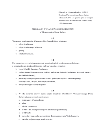 Załącznik nr 1 do zarządzenia nr 12/2015 Dyrektora Wieruszowskiego Domu Kultury z dnia 23.06.2015 r. w sprawie opłat za wynajem pomieszczeń w Wieruszowskim Domu Kultury i dzierżawy gruntu REGULAMIN WYNAJMOWANIA POMIESZCZEŃ w Wieruszowskim Domu Kultury §1 Wynajmem pomieszczeń w Wieruszowskim Domu Kultury obejmuje: 1. salę widowiskową, 2. salę widowiskową z balkonem, 3. galerię, 4. salę konferencyjną. §2 Pierwszeństwo w wynajmie pomieszczeń przysługuje niżej wymienionym podmiotom, z uwzględnieniem kolejności i terminu wpływu wniosku o wynajem: 1. Urząd Miejski, Starostwo Powiatowe, 2. gminne jednostki organizacyjne (zakłady budżetowe, jednostki budżetowe, instytucje kultury, placówki oświatowe), 3. podmioty realizujące podstawowe zadania gminy (np.: spółki z udziałem gminy), stowarzyszenia, związki, kościoły wyznaniowe, 4. firmy komercyjne i osoby fizyczne. §3 1. W celu zawarcia umowy najmu należy przedłożyć Dyrektorowi Wieruszowskiego Domu Kultury pisemny wniosek zawierający: a) pełną nazwę Wnioskodawcy b) adres, c) telefon kontaktowy, d) nr NIP – dot. osób prowadzących działalność gospodarczą, e) nr REGON, f) nazwisko i imię osoby upoważnionej do reprezentowania Wnioskodawcy, g) rodzaj wynajmowanego pomieszczenia, h) datę wynajmu z wyszczególnieniem godzin, i) cel wynajmu, j) określenie czy z obsługą techniczną czy bez obsługi. 2. Pismo, o którym mowa w ust. 1 i które jest podstawą do rezerwacji wynajmu pomieszczeń należy złożyć w Wieruszowskim Domu Kultury lub wysłać pocztą elektroniczną po uprzednim ustaleniu dostępności rezerwowanego pomieszczenia (rozmowa telefoniczna nie jest traktowana jak wniosek o wynajem i ma ona jedynie charakter sondażowy dot. terminu i kosztu wynajmu). §4 1. Umowę z Najemcą podpisuje Dyrektor WDK lub inna upoważniona przez Dyrektora osoba jako Wynajmujący - po dokonanej analizie terminu i możliwości technicznych wynajmu. 2. Umowa najmu sporządzana jest w 2 egzemplarzach i niezwłocznie przekazana Najemcy. 3. Po jej otrzymaniu Najemca powinien niezwłocznie (najpóźniej w terminie 7 dni) podpisać ją i odesłać 1egzemplarz Wynajmującemu. 4. Najemca może odstąpić od umowy najmu wyłącznie z zachowaniem formy pisemnej. Pismo w tej sprawie - wraz z uzasadnieniem - musi być dostarczone Wynajmującemu najpóźniej na 7 dni przed datą wynajmu. 5. W przypadku uiszczenia opłaty przez Najemcę i zrezygnowania z wynajmu z przyczyny leżącej po stronie Najemcy - Wynajmującemu przysługuje rekompensata w wysokości 25% wartości najmu. §5 1. Wysokość odpłatności za wynajem pomieszczeń wymienionych w § 1 reguluje zarządzenie Dyrektora WDK. 2. W uzasadnionych przypadkach Dyrektor WDK może odstąpić od pobierania opłaty za wynajem. 3. Odstąpienie od pobierania opłaty może wystąpić wyłącznie z przypadku najmu o charakterze niekomercyjnym, charytatywnym, ogólnospołecznym, kulturalnym dla mieszkańców miasta i gminy Wieruszów. Wymaga to złożenia przez zainteresowany podmiot pisemnego wniosku zawierającego uzasadnienie. a) wynajem nieodpłatny - wynajęcie pomieszczeń na imprezy non profit, kulturalne, oświatowe, charytatywne na rzecz ogółu mieszkańców miasta i gminy Wieruszów, organizowane przez uczniów szkół i przedszkoli: b) wynajem pełnopłatny - wynajęcie pomieszczeń na imprezy własne organizowane przez firmy komercyjne, instytucje różne, osoby fizyczne. 4. Wynajmujący może zażądać od Organizatora imprezy - Najemcy wpłacenia zaliczkę do kasy lub przelewem na konto bankowe w wysokości 25% określonej w umowie odpłatności za wynajem w terminie 7 dni od daty podpisania umowy. 5. W przypadku rezygnacji Najemcy z wynajmu pomieszczeń określonych w umowie – w terminie krótszym niż 7 dni od planowanej daty wykonania usługi – wpłacona zaliczka nie podlega zwrotowi. 6. Ustala się następujące grupy taryfowe: a) stawka godzinowa – stosowana jest w przypadku krótkotrwałego udostępniania pomieszczeń WDK np. na szkolenia, kursy, pokazy i kiermasze, b) taryfa dobowa – stosowana jest w przypadku odpłatnego udostępniania pomieszczeń na rzecz mieszkańców oraz osób spoza miasta i gminy Wieruszów a także na rzecz jednostek organizacyjnych Gminy, organizacji społecznych działających na terenie Gminy Wieruszów oraz sołectw i lokalnych grup działania z terenu Gminy na okres przekraczający 5 godzin 7. Doby, na które udostępnia się pomieszczenia liczy się zgodnie ze wskazaniem zegara tj. za dobę uważa się kolejne 24 godziny liczone od godz. 8:00 rano do godz. 8:00 następnego dnia. Każda rozpoczęta doba liczy się jako pełna. §6 1. Najemca korzystający z wynajmowanych pomieszczeń w Wieruszowskim Domu Kultury zobowiązany jest do: a) punktualnego rozpoczęcia i zakończenia imprezy, b) utrzymywania czystości w obiekcie, c) zabezpieczenia - we własnym zakresie - mienia wartościowego, pozostawionych rzeczy osobistych. WDK nie ponosi odpowiedzialności za straty wynikłe w tym zakresie, d) przestrzegania przepisów bhp, p.poż. i porządkowych, e) podporządkowanie się poleceniom pracowników obsługi technicznej i pracowników ochrony f) w zakresie czynności objętych umową najmu i niniejszego Regulaminu, g) ponoszenia odpowiedzialności za osoby działające w imieniu Najemcy. 2. Na terenie obiektu WDK obowiązują niżej wymienione zasady korzystania z wynajmowanych pomieszczeń: a) zakaz spożywania alkoholu (za wyjątkiem imprez okolicznościowych, np. Sylwestra, bale karnawałowe, wesela itp.), b) bezwzględny zakaz paleni papierosów na terenie obiektu, c) zakazuje się wstępu osobom w stanie wskazującym na spożycie alkoholu i znajdujących się pod wpływem środków odurzających. Osoby wymienione w tym podpunkcie nie będą wpuszczane do obiektu, d) zakazuje się wprowadzania zwierząt do wynajmowanych pomieszczeń. 3. W przypadku wynajmu szatni i jej obsługi we własnym zakresie Najemca 
