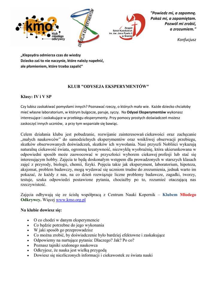 "Powiedz mi, a zapomnę. Pokaż mi, a zapamiętam. Pozwól mi zrobić, a zrozumiem." Konfucjusz „Klepsydra odmierza czas do wiedzy Dziecko zaś to nie naczynie, które należy napełnić, ale płomieniem, które trzeba zapalić” KLUB "ODYSEJA EKSPERYMENTÓW" Klasy: IV i V SP Czy lubisz zaskakiwać pomysłami innych? Poznawać rzeczy, o których mało wie. Każde dziecko chciałoby mieć własne laboratorium, w którym bulgocze, paruje, syczy. Na Odysei Eksperymentów wykonasz interesujące i zaskakujące w przebiegu eksperymenty. Przy pomocy prostych doświadczeń możesz zaskoczyć innych uczniów, a przy tym wspaniale się bawiąc. Celem działania klubu jest pobudzanie, rozwijanie zainteresowań ciekawości oraz zachęcanie „małych naukowców” do samodzielnych eksperymentów oraz wnikliwej obserwacji przebiegu, skutków obserwowanych doświadczeń, skutków ich wywołania. Nasi przyszli Nobliści wykazują naturalną ciekawość świata, ogromną kreatywność, niezwykłą wyobraźnię, która ukierunkowana w odpowiedni sposób może zaowocować w przyszłości wyborem ciekawej profesji lub stać się interesującym hobby. Zajęcia te będą doskonałym wstępem dla prowadzonych w starszych klasach zajęć z przyrody, biologii, chemii, fizyki. Pojęcia takie jak eksperyment, laboratorium, hipoteza, aksjomat, problem badawczy, mogą wydawać się uczniom trudne do zrozumienia, jednak warto im pokazać, że każdy z nas, na co dzień rozwiązuje liczne problemy badawcze, zagadki, tworzy, testuje, szuka odpowiedzi postawione pytania, chociażby po to, rozumieć otaczającą nas rzeczywistość. Zajęcia odbywają się ze ścisłą współpracą z Centrum Nauki Kopernik – Klubem Młodego Odkrywcy. Więcej www.kmo.org.pl Na klubie dowiesz się: O co chodzi w danym eksperymencie Co będzie potrzebne do jego wykonania W jaki sposób go przeprowadzisz Co można zrobić, by doświadczenie było bardziej efektowne i zaskakujące Odpowiemy na nurtujące pytania: Dlaczego? Jak? Po co? Poznasz tajniki szalonego naukowca Odkryjesz, że nauka jest wielką przygodą Dowiesz się niezliczonych informacji i ciekawostek ze świata nauki