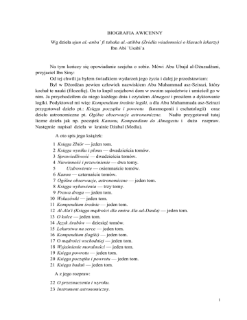 BIOGRAFIA AWICENNY Wg dzieła ujun al.-anba` fi tabaka al.-atibba (Żródła wiadomości o klasach lekarzy) Ibn Abi `Usabi`a Na tym kończy się opowiadanie szejcha o sobie. Mówi Abu Ubajd al-Dżuzadżani, przyjaciel Ibn Siny: Od tej chwili ja byłem świadkiem wydarzeń jego życia i dalej je przedstawiam: Był w Dżordżan pewien człowiek nazwiskiem Abu Muhammad asz-Szirazi, który kochał te nauki (filozofię). On to kupił szejchowi dom w swoim sąsiedztwie i umieścił go w nim. Ja przychodziłem do niego każdego dnia i czytałem Almagest i prosiłem o dyktowanie logiki. Podyktował mi więc Kompendium średnie logiki, a dla Abu Muhammada asz-Szirazi przygotował dzieło pt.: Księga początku i powrotu (kosmogonii i eschatologii) oraz dzieło astronomiczne pt. Ogólne obserwacje astronomiczne. Nadto przygotował tutaj liczne dzieła jak np. początek Kanonu, Kompendium do Almagestu i dużo rozpraw. Następnie napisał dzieła w krainie Dżabal (Media). A oto spis jego książek: 1 Księga Zbiór — jeden tom. 2 Księga wyniku i plonu — dwadzieścia tomów. 3 Sprawiedliwość — dwadzieścia tomów. 4 Niewinność i przewinienie — dwa tomy. 5 Uzdrowienie — osiemnaście tomów. 6 Kanon — czternaście tomów. 7 Ogólne obserwacje, astronomiczne — jeden tom. 8 Księga wybawienia — trzy tomy. 9 Prawa droga — jeden tom. 10 Wskazówki — jeden tom. 11 Kompendium średnie — jeden tom. 12 Al-Ala'i (Księga mądrości dla emira Ala ad-Daula) — jeden tom. 13 O kolce — jeden tom. 14 Język Arabów — dziesięć tomów. 15 Lekarstwa na serce — jeden tom. 16 Kompendium (logiki) — jeden tom. 17 O mądrości wschodniej — jeden tom. 18 Wyjaśnienie moralności — jeden tom. 19 Księga powrotu — jeden tom. 20 Księga początku i powrotu — jeden tom. 21 Księga badań — jeden tom. A z jego rozpraw: 22 O przeznaczeniu i wyroku. 23 Instrument astronomiczny. 1 24 25 26 27 28 29 30 31 32 33 34 35 36 37 38 39 40 Cel kategorii. Logika w poezji. Kasydy o wielkości i mądrości. O literach (dźwiękach). Śledzenie miejsc spornych. Kompendium do Euklidesa. Kompendium logiki (w języku perskim). Definicje. Ciała niebieskie. Wskazówki do nauki logiki. Podział nauk filozoficznych. O skończoności i nieskończoności. Żyjący syn czuwającego. O tym, że oddalanie się ciała nie należy do jego istoty. Przemówienia. O cykorii. O tym, że niemożliwym jest, aby jedna rzecz była równocześnie substancją i przypadłością (akcydensem). 41 O tym, że wiedza Zajda nie jest wiedzą Amra. I jeszcze pisał rozprawy: Ichwanija (Braterskie). Sultanija (Suttańskie). O problemach spornych, jakie wyłoniły się między nim a niektórymi uczonymi. Księga adnotacji marginesowych do Kanonu. Księga źródeł mądrości. Księga o ptaku i sidłach. Następnie przeniósł się do Rej i tam przyjął służbę u władczyni Sajjida i jej syna Madżd ad-Daula. Znali go (Ibn Sinę) z listów, które przybyły z nim razem, które zawierały określenie jego wartości. A Madżd ad-Daula cierpiał wówczas na melancholię, więc zajął się leczeniem go. Opracował tam Księgę powrotu (eschatologii). Przebywał tam do czasu przybycia władcy Szams ad-Daula po zamordowaniu Hilala Ibn Badr Hasanuje po klęsce wojsk Bagdadu. Potem zaszły wydarzenia, które spowodowały konieczność jego wywędrowania do Kazwinu, a stamtąd do Hamadanu i przyjęcia służby u Kadbanuje i zajmowania się jej sprawami. Wówczas usłyszał o nim Szams ad-Daula i sprowadził go na swój dwór, ponieważ zachorował na kolkę. Ibn Sina leczył go tak długo, aż uzdrowił go Bóg. Wycofał się ze dworu z licznymi darami i powrócił do swojego domu, przebywszy tam całe czterdzieści dni i nocy. Od tej chwili stał się jednym z bliskich zaufanych księcia. Następnie emir wyruszył do Karmisin w celu walczenia przeciw Unaz i wyruszył razem z nim szejch, który był na jego służbie. Zmuszony do ucieczki i odwrotu Szams ad-Daula powrócił do Hamadanu. Wtedy prosił Ibn Sinę, aby przyjął godność ministra, na co ten się zgodził. 2 Wkrótce jednak wybuchł przeciwko niemu bunt żołnierzy powodowanych obawą przed jego władzą. Obiegli jego dom, pochwycili go i uwięzili; splądrowali jego rzeczy i zabrali wszystko, co posiadał. Domagali się nawet od księcia wyroku śmierci na niego, lecz emir się temu sprzeciwił. Zgodził się jedynie na usunięcie go od władzy, starając się ich uspokoić. A on przez czterdzieści dni ukrywał się w domu szejcha Abu Sa'd ibn Dachduk'a. Tymczasem Szams ad-Daula ponownie zapadł na kolkę i kazał odszukać szejcha. Kiedy stawił się na jego dwór, książę bardzo go (Ibn Sinę) przepraszał. Ibn Sina zajął się leczeniem księcia i przebywał u niego wysławiany i honorowany; zaofiarowano mu po raz drugi godność ministra. Następnie ja poprosiłem go o komentarz do książek Arystotelesa, lecz on odpowiedział, że nie ma dość czasu na to. Rzekł: „Jeżeli się zgodzisz, abym opracował dzieło, w którym przytoczę wszystko, co uważam za słuszne w tych naukach bez przedyskutowania z przeciwnikami i odparcia ich zarzutów, wówczas uczynię to". Przystałem na to. Zaczął więc od części nauk przyrodniczych (fizyki) z księgi, która nazwał Księgą uzdrowienia. Opracował również pierwszą księgę Kanonu. Każdego wieczora zbierał w swoim domu uczniów. Ja czytałem urywek z Uzdrowienia, a ktoś inny na zmianę czytał z Kanonu. Kiedy kończyliśmy, wchodzili muzykanci różnego rodzaju; przygotowywano przyjęcie z winem i odpowiednią zastawą i tak zabawialiśmy się. Te dyskusje miały miejsce nocą z powodu braku wolnego czasu w ciągu dnia ze względu na służbę u księcia. W ten sposób pędziliśmy życie przez jakiś czas. Potem Szams ad-Daula skierował się do Tarim w celu prowadzenia wojny z tamtejszym emirem. I znowu powtórzył się atak kolki w pobliżu tej miejscowości i choroba ogromnie się wzmogła. Dołączyły
