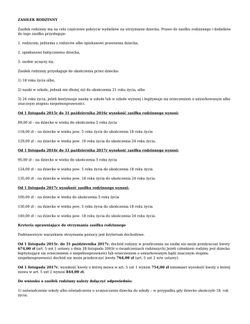 ZASIŁEK RODZINNY Zasiłek rodzinny ma na celu częściowe pokrycie wydatków na utrzymanie dziecka. Prawo do zasiłku rodzinnego i dodatków do tego zasiłku przysługuje: 1. rodzicom, jednemu z rodziców albo opiekunowi prawnemu dziecka, 2. opiekunowi faktycznemu dziecka, 3. osobie uczącej się. Zasiłek rodzinny przysługuje do ukończenia przez dziecko: 1) 18 roku życia albo, 2) nauki w szkole, jednak nie dłużej niż do ukończenia 21 roku życia, albo 3) 24 roku życia, jeżeli kontynuuje naukę w szkole lub w szkole wyższej i legitymuje się orzeczeniem o umiarkowanym albo znacznym stopniu niepełnosprawności. Od 1 listopada 2015r do 31 października 2016r wysokość zasiłku rodzinnego wynosi: 89,00 zł – na dziecko w wieku do ukończenia 5 roku życia 118,00 zł – na dziecko w wieku pow. 5 roku życia do ukończenia 18 roku życia 129,00 zł – na dziecko w wieku pow. 18 roku życia do ukończenia 24 roku życia. Od 1 listopada 2016r do 31 października 2017r wysokość zasiłku rodzinnego wynosi: 95,00 zł – na dziecko w wieku do ukończenia 5 roku życia 124,00 zł – na dziecko w wieku pow. 5 roku życia do ukończenia 18 roku życia 135,00 zł – na dziecko w wieku pow. 18 roku życia do ukończenia 24 roku życia. Od 1 listopada 2017r wysokość zasiłku rodzinnego wynosi: 100,00 zł – na dziecko w wieku do ukończenia 5 roku życia 130,00 zł – na dziecko w wieku pow. 5 roku życia do ukończenia 18 roku życia 140,00 zł – na dziecko w wieku pow. 18 roku życia do ukończenia 24 roku życia. Kryteria uprawniające do otrzymania zasiłku rodzinnego Podstawowym warunkiem otrzymania pomocy jest kryterium dochodowe. Od 1 listopada 2015r. do 31 października 2017r. dochód rodziny w przeliczeniu na osobę nie może przekraczać kwoty 674,00 zł (art. 5 ust 1 ustawy z dnia 28 listopada 2003r o świadczeniach rodzinnych) Jeżeli członkiem rodziny jest dziecko legitymujące się orzeczeniem o niepełnosprawności lub orzeczeniem o umiarkowanym bądź znacznym stopniu niepełnosprawności dochód nie może przekroczyć kwoty 764,00 zł (art. 5 ust 2 w/w ustawy). Od 1 listopada 2017r. wysokość kwoty o której mowa w art. 5 ust 1 wynosi 754,00 zł natomiast wysokość kwoty o której mowa w art. 5 ust 2 wynosi 844,00 zł. Do wniosku o zasiłek rodzinny należy dołączyć odpowiednio: 1) zaświadczenie szkoły albo oświadczenie o uczęszczaniu dziecka do szkoły – w przypadku gdy dziecko ukończyło 18. rok życia; 2) zaświadczenie szkoły wyższej albo oświadczenie o uczęszczaniu do szkoły wyższej – w przypadku osoby uczącej się lub osoby legitymującej się orzeczeniem o umiarkowanym albo znacznym stopniu niepełnosprawności, jeżeli osoba uczy się w szkole wyższej, 3) dokumenty stwierdzające wysokość dochodu rodziny, w tym odpowiednio: a) oświadczenia członków rodziny o dochodach osiągniętych w roku kalendarzowym poprzedzającym okres zasiłkowy, innych niż dochody podlegające opodatkowaniu podatkiem dochodowym od osób fizycznych, b) oświadczenia członków rodziny rozliczających się na podstawie przepisów o zryczałtowanym podatku dochodowym od niektórych przychodów osiąganych przez osoby fizyczne o dochodzie osiągniętym w roku kalendarzowym poprzedzającym okres zasiłkowy; wzór oświadczenia określa załącznik nr 5 do rozporządzenia, c) zaświadczenie właściwego organu gminy, nakaz płatniczy albo oświadczenie o wielkości gospodarstwa rolnego wyrażonej w hektarach przeliczeniowych ogólnej powierzchni w roku kalendarzowym poprzedzającym okres zasiłkowy; wzór oświadczenia określa załącznik nr 6 do rozporządzenia, d) umowę dzierżawy – w przypadku oddania części lub całości znajdującego się w posiadaniu rodziny gospodarstwa rolnego w dzierżawę, na podstawie umowy zawartej stosownie do przepisów o ubezpieczeniu społecznym rolników, albo oddania gospodarstwa rolnego w dzierżawę w związku z pobieraniem renty określonej w przepisach o wspieraniu rozwoju obszarów wiejskich ze środków pochodzących z Sekcji Gwarancji Europejskiego Funduszu Orientacji i Gwarancji Rolnej, e) umowę o wniesieniu wkładów gruntowych – w przypadku wniesienia gospodarstwa rolnego do użytkowania przez rolniczą spółdzielnię produkcyjną, f) odpis podlegającego wykonaniu orzeczenia sądu zasądzającego alimenty na rzecz osób w rodzinie lub poza rodziną lub odpis protokołu posiedzenia zawierającego treść ugody sądowej, lub odpis zatwierdzonej przez sąd ugody zawartej przed mediatorem, zobowiązujących do alimentów na rzecz osób w rodzinie lub poza rodziną, g) przekazy lub przelewy pieniężne dokumentujące wysokość zapłaconych alimentów, jeżeli członkowie rodziny są zobowiązani orzeczeniem sądu, ugodą sądową lub ugodą zawartą przed mediatorem do ich płacenia na rzecz osoby spoza rodziny, h) w przypadku gdy osoba uprawniona nie otrzymała alimentów albo otrzymała je w wysokości niższej od ustalonej w orzeczeniu sądu, ugodzie sądowej lub ugodzie zawartej przed mediatorem: – zaświadczenie organu prowadzącego postępowanie egzekucyjne o całkowitej lub częściowej bezskuteczności egzekucji alimentów, a także o wysokości wyegzekwowanych alimentów, lub – informację właściwego sądu lub właściwej instytucji o podjęciu przez osobę uprawnioną czynności związanych z wykonaniem tytułu wykonawczego za granicą albo o niepodjęciu tych czynności, w szczególności w związku z brakiem podstawy prawnej do ich podjęcia lub brakiem możliwości wskazania przez osobę uprawnioną miejsca zamieszkania dłużnika alimentacyjnego za granicą, jeżeli dłużnik zamieszkuje za granicą, i) dokument określający datę utraty dochodu oraz wysokość utraconego dochodu, j) dokument określający wysokość dochodu uzyskanego przez członka rodziny oraz liczbę miesięcy, w których dochód był osiągany – w przypadku uzyskania dochodu w roku kalendarzowym poprzedzający