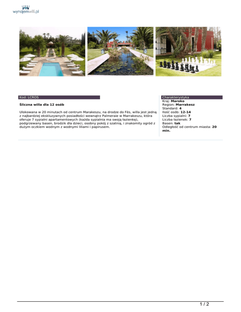 Śliczna willa dla 12 osób Ulokowana w 20 minutach od centrum Marakeszu, na drodze do Fès, willa jest jedną