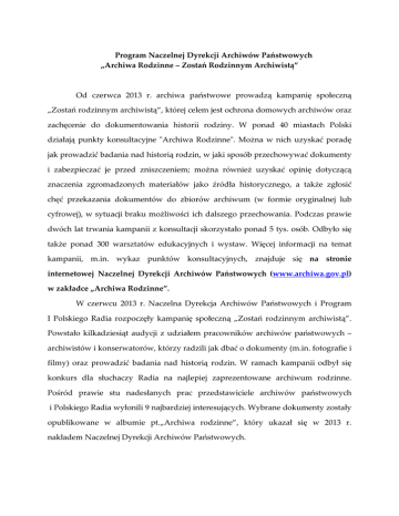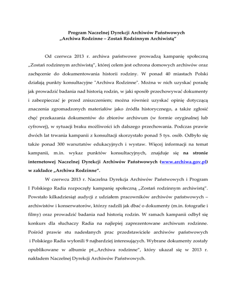 Program Naczelnej Dyrekcji Archiwów Państwowych „Archiwa Rodzinne – Zostań Rodzinnym Archiwistą” Od czerwca 2013 r. archiwa państwowe prowadzą kampanię społeczną „Zostań rodzinnym archiwistą”, której celem jest ochrona domowych archiwów oraz zachęcenie do dokumentowania historii rodziny. W ponad 40 miastach Polski działają punkty konsultacyjne "Archiwa Rodzinne". Można w nich uzyskać poradę jak prowadzić badania nad historią rodzin, w jaki sposób przechowywać dokumenty i zabezpieczać je przed zniszczeniem; można również uzyskać opinię dotyczącą znaczenia zgromadzonych materiałów jako źródła historycznego, a także zgłosić chęć przekazania dokumentów do zbiorów archiwum (w formie oryginalnej lub cyfrowej), w sytuacji braku możliwości ich dalszego przechowania. Podczas prawie dwóch lat trwania kampanii z konsultacji skorzystało ponad 5 tys. osób. Odbyło się także ponad 300 warsztatów edukacyjnych i wystaw. Więcej informacji na temat kampanii, m.in. wykaz punktów konsultacyjnych, znajduje się na stronie internetowej Naczelnej Dyrekcji Archiwów Państwowych (www.archiwa.gov.pl) w zakładce „Archiwa Rodzinne”. W czerwcu 2013 r. Naczelna Dyrekcja Archiwów Państwowych i Program I Polskiego Radia rozpoczęły kampanię społeczną „Zostań rodzinnym archiwistą”. Powstało kilkadziesiąt audycji z udziałem pracowników archiwów państwowych – archiwistów i konserwatorów, którzy radzili jak dbać o dokumenty (m.in. fotografie i filmy) oraz prowadzić badania nad historią rodzin. W ramach kampanii odbył się konkurs dla słuchaczy Radia na najlepiej zaprezentowane archiwum rodzinne. Pośród prawie stu nadesłanych prac przedstawiciele archiwów państwowych i Polskiego Radia wyłonili 9 najbardziej interesujących. Wybrane dokumenty zostały opublikowane w albumie pt.„Archiwa rodzinne”, który ukazał się w 2013 r. nakładem Naczelnej Dyrekcji Archiwów Państwowych.