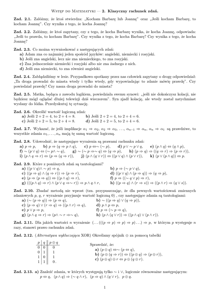 Wstęp do Matematyki — 2. Klasyczny rachunek zdań. Zad. 2.1. Załóżmy, że ktoś stwierdza: „Kocham Barbarę lub Joannę” oraz „Jeśli kocham Barbarę, to kocham Joannę”. Czy wynika z tego, że kocha Joannę? Zad. 2.2. Załóżmy, że ktoś zapytany, czy z tego, że kocha Barbarę wynika, że kocha Joannę, odpowiada: „Jeśli to prawda, to kocham Barbarę”. Czy wynika z tego, że kocha Barbarę? Czy wynika z tego, że kocha Joannę? Zad. 2.3. Co można wywnioskować z następujących zdań: a) Adam zna co najmniej jeden spośród języków: angielski, niemiecki i rosyjski. b) Jeśli zna angielski, lecz nie zna niemieckiego, to zna rosyjski. c) Zna jednocześnie niemiecki i rosyjski albo nie zna żadnego z nich. d) Jeśli zna niemiecki, to zna również angielski. Zad. 2.4. Zabłądziliśmy w lesie. Przypadkowo spotkany przez nas człowiek zapytany o drogę odpowiedział: „Ta droga prowadzi do miasta wtedy i tylko wtedy, gdy wypowiadając to zdanie mówię prawdę”. Czy powiedział prawdę? Czy nasza droga prowadzi do miasta? Zad. 2.5. Matka, będąca z zawodu logikiem, powiedziała swemu synowi: „ jeśli nie dokończysz kolacji, nie będziesz mógł oglądać dłużej telewizji dziś wieczorem”. Syn zjadł kolację, ale wtedy został natychmiast wysłany do łóżka. Przedyskutuj tę sytuację. Zad. 2.6. Określić wartość logiczną zdań: a) Jeśli 2 + 2 = 4, to 2 + 4 = 8. b) Jeśli 2 + 2 = 4, to 2 + 4 = 6. c) Jeśli 2 + 2 = 5, to 2 + 4 = 8. d) Jeśli 2 + 2 = 5, to 2 + 4 = 6. Zad. 2.7. Wykazać, że jeśli implikacje α1 ⇒ α2 , α2 ⇒ α3 , . . ., αn−1 ⇒ αn , αn ⇒ α1 są prawdziwe, to wszystkie zdania α1 , . . . , αn mają tę samą wartość logiczną. Zad. 2.8. Udowodnić, że następujące wyrażenia są prawami rachunku zdań: a) p ⇒ p, b) p ⇒ (q ⇒ p ∧ q), c) p ⇔∼ (∼ p), d) p ∨ ∼ p ∨ q, e) (p ∧ q) ⇔ (q ∧ p), f) ∼ (p ∨ q) ⇔ (∼ p∧ ∼ q), g) ∼ (∼ p ⇒∼ q) ⇔ (q ⇒ p), h) (p ⇒ q) ⇒ ((q ⇒ r) ⇒ (p ⇒ r)), i) (p ∧ q ⇒ r) ⇔ (p ⇒ (q ⇒ r)), j) (p ∧ (q ∨ r)) ⇔ ((p ∨ q) ∧ (p ∨ r)), k) (p ∨ (p ∧ q)) ⇔ p. Zad. 2.9. Które z poniższych zdań są tautologiami? a) ((p ∨ q)∧ ∼ p) ⇒ q, c) ((p ⇒ q) ∧ (q ⇒ r)) ⇒ (p ⇒ r), e) (p ⇒ (p ⇒ q)) ⇔ ((p ∧ q) ⇒ r), g) (((p ∧ q) ⇒ r) ∧ (p ∨ q ⇒∼ r)) ⇒ p ∧ q ∧ r, b) p ⇒ (∼ p ∨ q), d) ((p ∨ q) ∧ (p ⇒ q)) ⇒ (q ⇒ p), f) p ⇒ ((∼ q ∨ p) ⇒ r), h) ((p ⇒ q) ∧ (r ⇒ s)) ⇒ ((p ∧ r) ⇒ (q ∨ s)). Zad. 2.10. Zbadać metodą nie wprost (tzn. przypuszczając, że dla pewnych wartościowań zmiennych zdaniowych p, q, r wyrażenie przyjmuje wartość logiczną 0) , czy następujące zdania są tautologiami: a) (∼ (p ⇒ q)) ⇒ (p ⇒ q), b) ∼ ((p ⇒ q) ∨ (q ⇒ p)), c) (p ⇒ q) ∨ (r ⇒ q) ⇒ ((p ∧ r) ⇒ q), d) p ∧ p ⇔ p, e) p ∨ p ⇒ p, f) p ⇒ (∼ p ⇒ q), g) (p ∧ q ⇒ r) ⇒ (p∧ ∼ r ⇒∼ q), h) (p ∧ (q ∨ r)) ⇒ ((p ∧ q) ∨ (p ∧ r)). Zad. 2.11. Dla jakich wartości n wyrażenie (. . . (((p ⇒ p) ⇒ p) ⇒ p) . . .) ⇒ p, w którym p występuje n razy, stanowi prawo rachunku zdań. Zad. 2.12. (Alternatywa wykluczająca XOR) Określamy spójnik ⊕ za pomocą tabelki p 0 0 1 1 q 0 1 0 1 p⊕q 0 1 1 0. Sprawdzić, że: a) (p ⊕ q) ⇔∼ (p ⇔ q), b) (p ⊕ (q ⇒ r)) ⇔ ((p ⊕ q) ⇒ (p ⊕ r)), c) (p ⊕ q) ⊕ r ⇔ p ⊕ (q ⊕ r). Zad. 2.13. a) Znaleźć zdania, w których występują tylko ∼ i ∨, logicznie równoważne następującym: p ⇔ q, (p ∧ q) ⇒ (∼ q ∧ r), (p ⇒ q) ∧ (q ∨ r), p ⊕ q. 1 b) Pokazać, że każde zdanie zbudowane za pomocą spójników ∼, ∨, ∧, ⇒, ⇔ jest logicznie równoważne zdaniu, w którym występują tylko ∼ i ∨. c) Udowodnić, że wszystkie funktory jedno- i dwuargumentowe można zdefiniować za pomocą ∼ i ∨. Wskazówka: ` (p ⇒ q) ⇔∼ p ∨ q, ` p ∧ q ⇔∼ (∼ p∨ ∼ q), ` (p ⇒ q) ⇔ ((p ⇒ q) ∧ (q ⇒ p)) (symbol ` przed zdaniem stosujemy dla zaznaczenia, że jest ono tautologią). Zad. 2.14. Zdefiniować alternatywę przy pomocy: a) implikacji i negacji, b) koniunkcji i negacji. Zad. 2.15. Wykazać, że nie można zdefiniować: a) negacji za pomocą alternatywy, implikacji i koniunkcji, b) implikacji za pomocą alternatywy i koniunkcji, c) alternatywy za pomocą równoważności i negacji. Zad. 2.16. (Kreska Sheffera NAND) Określamy spójnik | za pomocą tabelki p 0 0 1 1 q 0 1 0 1 p|q 1 1 1 0. Sprawdzić, że: a) p|q ⇔∼ (p ∧ q), b) ∼ p ⇔ p|p, c) p ∨ q ⇔ (p|p)|(q|q). d) Za pomocą | zdefiniować ⇒ i ⊕. e) Wykazać, że wszystkie zdania logiczne zbudowane z pomocą ∼, ∧, ∨, ⇒ i ⇔ można zapisać używając wyłącznie |. Znaleźć inny funktor o takim charakterze uniwersalności. Zad. 2.17. Uzasadnić następujące reguły dowodzenia: a) (modus ponens) p ⇒ q , b) p ∨ q , c) ∼ q ⇒∼ p , p ∼p p q q q f) p ⇔ q , p⇒q g) ∼ (∼ p) , p h) p ∧ q , q d) p⇒q , p ⇒∼ q ∼p e) p ⇒ r , q⇒s p∧q r∧s i) p ⇒ (∼ p) . ∼p Zad. 2.18. Korzystając z prawdziwości wszystkich formuł postaci P ⇒ (Q ⇒ P ), (P ⇒ (Q ⇒ R)) ⇒ ((P ⇒ Q) ⇒ (P ⇒ R)), gdzie P , Q i R są dowolnymi formułami zdaniowymi oraz z reguły modus ponens udowodnić prawdziwość następujących formuł: a) p ⇒ p, b) (q ⇒ r) ⇒ ((p ⇒ q) ⇒ (p ⇒ r)). Zad. 2.19. Oto (podany przez Euklidesa) dowód nieskończoności zbioru liczb pierwszych. Przypuśćmy, że istnieje skończenie wiele liczb pierwszych. Możemy je więc kolejno wypisać: p1 = 2 < p2 = 3 < p3 = 5 < p4 = 7 < p5 = 11 < . . . < pn−1 < pn . Utwórzmy liczbę q := p1 · p2 · . . . · pn + 1. Wówczas q > pn > 1 nie dzieli się przez żadną z liczb p1 , . . . , pn . W takim razie q jest pierwsze. Ale ciąg p1 < . . . < pn zawierał wszystkie liczby pierwsze. Nasze przypuszczenie, że liczb pierwszych jest skończenie wiele doprowadziło nas do sp