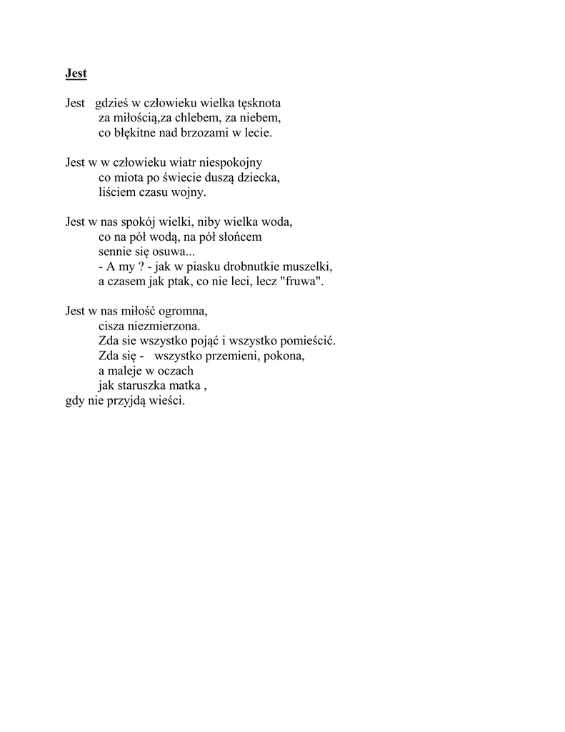 Jest Jest gdzieś w człowieku wielka tęsknota za miłością,za chlebem, za niebem, co błękitne nad brzozami w lecie. Jest w w człowieku wiatr niespokojny co miota po świecie duszą dziecka, liściem czasu wojny. Jest w nas spokój wielki, niby wielka woda, co na pół wodą, na pół słońcem sennie się osuwa... - A my ? - jak w piasku drobnutkie muszelki, a czasem jak ptak, co nie leci, lecz "fruwa". Jest w nas miłość ogromna, cisza niezmierzona. Zda sie wszystko pojąć i wszystko pomieścić. Zda się - wszystko przemieni, pokona, a maleje w oczach jak staruszka matka , gdy nie przyjdą wieści.