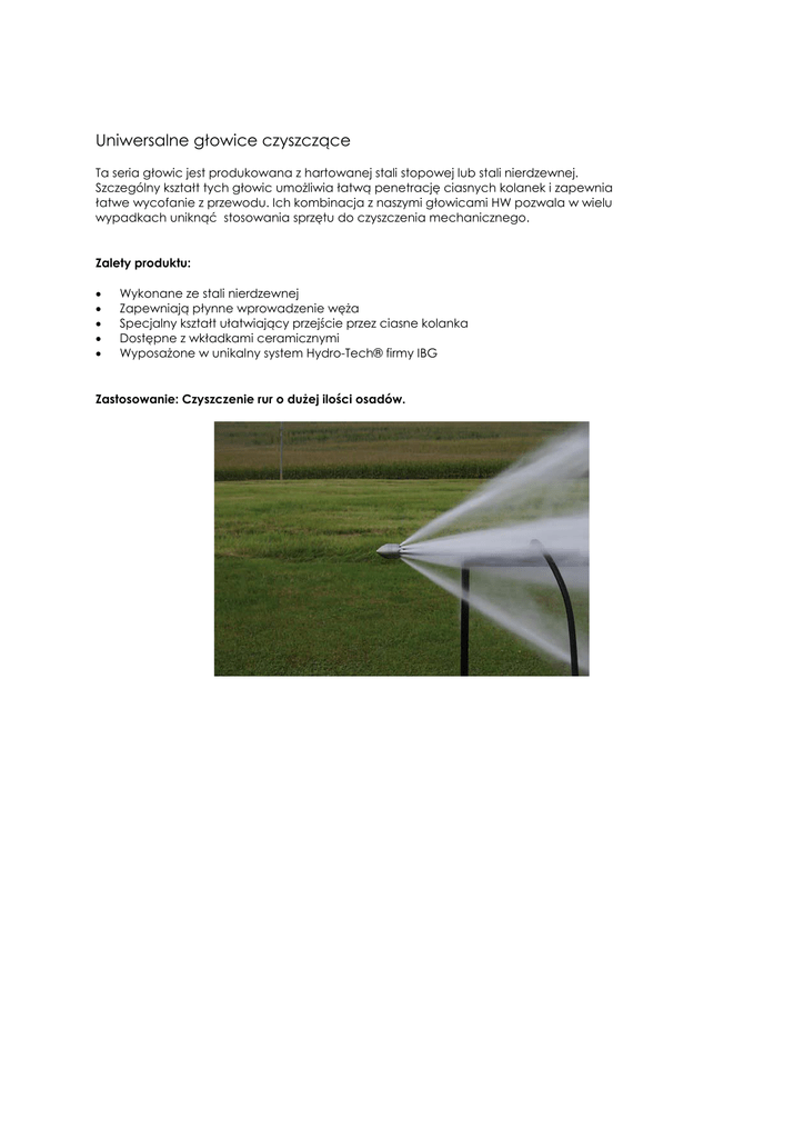 Uniwersalne głowice czyszczące Ta seria głowic jest produkowana z hartowanej stali stopowej lub stali nierdzewnej. Szczególny kształt tych głowic umożliwia łatwą penetrację ciasnych kolanek i zapewnia łatwe wycofanie z przewodu. Ich kombinacja z naszymi głowicami HW pozwala w wielu wypadkach uniknąć stosowania sprzętu do czyszczenia mechanicznego. Zalety produktu: • • • • • Wykonane ze stali nierdzewnej Zapewniają płynne wprowadzenie węża Specjalny kształt ułatwiający przejście przez ciasne kolanka Dostępne z wkładkami ceramicznymi Wyposażone w unikalny system Hydro-Tech® firmy IBG Zastosowanie: Czyszczenie rur o dużej ilości osadów. Dracula Głowica dostarczana wyłącznie z podłączeniem do węża 1". Przeznaczona do stosowania w przewodach rurowych od DN150 do DN300. Jej połączenie z głowicami HW pozwala często uniknąć stosowania sprzętu do mechanicznego czyszczenia. Przyłącze Zakres pracy DN [mm] Wydatek wody [l/min] Dysze przednie Dysze tylne] Przedni kąt strumienia Tylny kąt strumienia Wymiary [mm] Waga [kg] Nr katalogowy Oznaczenie 1" 1 1/4" 100-400 100-600 >200 >200 0/1 x M10 0/1 x M10 8/12 x M10 x 1 | 1/4“ 8/12 x M10 x 1 | 1/4“ 0° 0° 25°/33° 25°/33° L 140 / ø 87 L 140 / ø 87 4 4 01 02 01 01 6 YY WW 01 02 01 01 7 YY WW XX – liczba dysz tylnych, YY- kąt strumienia Favorit Głowica dostarczana wyłącznie z podłączeniem do węża 1". Przeznaczona do stosowania w przewodach rurowych od DN150 do DN300. Jej połączenie z głowicami HW pozwala często uniknąć stosowania sprzętu do mechanicznego czyszczenia. Przyłącze Zakres pracy DN [mm] Wydatek wody [l/min] Dysze przednie Dysze tylne] Przedni kąt strumienia Tylny kąt strumienia Wymiary [mm] Waga [kg] Nr katalogowy Oznaczenie 1" 100 - 400 >120 0/1 x M10 8 x M10 x 1 | 1/4“ 0° 25°/33° L 140 / ø 78 3 01 03 01 01 6 YY WW XX – liczba dysz tylnych, YY- kąt strumienia Enorm Głowica dostarczana wyłącznie z podłączeniem do węża 3/4". Przeznaczona do stosowania w przewodach rurowych od DN75 do DN250. "Enorm" nazywana jest dzieckiem w serii uniwersalnych głowic czyszczących. Posiada wszystkie zalety tej serii a jednocześnie nadaje się do rur o małych średnicach. Przyłącze Zakres pracy DN [mm] Wydatek wody [l/min] 3/4" 100 - 300 >100 Dysze przednie 0/1 x M10 Dysze tylne 6 x M10 x 1 Przedni kąt strumienia 0° Tylny kąt strumienia 20°/25°/30° Wymiary [mm] L 130 / ø 67 Waga [kg] Nr katalogowy Oznaczenie 1,9 01 04 01 01 5 06 WW XX – liczba dysz tylnych, YY- kąt strumienia Gigant Przyłącze Zakres pracy DN [mm] 100 - 250 Wydatek wody [l/min] 40 - 120 Dysze przednie Dysze tylne Przedni kąt strumienia 0/1 x M10 4/5/6 x M10 x 1 0° Tylny kąt strumienia 20°/25°/30° Wymiary [mm] L 110 / ø 57 Waga [kg] Nr katalogowy Oznaczenie 1/2’’ ca. 1,3 01 05 01 01 4 YY WW XX – liczba dysz tylnych, YY- kąt strumienia