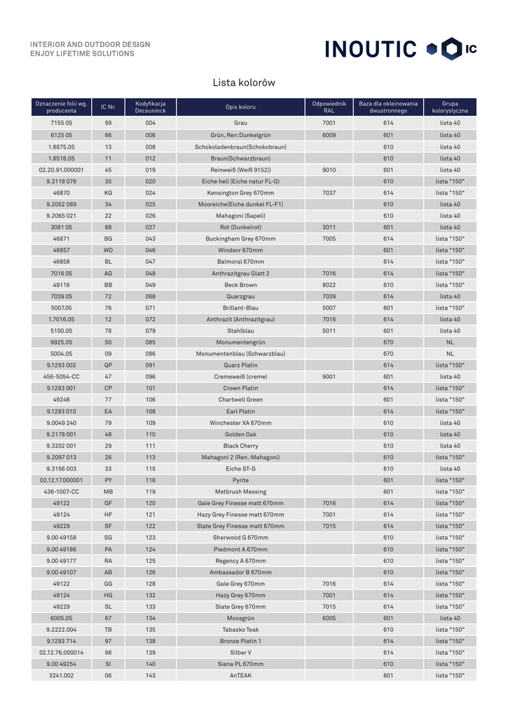 Lista kolorów Oznaczenie folii wg. producenta IC Nr. Kodyfikacja Deceuninck Opis koloru Odpowiednik RAL Baza dla okleinowania dwustronnego Grupa kolorystyczna 7155 05 99 004 Grau 7001 614 lista 40 6009 601 lista 40 610 lista 40 610 lista 40 6125 05 66 006 Grün, Ren:Dunkelgrün 1.8875.05 13 008 Schokoladenbraun(Schokobraun) 1.8518.05 11 012 Braun(Schwarzbraun) 02.20.91.000001 45 019 Reinweiß (Weiß 9152)) 9.3118 076 35 020 Eiche hell (Eiche natur FL-G) 9010 7037 601 lista 40 610 lista "150" 46870 KG 024 Kensington Grey 670mm 614 lista "150" 9.2052 089 34 025 Mooreiche(Eiche dunkel FL-F1) 610 lista 40 9.2065 021 22 026 Mahagoni (Sapeli) 610 lista 40 3081 05 88 027 Rot (Dunkelrot) 3011 601 lista 40 46871 BG 043 Buckingham Grey 670mm 7005 614 lista "150" 46857 WD 046 Windsor 670mm 601 lista "150" 46858 BL 047 Balmoral 670mm 614 lista "150" 7016 05 AG 048 Anthrazitgrau Glatt 2 7016 614 lista "150" lista "150" 49116 BB 049 Beck Brown 8022 610 7039 05 72 068 Quarzgrau 7039 614 lista 40 5007.05 76 071 Brillant-Blau 5007 601 lista "150" 1.7016.05 12 072 Anthrazit (Anthrazitgrau) 7016 614 lista 40 5150.05 78 079 Stahlblau 5011 601 lista 40 9925.05 50 085 Monumentengrün 670 NL 5004.05 09 086 Monumentenblau (Schwarzblau) 670 NL 9.1293 002 QP 091 Quarz Platin 614 lista "150" 456-5054-CC 47 096 Cremeweiß (creme) 601 lista 40 9.1293 001 CP 101 Crown Platin 614 lista "150" 49246 77 106 Chartwell Green 601 lista "150" 9001 9.1293 010 EA 108 Earl Platin 614 lista "150" 9.0049 240 79 109 Winchester XA 670mm 610 lista 40 9.2178 001 48 110 Golden Oak 610 lista 40 9.3202 001 29 111 Black Cherry 610 lista 40 9.2097 013 26 113 Mahagoni 2 (Ren.:Mahagoni) 610 lista "150" 9.3156 003 33 115 Eiche ST-G 610 lista 40 02.12.17.000001 PY 116 Pyrite 601 lista "150" 436-1007-CC MB 119 Metbrush Messing 601 lista "150" 49122 GF 120 Gale Grey Finesse matt 670mm 7016 614 lista "150" 49124 HF 121 Hazy Grey Finesse matt 670mm 7001 614 lista "150" 49229 SF 122 Slate Grey Finesse matt 670mm 7015 614 lista "150" 9.00 49158 SG 123 Sherwood G 670mm 610 lista "150" 9.00 49186 PA 124 Piedmont A 670mm 610 lista "150" 9.00 49177 RA 125 Regency A 670mm 610 lista "150" 9.00 49107 AB 126 Ambassador B 670mm 610 lista "150" 49122 GG 128 Gale Grey 670mm 7016 614 lista "150" 49124 HG 132 Hazy Grey 670mm 7001 614 lista "150" 49229 SL 133 Slate Grey 670mm 7015 614 lista "150" 6005.05 67 134 Moosgrün 6005 601 lista 40 9.2222.004 TB 135 Tabasko Teak 610 lista "150" 9.1293 714 97 138 Bronze Platin 1 614 lista "150" 02.12.76.000014 98 139 Silber V 614 lista "150" 9.00 49254 SI 140 Siena PL 670mm 610 lista "150" 3241.002 06 143 AnTEAK 601 lista "150" Lista kolorów 9.3162 002 25 144 Macoré 610 lista 40 9.3211 005 80 9.3214 007 81 145 Irish Oak 610 lista 40 146 Rustic Cherry 610 436-7047-CC lista 40 QG 147 quarzgrau SFTN 7039 614 lista "150" 436-5013-CC RR 148 rubinrot 3011 601 lista "150" 436-5006-CC ST 150 stahlblau 5011 601 lista "150" 9.2178 007 21 154 Nussbaum V 610 lista 40 436-5021-CC TG 155 tannengruen 6009 601 lista "150" 436-5010-CC SC 164 schwarzbraun 8022 610 lista "150" 436-3086 OG 180 Sheffield Oak grey 601 lista "150" 436-3087 OB 181 Sheffield Oak brown 610 lista "150" 436-1012 AA 182 Alux Anthrazit 614 lista "150" 436-1014 27 183 Alux DB 703 614 lista 40 436-1016 36 184 Alux graualuminium 9007 614 lista "150" 436-1017 44 185 Alux steingrau 7030 614 lista "150" 436-1015 53 186 Alux weissaluminium 9006 614 lista "150" 436-1013 74 187 Alux silbergrau 7001 614 lista "150" 9.3152 009 24 402 Kirsch-Douglasie(Streifen-Douglasie) 610 lista 40 7016 9.00 49252 WX 413 Winchester XC 670mm 610 lista "150" 436-5003-CC AN 415 anthrazitgrau 7016 614 lista "150" 436-5049-CC SR 417 silbergrau 7001 614 lista "150" 436-2009-CC OP 421 Oregon Pine natur 610 lista "150" 9.2052 090 32 423 Eiche natur (Eiche hell) 610 lista "150" 436-1004-CC MP 436 Metbrush platin 614 lista "150" 436-2032-CC KP 437 Kirsch Piemont 610 lista "150" 436-2001-CC MC 438 Macoree 610 lista "150" 436-2002-CC SA 439 Sapeli 610 lista "150" 436-2060-CC SO 441 Sipo 610 lista "150" 436-2012-CC CE 442 Colmar Eiche sepia 610 lista "150" 9.3202.701 CB 445 Black Cherry 610 lista "150" 9.2178 707 NB 446 Nussbaum V (Walnut V) 610 lista "150" 436-2007-CC ME 447 Montana Eiche tabak 610 lista "150" 436-2048-CC SM 448 Staufereiche mocca 610 lista "150" 9.00 49 233 10 451 Siena PR 670mm 610 lista "150" 9.00 49201 SW 455 Sherwood W 670mm 610 lista "150" 436-2035-CC SE 460 Staufereiche terra 610 lista "150" 436-2036-CC SK 461 Staufereiche kolonial 610 lista "150" 436-3054-CC TS 462 Teak silver grey 614 lista "150" 436-3051-CC TR 463 Teak terra 610 lista "150" 436-3052-CC TA 464 Teak arte 610 lista "150" 436-3041-CC SN 465 Noce Sorrento natur 610 lista "150" 436-3078-CC AE 466 Asteiche natur 610 lista "150" 436-3077-CC OK 467 Newcastle Oak khaki 610 lista "150" 436-3063-CC WR 468 Walnuss rehbraun 610 lista "150" 436-3062-CC WK 469 Walnuss kolonial 610 lista "150" 436-3064-CC WC 600 Walnuss curcuma 610 lista "150" 1.7016.05 15 603 Anthrazit (Anthrazitgrau) 614 lista "150" 7016 9.00 49195 19 605 Toscana (Shogun AD) 670mm 610 lista 40 436-1006-CC MA 608 Metbrush anthrazitgrau 614 lista "150" 436-1005-CC 436-5020-CC MQ PG 613 615 Metbrush quarzgrau Pastellgrün 614 601 lista lista "150" "150" 6021 Lista kolorów 9.3167 004 42 616 Eiche Dunkel (Ren:Mooreiche ST-F) 610 lista "150" 9.3149 008 39 622 Eiche Rustikal (Eiche Rustikal 1) 610 lista "150" 9.1192 001 43 623 Oregon 4 610 lista 40 9.2178 701 51 624 Golden Oak 610 lista "150" 7004 05 92 625 Signalgrau 7004 614 lista 40 436-7048-CC 08 628 Basaltgrau 7012 614 lista 40 436-1010-CC MS 629 Metbrush Schoko 8017 610 lista "150" 436-1009-CC MM 634 Metbrush mocca 614 lista "150" 9.00 49197 17 637 Sierra (Shogun AC) 670mm 610 lista "150" 9.00 49198 18 638 Nevada (Shogun AF) 670mm 610 lista 40 9.3069 041 41 640 Bergkiefer 610 lista 40 3005 05 84 644 Weinrot 3005 601 lista 40 02.12.51.000004 71 645 Dunkelblau 5030 5005 601 lista "150" 614 lista 40 614 lista "1