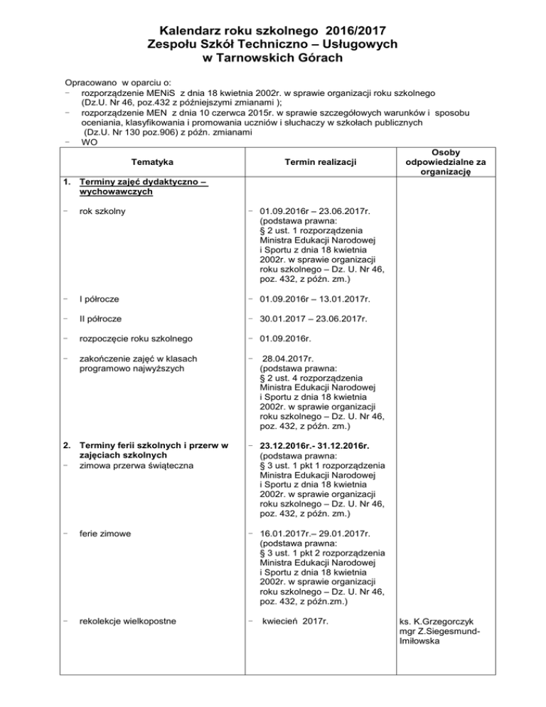 Kalendarz roku szkolnego 2016/2017 Zespołu Szkół Techniczno – Usługowych w Tarnowskich Górach Opracowano w oparciu o: - rozporządzenie MENiS z dnia 18 kwietnia 2002r. w sprawie organizacji roku szkolnego (Dz.U. Nr 46, poz.432 z późniejszymi zmianami ); - rozporządzenie MEN z dnia 10 czerwca 2015r. w sprawie szczegółowych warunków i sposobu oceniania, klasyfikowania i promowania uczniów i słuchaczy w szkołach publicznych (Dz.U. Nr 130 poz.906) z późn. zmianami - WO Osoby Tematyka Termin realizacji odpowiedzialne za organizację 1. Terminy zajęć dydaktyczno – wychowawczych - rok szkolny - 01.09.2016r – 23.06.2017r. (podstawa prawna: § 2 ust. 1 rozporządzenia Ministra Edukacji Narodowej i Sportu z dnia 18 kwietnia 2002r. w sprawie organizacji roku szkolnego – Dz. U. Nr 46, poz. 432, z późn. zm.) - I półrocze - 01.09.2016r – 13.01.2017r. - II półrocze - 30.01.2017 – 23.06.2017r. - rozpoczęcie roku szkolnego - 01.09.2016r. - zakończenie zajęć w klasach programowo najwyższych - 28.04.2017r. (podstawa prawna: § 2 ust. 4 rozporządzenia Ministra Edukacji Narodowej i Sportu z dnia 18 kwietnia 2002r. w sprawie organizacji roku szkolnego – Dz. U. Nr 46, poz. 432, z późn. zm.) 2. Terminy ferii szkolnych i przerw w zajęciach szkolnych - zimowa przerwa świąteczna - 23.12.2016r.- 31.12.2016r. (podstawa prawna: § 3 ust. 1 pkt 1 rozporządzenia Ministra Edukacji Narodowej i Sportu z dnia 18 kwietnia 2002r. w sprawie organizacji roku szkolnego – Dz. U. Nr 46, poz. 432, z późn. zm.) - ferie zimowe - 16.01.2017r.– 29.01.2017r. (podstawa prawna: § 3 ust. 1 pkt 2 rozporządzenia Ministra Edukacji Narodowej i Sportu z dnia 18 kwietnia 2002r. w sprawie organizacji roku szkolnego – Dz. U. Nr 46, poz. 432, z późn.zm.) - rekolekcje wielkopostne - kwiecień 2017r. ks. K.Grzegorczyk mgr Z.SiegesmundImiłowska Tematyka Termin realizacji - wiosenna przerwa świąteczna - 13.04.2017r. –18.04.2017r. (podstawa prawna: § 3 ust. 1 pkt 3 rozporządzenia Ministra Edukacji Narodowej i Sportu z dnia 18 kwietnia 2002r. w sprawie organizacji roku szkolnego – Dz. U. Nr 46, poz. 432, z późn. zm.) - dni wolne od zajęć dydaktycznowychowawczych - czas pisemnej części egzaminu maturalnego 04.05.17 05.05.17 08.05.17 oraz egzaminu potwierdzającego kwalifikacje w zawodzie dla uczniów Technikum - ferie letnie - 26.06.2017r.-31.08.17r. (podstawa prawna: § 3 ust. 1 pkt 4 rozporządzenia Ministra Edukacji Narodowej i Sportu z dnia 18 kwietnia 2002r. w sprawie organizacji roku szkolnego – Dz. U. Nr 46, poz. 432, z późn. zm.) Osoby odpowiedzialne za organizację 3. Terminy egzaminów szkolnych - egzaminy maturalne część pisemna - część ustna - egzaminy potwierdzające kwalifikacje w zawodzie IVE – technik logistyk / technik transportu kolejowego - etap pisemny - etap praktyczny - 04.05.17 - 05.05.17 - 08.05.17 - od 04.05.17 - 26.05.17r. (podstawa prawna: art. 9a ust.2.pkt.10 lit. a tiret pierwsze ustawy z dnia 7 września 1991r.o systemie oświaty – Dz.U. z 2004r. Nr 256, poz.2572 j.t., z późn. zmi.) wg ustaleń CKE (podstawa prawna: art. 9a ust.2.pkt.10 lit. a tiret pierwsze ustawy z dnia 7 września 1991r.o systemie oświaty – Dz.U. z 2004r. Nr 256, poz.2572 j.t., z późn. .zm.) 4. Terminy praktyk zawodowych - III d technik logistyk / technik transportu kolejowego Dyrektor Szkoły maj 2017. 5. Terminy rad pedagogicznych - plenarne posiedzenie Rady Pedagogicznej rozpoczynającej rok szkolny 29.08.2016r. godz. 10 00 Dyrektor Szkoły Tematyka Termin realizacji Osoby odpowiedzialne za organizację - konferencja Rady Pedagogicznej 15.09.2016r. (zatwierdzenie Planu Nadzoru Pedagogicznego) Dyrektor Szkoły - konferencje szkoleniowe Aktualne akty prawne Dyrektor Szkoły. - konferencja klasyfikacyjna za I półrocze i podsumowująca I półrocze 12.01.2017r. Dyrektor Szkoły - konferencja klasyfikacyjna klas maturalnych 25.04.2017r. Dyrektor Szkoły - konferencja klasyfikacyjna końcowo- roczna 19.06.2017r. Dyrektor Szkoły - plenarne posiedzenie Rady Pedagogicznej podsumowujące rok szkolny 2016/2017 26.06.2017r. godz.10.00 6. Spotkanie Dyrekcji Szkoły z innymi organami szkoły - Samorządem Szkolnym X, XI, III,V - Radą Rodziców IX, X, XII, II, V - PCK, Klub Wolontariuszy wg potrzeb - młodzieżą twórczą, wyróżniającą się w nauce i zachowaniu I, VI - młodzieżą trudną w nauce i zachowaniu XI, IV, VI 7. Apele szkolne - porządkowe wg. potrzeb - okolicznościowe wg. potrzeb - podsumowanie pracy dydaktyczno – wychowawczej: za I półrocze wg potrzeb Dyrektor Szkoły 8. Wywiadówki śródroczne - rodziców uczniów wszystkich klas - 15.09.2016r. Wychowawcy - rodziców uczniów wszystkich klas - 20.10.2016r. Wychowawcy - informacja o zagrożeniach i proponowanych ocenach - 15.12.2016r. Wychowawcy - spotkanie z rodzicami śródroczne - 31.03.2017r. Wychowawcy - rodziców uczniów klas maturalnych – informacja o zagrożeniach - 31.03.2017r. Wychowawcy - rodziców wszystkich klas – informacja o zagrożeniach 25.05.2017r. Wychowawcy Tematyka Termin realizacji Osoby odpowiedzialne za organizację 9. Uroczystości szkolne i uczniowskie - uroczyste rozpoczęcie roku szkolnego 2016/2017 - 01.09.2016r. Dyrektor Szkoły - uroczysta akademia z okazji Dnia Edukacji Narodowej - 11.10.2016r. Wychowawcy klas maturalnych: mgr A.Łągiewka mgr M.Bambynek mgr J.Gulba-Wysocka mgr S.Jarząbek oraz Samorząd Szkolny - uroczysta akademia w rocznicę nadania szkole imienia Jana Pawła II połączona ze ślubowaniem uczniów klas pierwszych - 12.10.2016r. Wychowawcy klas pierwszych oraz ks. Krzysztof Grzegorczyk mgr S.Grzesiakowski - akademia w 98 rocznicę odzyskania niepodległości przez Polskę - 10.11.2016r. mgr Sebastian Jarząbek mgr Karina Słota - uroczyste spotkanie świąteczno – wigilijne w klasach - 22.12.2016r. wychowawcy klas - uroczyste spotkanie noworoczne Rady Pedagogicznej i Pracowników Szkoły, Emerytów oraz Rady Rodziców - 13.01.2017r. -