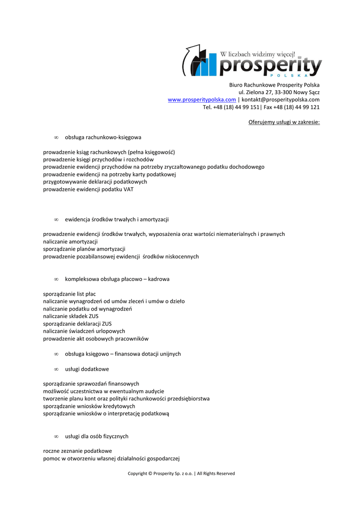 Biuro Rachunkowe Prosperity Polska ul. Zielona 27, 33-300 Nowy Sącz www.prosperitypolska.com | [email protected] Tel. +48 (18) 44 99 151| Fax +48 (18) 44 99 121 Oferujemy usługi w zakresie: • obsługa rachunkowo-księgowa prowadzenie ksiąg rachunkowych (pełna księgowość) prowadzenie księgi przychodów i rozchodów prowadzenie ewidencji przychodów na potrzeby zryczałtowanego podatku dochodowego prowadzenie ewidencji na potrzeby karty podatkowej przygotowywanie deklaracji podatkowych prowadzenie ewidencji podatku VAT • ewidencja środków trwałych i amortyzacji prowadzenie ewidencji środków trwałych, wyposażenia oraz wartości niematerialnych i prawnych naliczanie amortyzacji sporządzanie planów amortyzacji prowadzenie pozabilansowej ewidencji środków niskocennych • kompleksowa obsługa płacowo – kadrowa sporządzanie list płac naliczanie wynagrodzeń od umów zleceń i umów o dzieło naliczanie podatku od wynagrodzeń naliczanie składek ZUS sporządzanie deklaracji ZUS naliczanie świadczeń urlopowych prowadzenie akt osobowych pracowników • obsługa księgowo – finansowa dotacji unijnych • usługi dodatkowe sporządzanie sprawozdań finansowych możliwość uczestnictwa w ewentualnym audycie tworzenie planu kont oraz polityki rachunkowości przedsiębiorstwa sporządzanie wniosków kredytowych sporządzanie wniosków o interpretację podatkową • usługi dla osób fizycznych roczne zeznanie podatkowe pomoc w otworzeniu własnej działalności gospodarczej Copyright © Prosperity Sp. z o.o. | All Rights Reserved