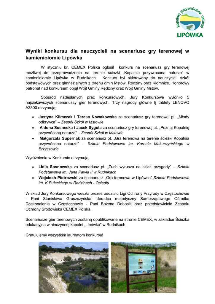 Wyniki konkursu dla nauczycieli na scenariusz gry terenowej w kamieniołomie Lipówka W styczniu br. CEMEX Polska ogłosił konkurs na scenariusz gry terenowej możliwej do przeprowadzenia na terenie ścieżki „Kopalnia przywrócona naturze” w kamieniołomie Lipówka w Rudnikach. Konkurs był skierowany do nauczycieli szkół podstawowych oraz gimnazjalnych z terenu gmin Mstów, Rędziny oraz Kłomnice. Honorowy patronat nad konkursem objął Wójt Gminy Rędziny oraz Wójt Gminy Mstów. Spośród nadesłanych prac konkursowych, Jury Konkursowe wyłoniło 5 najciekawszych scenariuszy gier terenowych. Trzy nagrody główne tj tablety LENOVO A3300 otrzymują: Justyna Klimczak i Teresa Nowakowska za scenariusz gry terenowej pt. „Młody odkrywca” – Zespół Szkół w Mstowie Aldona Sosnecka i Jacek Syguła za scenariusz gry terenowej pt. „Poznaj Kopalnię przywróconą naturze” – Zespół Szkół w Mstowie Małgorzata Supernak za scenariusz pt. „Gra terenowa na terenie ścieżki Kopalnia przywrócona naturze” – Szkoła Podstawowa im. Kornela Makuszyńskiego w Brzyszowie Wyróżnienia w Konkursie otrzymują: Lidia Sosnowska za scenariusz pt. „Zuch wyrusza na szlak przygody” – Szkoła Podstawowa im. Jana Pawła II w Rudnikach Wojciech Piotrowski za scenariusz „Gra terenowa w Lipówce” Szkoła Podstawowa im. K.Pułaskiego w Rędzinach - Osiedlu W skład Jury Konkursowego weszła prezes oddziału Ligi Ochrony Przyrody w Częstochowie - Pani Stanisława Gruszczyńska, doradca metodyczny Samorządowego Ośrodka Doskonalenia w Częstochowie - Pani Bożena Dobosik oraz przedstawiciele Zespołu Ochrony Środowiska CEMEX Polska. Scenariusze gier terenowych zostaną opublikowane na stronie CEMEX, w zakładce Ścieżka edukacyjna w nieczynnej kopalni „Lipówka” w Rudnikach. Gratulujemy wszystkim laureatom konkursu! Konkurs był objęty honorowym patronatem Wójta Gminy Rędziny, Pana Pawła Militowskiego oraz Wójta Gminy Mstów, Pana Tomasza Gęsiarza.