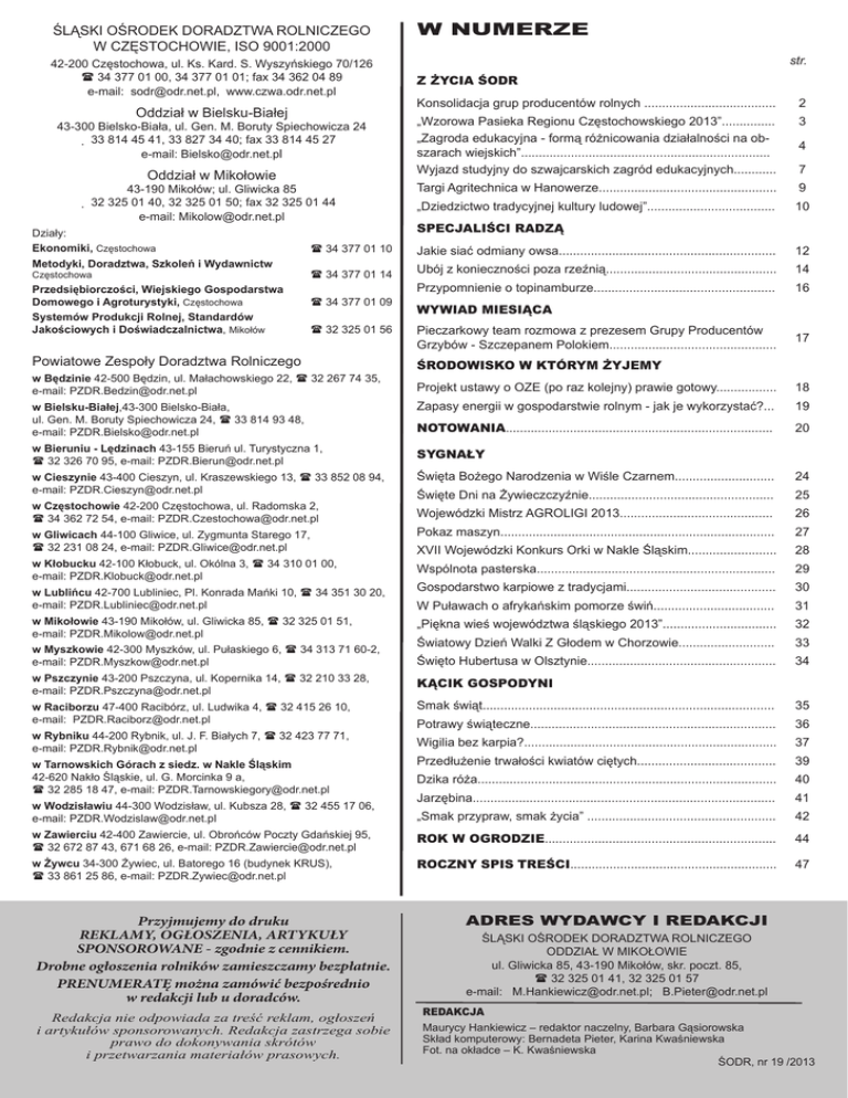 ŚLĄSKI OŚRODEK DORADZTWA ROLNICZEGO W CZĘSTOCHOWIE, ISO 9001:2000 42-200 Częstochowa, ul. Ks. Kard. S. Wyszyńskiego 70/126 34 377 01 00, 34 377 01 01; fax 34 362 04 89 e-mail: [email protected], www.czwa.odr.net.pl Oddział w Bielsku-Białej 43-300 Bielsko-Biała, ul. Gen. M. Boruty Spiechowicza 24 33 814 45 41, 33 827 34 40; fax 33 814 45 27 e-mail: [email protected] Oddział w Mikołowie 43-190 Mikołów; ul. Gliwicka 85 32 325 01 40, 32 325 01 50; fax 32 325 01 44 e-mail: [email protected] Działy: Ekonomiki, Częstochowa Metodyki, Doradztwa, Szkoleń i Wydawnictw Częstochowa Przedsiębiorczości, Wiejskiego Gospodarstwa Domowego i Agroturystyki, Częstochowa Systemów Produkcji Rolnej, Standardów Jakościowych i Doświadczalnictwa, Mikołów w numerze str. Z Życia ŚODR Konsolidacja grup producentów rolnych ..................................... 2 „Wzorowa Pasieka Regionu Częstochowskiego 2013”............... „Zagroda edukacyjna - formą różnicowania działalności na obszarach wiejskich”...................................................................... Wyjazd studyjny do szwajcarskich zagród edukacyjnych............ 3 Targi Agritechnica w Hanowerze.................................................. 9 „Dziedzictwo tradycyjnej kultury ludowej”.................................... 10 4 7 SPECJALIŚCI RADZĄ 34 377 01 10 Jakie siać odmiany owsa............................................................. 12 34 377 01 14 Ubój z konieczności poza rzeźnią................................................ 14 Przypomnienie o topinamburze................................................... 16 34 377 01 09 32 325 01 56 Powiatowe Zespoły Doradztwa Rolniczego w Będzinie 42-500 Będzin, ul. Małachowskiego 22, 32 267 74 35, e-mail: [email protected] w Bielsku-Białej,43-300 Bielsko-Biała, ul. Gen. M. Boruty Spiechowicza 24, 33 814 93 48, e-mail: [email protected] wywiad miesiąca Pieczarkowy team rozmowa z prezesem Grupy Producentów Grzybów - Szczepanem Polokiem............................................... 17 środowisko w którym żyjemy Projekt ustawy o OZE (po raz kolejny) prawie gotowy................. 18 Zapasy energii w gospodarstwie rolnym - jak je wykorzystać?... 19 NOTOWANIA........................................................................... 20 w Bieruniu - Lędzinach 43-155 Bieruń ul. Turystyczna 1, 32 326 70 95, e-mail: [email protected] Sygnały w Cieszynie 43-400 Cieszyn, ul. Kraszewskiego 13, 33 852 08 94, e-mail: [email protected] Święta Bożego Narodzenia w Wiśle Czarnem............................ 24 Święte Dni na Żywieczczyźnie.................................................... 25 Wojewódzki Mistrz AGROLIGI 2013........................................... 26 Pokaz maszyn............................................................................. 27 Xvii Wojewódzki Konkurs Orki w Nakle Śląskim......................... 28 Wspólnota pasterska................................................................... 29 Gospodarstwo karpiowe z tradycjami.......................................... 30 W Puławach o afrykańskim pomorze świń.................................. 31 w Mikołowie 43-190 Mikołów, ul. Gliwicka 85, 32 325 01 51, e-mail: [email protected] „Piękna wieś województwa śląskiego 2013”................................ 32 w Myszkowie 42-300 Myszków, ul. Pułaskiego 6, 34 313 71 60-2, e-mail: [email protected] Światowy Dzień Walki Z Głodem w Chorzowie........................... 33 Święto Hubertusa w Olsztynie..................................................... 34 w Częstochowie 42-200 Częstochowa, ul. Radomska 2, 34 362 72 54, e-mail: [email protected] w Gliwicach 44-100 Gliwice, ul. Zygmunta Starego 17, 32 231 08 24, e-mail: [email protected] w Kłobucku 42-100 Kłobuck, ul. Okólna 3, 34 310 01 00, e-mail: [email protected] w Lublińcu 42-700 Lubliniec, Pl. Konrada Mańki 10, 34 351 30 20, e-mail: [email protected] w Pszczynie 43-200 Pszczyna, ul. Kopernika 14, 32 210 33 28, e-mail: [email protected] w Raciborzu 47-400 Racibórz, ul. Ludwika 4, 32 415 26 10, e-mail: [email protected] w Rybniku 44-200 Rybnik, ul. J. F. Białych 7, 32 423 77 71, e-mail: [email protected] w Tarnowskich Górach z siedz. w Nakle Śląskim 42-620 Nakło Śląskie, ul. G. Morcinka 9 a, 32 285 18 47, e-mail: [email protected] w Wodzisławiu 44-300 Wodzisław, ul. Kubsza 28, 32 455 17 06, e-mail: [email protected] Kącik gospodyni Smak świąt.................................................................................. 35 Potrawy świąteczne..................................................................... 36 Wigilia bez karpia?....................................................................... 37 Przedłużenie trwałości kwiatów ciętych....................................... 39 Dzika róża.................................................................................... 40 Jarzębina..................................................................................... 41 „Smak przypraw, smak życia” ..................................................... 42 w Zawierciu 42-400 Zawiercie, ul. Obrońców Poczty Gdańskiej 95, 32 672 87 43, 671 68 26, e-mail: [email protected] ROK W OGRODZIE................................................................. 44 w Żywcu 34-300 Żywiec, ul. Batorego 16 (budynek KRUS), 33 861 25 86, e-mail: [email protected] ROCZNY SPIS TREŚCI.......................................................... 47 Przyjmujemy do druku REKLAMY, OGŁOSZENIA, ARTYKUŁY SPONSOROWANE - zgodnie z cennikiem. Drobne ogłoszenia rolników zamieszczamy bezpłatnie. PRENUMERATĘ można zamówić bezpośrednio w redakcji lub u doradców. Redakcja nie odpowiada za treść reklam, ogłoszeń i artykułów sponsorowanych. Redakcja zastrzega sobie prawo do dokonywania skrótów i przetwarzania materiałów prasowych. ADRES WYDAWCY I REDAKCJI ŚLĄSKI OŚRODEK DORADZTWA ROLNICZEGO ODDZIAŁ W MIKOŁOWIE ul.