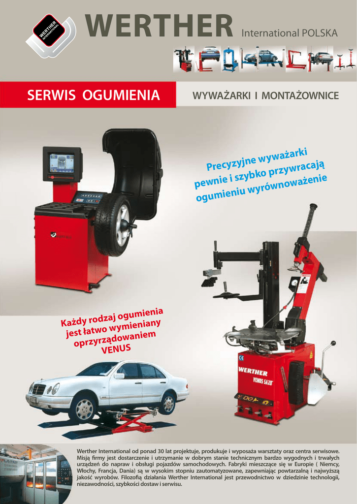 WERTHER SERWIS OGUMIENIA International POLSKA WYWAŻARKI I MONTAŻOWNICE żarki a w y w jne cają a r Precyzy w y z r bko p y z s i e i enie ż a w o pewn n wyrów u i n e i ogum umienia g o j a z d o Każdy r eniany i m y w o jest łatw aniem w o d ą z r y oprz VENUS Werther International od ponad 30 lat projektuje, produkuje i wyposaża warsztaty oraz centra serwisowe. Misją firmy jest dostarczenie i utrzymanie w dobrym stanie technicznym bardzo wygodnych i trwałych urządzeń do napraw i obsługi pojazdów samochodowych. Fabryki mieszczące się w Europie ( Niemcy, Włochy, Francja, Dania) są w wysokim stopniu zautomatyzowane, zapewniając powtarzalną i najwyższą jakość wyrobów. Filozofią działania Werther International jest przewodnictwo w dziedzinie technologii, niezawodności, szybkości dostaw i serwisu. WYWAŻARKI PULSAR H Wyważarka mikroprocesorowa, profesjonalna, z kolorowym monitorem do kół samochodów osobowych, dostawczych i motocykli. pulpit sterowniczy wyposażony jest w przyciski przemysłowe. dokładność pomiaru wynosi 0,5 grama. posiada wbudowane oprogramowanie: autokalibracji, procedury pomiarowe statyczną, dynamiczną, programy ALU i ALU-S, SPLIT (ukrycia ciężarka) oraz optymalizacji położenia opony względem obręczy. przymiar automatycznie rejestruje wymiary obręczy i pozwala na wskazanie miejsca mocowania ciężarków. dostępna jest pamięć nastaw dla czterech rodzajów kół. Opcje wykonania: SONAR automatyczny pomiar szerokości obręczy HP - pneumatyczny uchwyt koła VEGA Wyważarka mikroprocesorowa, profesjonalna do kół samochodów osobowych, dostawczych i motocykli. pulpit sterowniczy wyposażony jest w wyświetlacze LED oraz przyciski przemysłowe. pomiar parametrów koła ułatwia wysuwany przymiar, który również wyznacza miejsce mocowania ciężarka. dokładność pomiaru wynosi 1 gram. posiada wbudowane oprogramowanie: autokalibracji, procedury pomiarowe statyczną, dynamiczną, programy ALU i ALU-S, SPLIT (ukrycia ciężarka) oraz optymalizacji położenia opony względem obręczy. Wyważarka została zaprojektowana jako wyposażenie serwisów specjalizujących się w ogumieniu Opcje wykonania: VEGA PRO przymiar doposażony w automatyczny pomiar średnicy i odległości obręczy DANE TECHNICZNE VEGA PULSAR ALTAIR · średnica obręczy 10’’ - 24’’ 10’’ - 24’’ 8’’ - 26’’ · szerokość obręczy 1.5 - 20’’ 1.5 - 20’’ do 16’’ · max zew. średnica koła 870 mm 870 mm 870 mm · max szerokość koła 430 mm 430 mm 400 mm · max ciężar koła 65 kg 65 kg 65 kg · prędkość obrotowa 100 obr/min 180 obr/min 98 obr/min · czas cyklu 8 sek 6 sek 4 - 16 sek · dokładność 1g 1g 1g · zasilanie 230 V/ 500 W 230 V/ 300 W 230 V/ 300 W · masa własna 130 kg 130 kg 62 kg · temperatura pracy 0 - 50 st. C - 10 - 50 st. C - 10 - 50 st. C · wymiary 1200x1400x1660 1300x1500x1330 940x570x1120 WYPOSAŻENIE DODATKOWE Dysk G36 Stożek VL OPCJA OPCJA UH20/2 adapter do obręczy RM15/20 adapter motocyklowy z 3-4-5 otworami ALTAIR Wyważarka została zaprojektowana jako wyposażenie dodatkowe serwisów świadczących szereg różnych usług motoryzacyjnych. pulpit sterowniczy wyposażony jest w wyświetlacze LED oraz przyciski przemysłowe. pomiar parametrów koła ułatwia wysuwany przymiar, który również wyznacza miejsce mocowania ciężarka. dokładność pomiaru wynosi 1 gram. Posiada wbudowane oprogramowanie: autokalibracji, procedury pomiarowe statyczną, dynamiczną. programy ALU i ALU-S, SPLIT (ukrycia ciężarka) oraz optymalizacji położenia opony względem obręczy. Venus 20 SA MONTAŻOWNICE Venus 20 SA 2VIT Assistant montażownica automatyczna, wraz z zestawem ułatwiającym pracę z ogumieniem niskoprofilowym i typu RUN FLAT Assistant 3 lewe ramię pomocnicze z talerzem podważającym oraz klockiem dociskowym Assistant 4 prawe ramię pomocnicze z talerzem podważającym oraz obrotową rolką dociskającą Dane Techniczne: profesjonalna montażownica automatyczna zaprojektowana do ciągłej ciężkiej pracy. Występuje w następujących odmianach: IT inflator w uchwytach szczęk do szybkiego pompowania wstępnego 2V dwie prędkości obrotowe stołu Assistant - specjalne oprzyżądowanie sterowane pneumatycznie pozwala na bezpieczne stosowanie znacznych sił przy zakładaniu i demontażu opon. kolumna robocza odchylana pneumatycznie średnica obręczy - uchwyt wewnętrzny: 13”-23” średnica obręczy - uchwyt zewnętrzny: 10”-20” szerokość obręczy - do 12” średnica koła - do 1060 mm moc silnika: 0,75 kW zasilanie elektryczne: 400V/50Hz 3 fazy poziom hałasu (A) - do 70 dB zasilanie pneumatyczne: 8-12 bar siła nacisku odrywacza: 2500 kg masa własna: 360 kg wymiary: 1250x1100x1910 mm / w pozycji złożonej Hydra 18 montażownica półautomatyczna, ramię robocze jest umocowane obrotowo i posiada blokadę położenia. Wyposażenie standardowe stanowią: regulator ciśnienia powietrza, naolejacz powietrza, pistolet do pompowania z manometrem, łyżka do opon. Montażownica została zaprojektowana i jest produkowana jako wyposażenie uniwersalnego serwisu samochodowego, gdzie usługi związane z ogumieniem stanowią jedną z dziedzin działalności. Dane Techniczne: obrotowe ramię robocze średnica obręczy - uchwyt wewnętrzny: 12”-21” średnica obręczy - uchwyt zewnętrzny: 10”-18” szerokość obręczy - do 12” średnica koła - do 960 mm moc silnika: 0,75 kW zasilanie elektryczne: 400V/50Hz 3 fazy poziom hałasu (A) - do 70 dB zasilanie pneumatyczne: 8-12 bar siła nacisku odrywacza: 2500 kg masa własna: 190 kg wymiary: 795x965x1815 mm Opcje: VENUS 18 wersja wzmocniona przeznaczona do intensywnej pracy w serwisach specjalizujących się w ogumieniu VENUS 18 IT wersja wzmocniona z inflatorem w uchwytach obręczy Stopa robocza jest zaopatrzona w osłony z tworzywa sztucznego aby chronić powierzchnię obręczy. Typoszereg VENUS charakteryzuje się trwałością i pewności