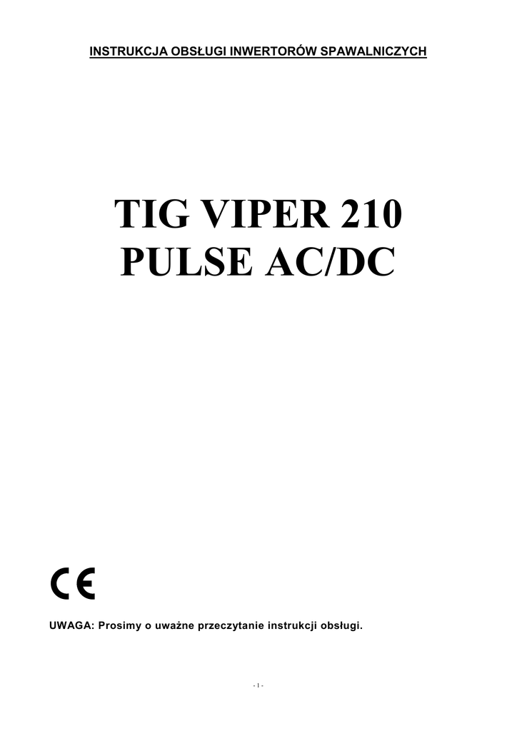 INSTRUKCJA OBSŁUGI INWERTORÓW SPAWALNICZYCH TIG VIPER 210 PULSE AC/DC UWAGA: Prosimy o uważne przeczytanie instrukcji obsługi. -1- Zawartość 1. UWAGI OGÓLNE ............................................................................................................................... 3 2. OGÓLNA CHARAKTERYSTYKA .................................................................................................... 3 3. DANE TECHNICZNE ......................................................................................................................... 4 4. PRZÓD I TYŁ URZĄDZENIA ........................................................................................................... 4 5. OPIS PANELU STEROWANIA I FUNKCJI TIG VIPER 210 PULSE AC/DC ................................ 5 5.1 WYKRES PRZEBIEGU PROCESU SPAWANIA DLA METODY TIG - CZTEROTAKT 4T ...... 7 5.2 WYKRES PRZEBIEGU PROCESU SPAWANIA DLA METODY TIG – DWUTAKT 2T ........... 8 6. PRZYGOTOWANIE DO PRACY ....................................................................................................... 8 6.1 PODŁĄCZENIE DO SIECI ............................................................................................................... 9 6.2 ŁĄCZENIE PRZEWODÓW SPAWALNICZYCH W METODZIE MMA ...................................... 9 7. USTAWIANIE URZĄDZENIA - SPAWANIE METODĄ MMA...................................................... 9 8. SPAWANIE METODĄ TIG HF ........................................................................................................ 10 9. KONSERWACJA............................................................................................................................... 11 10. FUNKCJE DODATKOWE .............................................................................................................. 11 11. PRZYGOTOWANIE KRAWĘDZI PRZED SPAWANIEM ........................................................... 12 12. ZAKŁÓCENIA W PRACY SPAWARKI ........................................................................................ 14 13. BEZPIECZEŃSTWO UŻYTKOWANIA ........................................................................................ 15 -2- 1. UWAGI OGÓLNE Uruchomienia, instalacji i eksploatacji inwertorów spawalniczych, można dokonać tylko po dokładnym zapoznaniu się z niniejszą instrukcją obsługi. Nieprzestrzeganie zaleceń zawartych w tej instrukcji może narazić użytkownika na poważne obrażenia ciała, śmierć lub uszkodzenia samego urządzenia. Nie można dopuszczać dzieci w pobliże miejsca pracy urządzenia. Osoby z wszczepionym rozrusznikiem serca zanim podejmą pracę z tym urządzeniem, powinny skonsultować się ze swoim lekarzem. Obsługa serwisowa i naprawy tych urządzeń mogą być prowadzone przez wykwalifikowany personel, z zachowaniem warunków bezpieczeństwa pracy obowiązujących dla urządzeń elektrycznych. Przeróbki we własnym zakresie mogą spowodować zmianę cech użytkowych urządzeń lub pogorszenie parametrów spawalniczych. Wszelkie przeróbki urządzeń, we własnym zakresie, powodują nie tylko utratę gwarancji, ale mogą być przyczyną pogorszenia się warunków bezpieczeństwa użytkowania i narażenia użytkownika na niebezpieczeństwo porażenia prądem. Niewłaściwe warunki pracy mogą spowodować uszkodzenia urządzenia, a jego niewłaściwa obsługa, powoduje utratę gwarancji. UWAGA: Urządzenie oparte na podzespołach elektronicznych. Szlifowanie i cięcie metali itp. w pobliżu spawarki może powodować zanieczyszczenie opiłkami wnętrza urządzenia, doprowadzając tym samym do jego uszkodzenia. Wyżej wymienione uszkodzenie nie podlega naprawie gwarancyjnej! W przypadku konieczności pracy w takim środowisku, należy dokonywać czyszczenia urządzenia przez przedmuchanie wnętrza spawarki sprężonym powietrzem. INFORMACJE DOTYCZĄCE USUWANIA ZUŻYTEGO SPRZĘTU ELEKTRYCZNEGO I ELEKTRONICZNEGO Powyższy znak umieszczony na urządzeniu informuje, że jest to sprzęt elektryczny lub elektroniczny, którego po zużyciu nie wolno umieszczać z innymi odpadami. Zużyty sprzęt elektryczny i elektroniczny zawiera substancje szkodliwe dla środowiska naturalnego. Nie wolno takiego sprzętu składować na wysypiskach śmieci, musi zostać on poddany recyklingowi. Informacje na temat systemu zbiórki zużytego sprzętu elektrycznego i elektronicznego można uzyskać w punkcie sprzedaży urządzeń, oraz u producenta lub importera. Zakaz umieszczania wraz z innymi odpadami zużytego sprzętu elektrycznego i elektronicznego narzuca na użytkownika dyrektywa europejska 2007/96/WE. 2. OGÓLNA CHARAKTERYSTYKA Urządzenie inwerterowe TIG VIPER 210 PULSE AC/DC oparte jest na najnowszej, najbardziej zaawansowanej technologii. Urządzenie wyposażone jest w „miękki” przejrzysty panel umożliwiający ustawienie wszystkich niezbędnych funkcji spawalniczych (prąd startu/wypełnienia krateru/spawania/bazy, czasy narastania i opadania prądu, wypływ gazu przed i po spawaniu, częstotliwość pulsu, balans, hot start, arc force, itd.). TIG VIPER 210 PULSE AC/DC zapewnia doskonałą wydajność w spawaniu aluminium i jego stopów, stali węglowej, stali nierdzewnej, tytanu itp. -3- 3. DANE TECHNICZNE Model TIG VIPER 210 PULSE AC/DC Parametry Zasilanie 230[V]/50[Hz] Napięcie biegu jałowego [V] 62 Zabezpieczenie [A] 25 Pobór mocy [kVA] 6,8 TIG Zakres regulacji prądu spawania [A] Zakres regulacji czasu narastania i opadania prądu [s] Regulacja wypływu gazu przed spawaniem [s] Regulacja wypływu gazu po spawaniu [s] MMA AC DC DC 10÷210 5÷210 10÷160 Sprawność (40 °C/10 minut.) 0÷10 — 0.1÷10 — 0÷25 — 210 [A]/35% 160 [A]/35% 430×208×410 Wymiary spawarki [mm] Waga [kg] 17 4. PRZÓD I TYŁ URZĄDZENIA Rys.1 1. Włącznik główny. 2. Wejście kabla zasilającego 230 [V]. 3. Gniazdo wlotowe do podłączenia gazu ochronnego. -4- 4. Gniazdo sterowania. 5. Gniazdo wyjściowe gazu ochronnego. 6. 
