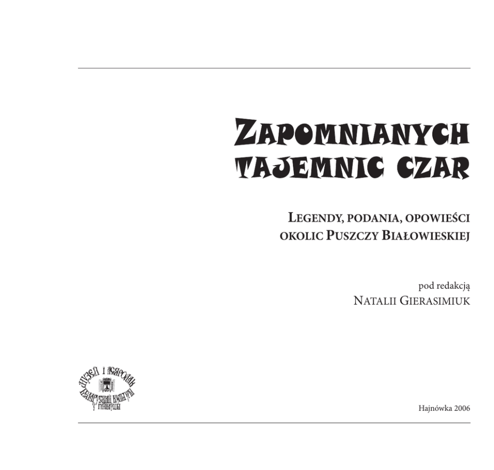 LEGENDY, PODANIA, OPOWIEŚCI OKOLIC PUSZCZY BIAŁOWIESKIEJ pod redakcją NATALII GIERASIMIUK Hajnówka 2006 1 Niniejsza publikacja jest podsumowaniem projektu „Zapomnianych tajemnic czar”, realizowanego przez Stowarzyszenie Muzeum i Ośrodek Kultury Białoruskiej w Hajnówce. Projekt był realizowany pod patronatem Euroregionu Puszcza Białowieska przy współfinansowaniu Unii Europejskiej. MUZEUM I OŚRODEK KULTURY BIAŁORUSKIEJ W HAJNÓWCE instytucja kulturalno-oświatowa, zajmująca się tworzeniem i propagowaniem szeroko pojętej kultury. ul. 3 Maja 42; 17-200 Hajnówka tel. 085 6822889; fax: 085 6823016 e-mail: [email protected]; [email protected] www.belmuzeum.fm.interia.pl Redaktor: Projekt okładki: Korektor: Tłumaczenie: Ilustracje: Opracowanie: Skład: Druk i oprawa: 2 Natalia Gierasimiuk Natalia Gierasimiuk Danuta Samerek Maria Bołtromiuk Agnieszka Tichoniuk Agencja Wydawniczo-Edytorska EkoPress A. Poskrobko Artur Sadurski Drukarnia MKJ Spis treści Przedmowa (N. Gierasimiuk) ..................................................................................................................... Legenda o Puszczy Białowieskiej ............................................................................................................. Trzewiczek Wenery ................................................................................................................................... Skąd Porozowo ........................................................................................................................................... Świsłocz ....................................................................................................................................................... Róża w kolorze słonecznych promieni (I. Maslanicyna) ........................................................................ Rużany (T. Ławrenczuk) .............................................................................................................................. Odkupienie (I. Maslanicyna) ...................................................................................................................... Wieś Woroniłowcy .................................................................................................................................... Potomek (I. Maslanicyna) ........................................................................................................................... Ostrów Wiecza (I. Maslanicyna) ................................................................................................................ Legenda o mieście Prużany i rzece Muchawiec (M. Zielankowa) ......................................................... Wędrówka królowej (I. Maslanicyna) ....................................................................................................... Kobiecy sąd (I. Maslanicyna) ..................................................................................................................... Prużany ....................................................................................................................................................... Niedokończony kościół (I. Maslanicyna) ................................................................................................. „Święty” Szeresz (I. Maslanicyna) .............................................................................................................. Matka Boska obrończyni (G. Musiewicz) ................................................................................................. Budowały wieżę wielkoludy? (G. Musiewicz) ........................................................................................... Legenda o Kamieńcu (A. Nienadawiec) .................................................................................................... Szubienica (G. Musiewicz) .......................................................................................................................... Nazwa od wilków (G. Musiewicz) .............................................................................................................. Zniknięcie cerkwi (G. Musiewicz) ............................................................................................................. Muryny (G. Musiewicz) .............................................................................................................................. Świniowo (G. Musiewicz) ........................................................................................................................... Biazdonnik (G. Musiewicz) ........................................................................................................................ Gruszka (A. Trofimiuk) ............................................................................................................................... Legenda o miasteczku Wysokie (W. Mironau) ........................................................................................ Mnich (N. Gierasimiuk) .............................................................................................................................. 3 O sile nieczystej (T. Kuczko) ...................................................................................................................... Topola obrończyni (T. Kuczko) ................................................................................................................. Panikwy (G. Musiewicz) .............................................................................................................................. Przeklęcie (T. Kuczko) ................................................................................................................................ Ślad Matki Boskiej (N. Sidoruk) ................................................................................................................ Odwieczna miedza .......................................