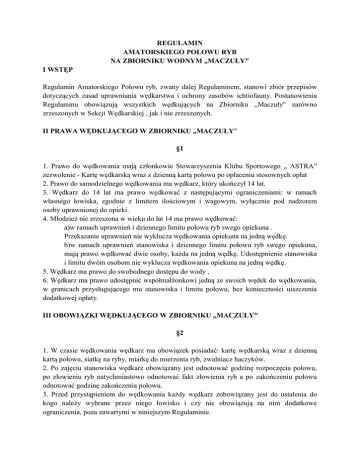REGULAMIN AMATORSKIEGO POŁOWU RYB NA ZBIORNIKU WODNYM „MACZUŁY" I WSTĘP Regulamin Amatorskiego Połowu ryb, zwany dalej Regulaminem, stanowi zbiór przepisów dotyczących zasad uprawniania wędkarstwa i ochrony zasobów ichtiofauny. Postanowienia Regulaminu obowiązują wszystkich wędkujących na Zbiorniku „Maczuły" zarówno zrzeszonych w Sekcji Wędkarskiej , jak i nie zrzeszonych. II PRAWA WĘDKUJĄCEGO W ZBIORNIKU „MACZUŁY" §1 1. Prawo do wędkowania mają członkowie Stowarzyszenia Klubu Sportowego „ ASTRA” zezwolenie - Kartę wędkarską wraz z dzienną kartą połowu po opłaceniu stosownych opłat 2. Prawo do samodzielnego wędkowania ma wędkarz, który ukończył 14 lat. 3. Wędkarz do 14 lat ma prawo wędkować z następującymi ograniczeniami: w ramach własnego łowiska, zgodnie z limitem ilościowym i wagowym, wyłącznie pod nadzorem osoby uprawnionej do opieki. 4. Młodzież nie zrzeszona w wieku do lat 14 ma prawo wędkować: a)w ramach uprawnień i dziennego limitu połowu ryb swego opiekuna . Przekazanie uprawnień nie wyklucza wędkowania opiekuna na jedną wędkę. b)w ramach uprawnień stanowiska i dziennego limitu połowu ryb swego opiekuna, mają prawo wędkować dwie osoby, każda na jedną wędkę. Udostępnienie stanowiska i limitu dwóm osobom nie wyklucza wędkowania opiekuna na jedną wędkę. 5. Wędkarz ma prawo do swobodnego dostępu do wody , 6. Wędkarz ma prawo udostępnić współmałżonkowi jedną ze swoich wędek do wędkowania, w granicach przysługującego mu stanowiska i limitu połowu, bez konieczności uiszczenia dodatkowej opłaty. III OBOWIĄZKI WĘDKUJĄCEGO W ZBIORNIKU „MACZUŁY" §2 1. W czasie wędkowania wędkarz ma obowiązek posiadać: kartę wędkarską wraz z dzienną kartą połowu, siatkę na ryby, miarkę do mierzenia ryb, zwalniacz haczyków. 2. Po zajęciu stanowiska wędkarz obowiązany jest odnotować godzinę rozpoczęcia połowu, po złowieniu ryb natychmiastowo odnotować fakt złowienia ryb a po zakończeniu połowu odnotować godzinę zakończenia połowu. 3. Przed przystąpieniem do wędkowania każdy wędkarz zobowiązany jest do ustalenia do kogo należy wybrane przez niego łowisko i czy nie obowiązują na nim dodatkowe ograniczenia, poza zawartymi w niniejszym Regulaminie. 4. Przy wyborze i zajmowaniu miejsca na łowisku pierwszeństwo ma ten wędkarz, który przybył na nie wcześniej. Przy zajmowaniu stanowisk wędkujący powinni zachować między sobą odstępy określone w §§ 4, 5 Regulaminu. Odstępy te mogą być zmniejszone tylko za zgodą wędkarza, który wcześniej zajął dane stanowisko. 5. W czasie wędkowania wędki muszą być pod stałym nadzorem ich właściciela. 6. Ryby z haczyka należy uwalniać z zachowaniem maksymalnej ostrożności. 7. Wędkarz zobowiązany jest utrzymać w czystości stanowisko wędkarskie w promieniu minimum 10 metrów, bez względu na stan, jaki zastał przed rozpoczęciem połowu. 8. Obowiązkiem wędkarza jest opuszczenie łowiska, jeśli rozgrywane mają być na nim zawody sportowe. Organizator zawodów musi posiadać pisemne zezwolenie Wójta Gminy Leśniowice. 9. W przypadku zauważenia zanieczyszczenia wody lub jego skutków, jak np. śnięte ryby, zmiana koloru wody, plamy olejowe, nienaturalny zapach, wędkarz ma obowiązek natychmiast zawiadomić o tym Stowarzyszenie Klubu Sportowego „ ASTRA”, policję albo najbliższy organ administracji publicznej. 10. Zabrania się parkowania pojazdów mechanicznych wzdłuż drogi przebiegającej przy grobli zbiornika. IV ZASADY WĘDKOWANIA §3 1. Wędka Wędkarz ma obowiązek posługiwać się wędką składającą się z wędziska o długości co najmniej 30 cm, do którego przymocowana jest linka zakończona: a) jednym haczykiem z przynętą, albo b) nie więcej niż dwoma haczykami, każdy ze sztuczną przynętą imitującą owada lub jego stadia rozwojowe, przy czym każdy haczyk może mieć nie więcej niż dwa ostrza rozstawione w taki sposób, aby nie wykraczały one poza obwód koła o średnicy 30 mm c) sztuczną przynętą wyposażoną w nie więcej niż trzy haczyki; haczyk może mieć nie więcej niż cztery ostrza, rozstawione w taki sposób, aby nie wykraczały poza obwód koła o średnicy 30 mm, 2. Przynęty a) Jako przynęty mogą być stosowane: -przynęty naturalne: zwierzęce i roślinne, -przynęty sztuczne. b) Zabrania się stosować jako przynęt /zanęt/: - zwierząt i roślin chronionych, - ikry rybiej. c) Przynęty naturalne zwierzęce to organizmy żywe lub martwe, a także ich części. W przypadku stosowania jako przynęt martwych ryb, mogą być użyte tylko ryby wymiarowe lub nie objęte wymiarem ochronnym oraz nie znajdujące się w okresie ochronnym. d) Przynęty naturalne roślinne to rośliny, ich części oraz przetwory z nich np. ciasta i pasty. Do przynęt tych umownie zalicza się też sery. e) Przynęty sztuczne to grupa przynęt wykonanych z różnych materiałów naturalnych lub sztucznych. Przynęty te mogą być uzbrojone najwyżej w trzy haczyki o rozstawie ostrzy nie większym niż szerokość przynęty sztucznej /z tolerancją do 2 mm/. f) Sztuczne muchy to grupa przynęt sztucznych wykonywanych na haczyku z jednym lub dwoma ostrzami, w dowolnej kombinacji co najmniej dwóch materiałów. 3.Wędkowanie 3.1. W wodach Zbiornika „ Maczuły" można wędkować z brzegu od strony rzeki ( od szlabanu do szlabanu) 3.2. Zabrania się łowić ryb w ustalonych dla nich okresach i miejscach ochronnych, takich jak: tarliska, w tym krześliska. 3.3. Wędkarz ma obowiązek przestrzegać limitów dziennych połowów ryb. 3.4. Ponadto wędkarzowi nie wolno: a) przechowywać i zabierać ryb poniżej ich wymiarów ochronnych, b) sprzedawać złowionych ryb, c) rozdawać złowionych ryb na terenie łowiska, d) łowić ryb w odległości mniejszej niż 10 m od: przepływki oraz innych urządzeń służących do piętrzenia wody. e) łowić metodą "szarpaka", f ) posiadać 