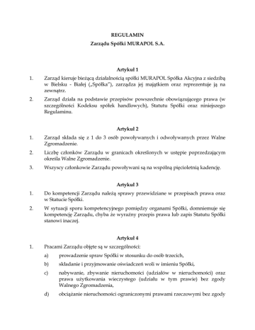 REGULAMIN Zarządu Spółki MURAPOL S.A. Artykuł 1 1. Zarząd