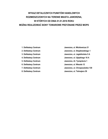 WYKAZ DETALICZNYCH PUNKTÓW HANDLOWYCH ROZMIESZCZONYCH NA TERENIE MIASTA JAWORZNA, W KTÓRYCH OD DNIA 01.01.2016 ROKU MOŻNA REALIZOWAĆ BONY TOWAROWE PRZYZNANE PRZEZ MOPS 1. Delikatesy Centrum Jaworzno, ul. Mickiewicza 21 2. Delikatesy Centrum Jaworzno, ul. Stojałowskiego 1 3. Delikatesy Centrum Jaworzno, ul. Jagiellońska 5 A 4. Delikatesy Centrum Jaworzno, ul. Ujejskiego 16 A 5. Delikatesy Centrum Jaworzno, Al. Tysiąclecia 1 6. Delikatesy Centrum Jaworzno, ul. Wesoła 12 7. Delikatesy Centrum Jaworzno, ul. Chropaczówka 130 8. Delikatesy Centrum Jaworzno, ul. Tetmajera 39