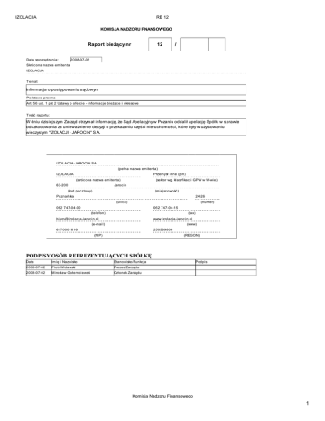 IZOLACJA RB 12 KOMISJA NADZORU FINANSOWEGO Raport bieŜący nr 12 / 2008-07-02 Data sporządzenia: Skrócona nazwa emitenta IZOLACJA Temat Informacja o postępowaniu sądowym Podstawa prawna Art. 56 ust. 1 pkt 2 Ustawy o ofercie - informacje bieŜące i okresowe Treść raportu: W dniu dzisiejszym Zarząd otrzymał informację, Ŝe Sąd Apelacyjny w Pozaniu oddalił apelację Spółki w sprawie odszkodowania za uniewaŜnienie decyzji o przekazaniu części nieruchomości, które były w uŜytkowaniu wieczystym "IZOLACJI - JAROCIN" S.A. IZOLACJA-JAROCIN SA (pełna nazwa emitenta) IZOLACJA Przemysł inne (pin) (skróc ona nazwa emitenta) 63-200 (sektor wg. klasyfikacji GPW w W-wie) Jarocin (kod pocztowy) (miejscowość) Poznańska 24-26 (ulica) (numer) 062 747-04-00 062 747-04-15 (telefon) (fax) biuro@izolac ja-jaroc in.pl www.izolac ja-jaroc in.pl (e-mail) (www) 6170001616 250569806 (NIP) (REGON) PODPISY OSÓB REPREZENTUJĄCYCH SPÓŁKĘ Data Imię i Nazwisko Stanowisko/Funkc ja 2008-07-02 Piotr Widawski Prezes Zarządu 2008-07-02 Mirosław Gołembiewski Członek Zarządu Podpis Komisja Nadzoru Finansowego 1