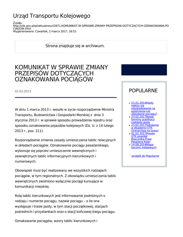 Urząd Transportu Kolejowego Źródło: http://utk.gov.pl/pl/aktualnosci/2671,KOMUNIKAT-W-SPRAWIE-ZMIANY-PRZEPISOW-DOTYCZACYCH-OZNAKOWANIA-PO CIAGOW.html Wygenerowano: Czwartek, 2 marca 2017, 16:51 Strona znajduje się w archiwum. KOMUNIKAT W SPRAWIE ZMIANY PRZEPISÓW DOTYCZĄCYCH OZNAKOWANIA POCIĄGÓW 01.03.2013 POPULARNE ● W dniu 1 marca 2013 r. weszło w życie rozporządzenie Ministra Transportu, Budownictwa i Gospodarki Morskiej z dnia 3 ● stycznia 2013 r. w sprawie sposobu prowadzenia rejestru oraz sposobu oznakowania pojazdów kolejowych (Dz. U. z 14 lutego ● 2013 r., poz. 211). ● Rozporządzenie zmienia zasady umieszczania tablic relacyjnych w składach pociągów. Oznakowanie pociągu pasażerskiego, wykonuje się poprzez umieszczenie wewnętrznych i zewnętrznych tablic informacyjnych kierunkowych i numerowych. Obowiązek musi być realizowany we wszystkich rodzajach pociągów, w tym regionalnych. Z obowiązku umieszczania tablic wewnętrznych zwolniono wyłącznie pociągi kursujące w komunikacji miejskiej. Rolą tablic kierunkowych jest informowanie podróżnych o rodzaju i numerze pociągu, nazwie pociągu – o ile ona występuje i trasie jazdy, w tym stacji początkowej, stacjach pośrednich i przystankach oraz o stacji końcowej biegu pociągu. Oznakowanie pociągów, wzory tablic kierunkowych i ● 21.01.2014Kiedy należy się odszkodowanie za opóźnienie lub odwołanie pociągu? 23.02.2017Nowe terminy publikacji rozkładu jazdy 23.02.2017Szkolenie w Akademii UTK (transmisja na żywo) 01.02.2017Prezes UTK powołał Rzecznika Praw Pasażera Kolei 14.08.2014Mapa bocznic kolejowych przejdź do Popularne numerowych oraz ich rozmieszczenie określono w załączniku nr 5 do rozporządzenia. Format i metoda wykonania tablic relacyjnych Prezes UTK przypomina, że napisy na wewnętrznych i zewnętrznych tablicach informacyjnych kierunkowych i numerowych wykonuje się pismem jednoelementowym, bezszeryfowym. Na tablicach kierunkowych wewnętrznych i zewnętrznych nie należy umieszczać: ozdobników i rysunków lub napisów wykonanych pismem ozdobnym – z wyjątkiem kursów specjalnych lub okazjonalnych. Tablice kierunkowe i numerowe tradycyjne powinny mieć napisy w kolorze czarnym umieszczone na białym tle, z wyjątkiem określonych w ust. 2–7 załącznika nr 5 do rozporządzenia. Tablice kierunkowe elektroniczne powinny mieć czarne lub ciemnogranatowe tło, zaś elementy tworzące litery i cyfry powinny mieć barwę silnie kontrastową bez względu na rodzaj i siłę oświetlenia zewnętrznego lub jego brak. Niezgodne z rozporządzeniem jest umieszczanie tablic relacyjnych wykonanych w sposób niedbały pismem ręcznym na tablicach kartonowych. Tablice kierunkowe zewnętrzne należy umieszczać w każdym z rodzajów pociągów (w tym również regionalnych): 1. na ścianie bocznej wagonu (w tym również w wagonach zespołów trakcyjnych) w taborze: a) nowym lub modernizowanym – w świetliku w pobliżu każdego wejścia do wagonu, b) eksploatowanym – przy jednym z wejść po każdej stronie wagonu, c) ze stałą obsługą – co najmniej przy wejściu do wagonu znajdującym się w pobliżu przedziału konduktorskiego; 2) na ścianie czołowej pojazdu prowadzącego pociąg, z wyłączeniem pociągów realizujących międzywojewódzkie lub międzynarodowe przewozy pasażerskie. Pociągi zestawione z zespołów trakcyjnych, wagonów silnikowych lub z lokomotywy i składu wagonów, jeżdżące w systemie ciągnij – pchaj (push-pull), powinny dodatkowo posiadać tablice kierunkowe zewnętrzne umieszczone na ścianie czołowej pojazdu prowadzącego pociąg, z wyłączeniem pociągów zestawionych z zespołów trakcyjnych dużych prędkości. Należy wskazać, że w przypadku zespołów trakcyjnych tablice relacyjne powinny być umieszczone w każdym przedsionków wagonów wchodzących w skład zespołu trakcyjnego. Tablice kierunkowe wewnętrzne należy umieścić we wszystkich przedsionkach wagonów w pociągu, w tym również w wagonach zespołów trakcyjnych. Wymaganie to nie jest obowiązkowe wyłącznie dla pociągów kursujących w komunikacji miejskiej w rozumieniu przepisów ustawy z dnia 16 grudnia 2010 r. o publicznym transporcie zbiorowym (Dz. U. z 2011 r. Nr 5, poz. 13 i Nr 228, poz. 1368). Pod pojęciem pociągów kursujących komunikacji miejskiej należy zatem rozumieć pociąg wykonujący gminne przewozy pasażerskie wykonywane w granicach administracyjnych miasta albo a) miasta i gminy, b) miast, albo c) miast i gmin sąsiadujących — jeżeli zostało zawarte porozumienie lub został utworzony związek międzygminny w celu wspólnej realizacji publicznego transportu zbiorowego; Tablic kierunkowych nie wolno zastępować innymi tablicami. Informacje o zmianie przeznaczenia wagonu zamieszcza się na dodatkowych tablicach, umieszczonych wewnątrz wagonu. Wagony w pociągach, w których nie mogą przebywać podróżni, powinny być oznakowane na zewnątrz tablicami zawierającymi taką informację. Podczas planowanych kontroli pociągów pasażerskich Prezes UTK dokona weryfikacji stosowania przez przewoźników nowych zasad oznakowania pociągów w tablice relacyjne. Brak wyposażenia pociągów we właściwe tablice kierunkowe ogranicza prawa pasażerów do otrzymania należytej informacji w trakcie podróży i stanowi bezprawną praktykę naruszająca interesy pasażerów w transporcie kolejowym. Informowanie o rodzaju i numerze pociągu oraz trasie jazdy jest bardzo ważnym elementem obsługi podróżnych i stanowi jeden z podstawowych obowiązków przewoźników kolejowych.