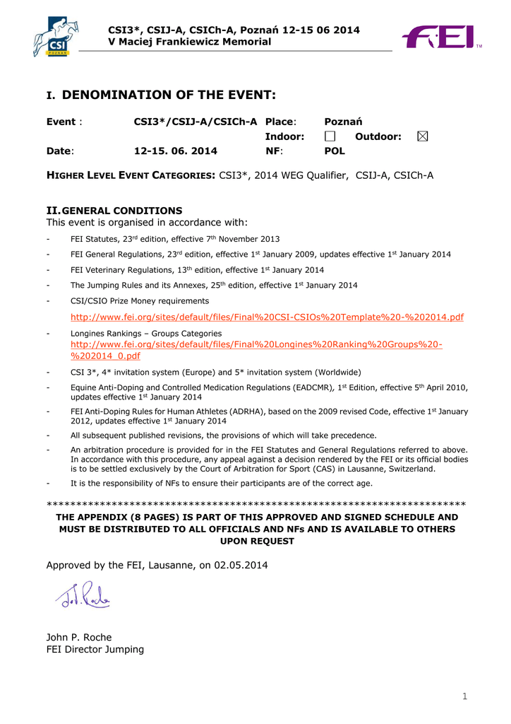 CSI3*, CSIJ-A, CSICh-A, Poznań 12-15 06 2014 V Maciej Frankiewicz Memorial I. DENOMINATION OF THE EVENT: Event : CSI3*/CSIJ-A/CSICh-A Place: Poznań Indoor: Date: 12-15. 06. 2014 NF: Outdoor: POL HIGHER LEVEL EVENT CATEGORIES: CSI3*, 2014 WEG Qualifier, CSIJ-A, CSICh-A II. GENERAL CONDITIONS This event is organised in accordance with: - FEI Statutes, 23rd edition, effective 7th November 2013 - FEI General Regulations, 23rd edition, effective 1st January 2009, updates effective 1st January 2014 - FEI Veterinary Regulations, 13th edition, effective 1st January 2014 - The Jumping Rules and its Annexes, 25th edition, effective 1st January 2014 - CSI/CSIO Prize Money requirements http://www.fei.org/sites/default/files/Final%20CSI-CSIOs%20Template%20-%202014.pdf - Longines Rankings – Groups Categories http://www.fei.org/sites/default/files/Final%20Longines%20Ranking%20Groups%20%202014_0.pdf - CSI 3*, 4* invitation system (Europe) and 5* invitation system (Worldwide) - Equine Anti-Doping and Controlled Medication Regulations (EADCMR), 1st Edition, effective 5th April 2010, updates effective 1st January 2014 - FEI Anti-Doping Rules for Human Athletes (ADRHA), based on the 2009 revised Code, effective 1st January 2012, updates effective 1st January 2014 - All subsequent published revisions, the provisions of which will take precedence. - An arbitration procedure is provided for in the FEI Statutes and General Regulations referred to above. In accordance with this procedure, any appeal against a decision rendered by the FEI or its official bodies is to be settled exclusively by the Court of Arbitration for Sport (CAS) in Lausanne, Switzerland. - It is the responsibility of NFs to ensure their participants are of the correct age. *********************************************************************** THE APPENDIX (8 PAGES) IS PART OF THIS APPROVED AND SIGNED SCHEDULE AND MUST BE DISTRIBUTED TO ALL OFFICIALS AND NFs AND IS AVAILABLE TO OTHERS UPON REQUEST Approved by the FEI, Lausanne, on 02.05.2014 John P. Roche FEI Director Jumping 1 CSI3*, CSIJ-A, CSICh-A, Poznań 12-15 06 2014 V Maciej Frankiewicz Memorial THE FEI CODE OF CONDUCT FOR THE WELFARE OF THE HORSE The Fédération Equestre Internationale (FEI) expects all those involved in international equestrian sport to adhere to the FEI’s Code of Conduct and to acknowledge and accept that at all times the welfare of the horse must be paramount and must never be subordinated to competitive or commercial influences. 1. At all stages during the preparation and training of competition horses, welfare must take precedence over all other demands. This includes good horse management, training methods, farriery and tack, and transportation. 2. Horses and Athletes must be fit, competent and in good health before they are allowed to compete. This encompasses medication use, surgical procedures that threaten welfare or safety, pregnancy in mares and the misuse of aids. 3. Events must not prejudice horse welfare. This involves paying careful attention to the competition areas, ground surfaces, weather conditions, stabling, site safety and fitness of the horse for onward travel after the event. 4. Every effort must be made to ensure that horses receive proper attention after they have competed and that they are treated humanely when their competition careers are over. This covers proper veterinary care, competition injuries, euthanasia and retirement. 5. The FEI urges all involved with the sport to attain the highest levels of education in their areas of expertise. A full copy of this Code can be obtained from the Fédération Equestre Internationale, HM King Hussein I Building, Chemin de la Joliette 8, 1006 Lausanne, Switzerland. Telephone: +41 21 310 47 47. The Code is available in English & French. The Code is also available on the FEI’s website: www.fei.org. 2 CSI3*, CSIJ-A, CSICh-A, Poznań 12-15 06 2014 V Maciej Frankiewicz Memorial III. GENERAL INFORMATION 1. ORGANISER Name: KS Jumping Events Address: ul. Chotomińska 41A Telephone: +48 602 345 080 Fax: Email: [email protected] Website: www.csi4.pl Contact Details Show Ground: Address: ul. Lutycka 34 Telephone: +48618483097 Brief summary of your venue’s accessibility details (directions by road, nearest airport / train station). Arrival by car route from Western Europe - highway A2 to Poznań Arrival by train to Poznań Główny (main station) - www.pkp.pl Arrival by plane Poznań Airport - www.airport-poznan.com.pl 2. ORGANISING COMMITTEE Honorary President: Ms Joanna Frankiewicz President of the Event: Mr Grzegorz Jaroszewski Show Secretary: Tarant Events ([email protected]) Press Officer: Mr Marek Lubawiński 3. EVENT DIRECTOR Name: Mr Szymon Tarant Address: ul. Chotomińska 41A, 61-311 Poznań Telephone: +48 602345080 Email: [email protected] Fax: 4. Please indicate a 24 hours Veterinary Service Manager number: +48 602 731 064 3 CSI3*, CSIJ-A, CSICh-A, Poznań 12-15 06 2014 V Maciej Frankiewicz Memorial IV. Ref. 1 OFFICIALS Panel Ground Jury1 2 Foreign Judge2 3 Foreign Technical Delegate3 Event ID* Function 2014_CI_1218 Ground Jury President 2014_CI_1218 Ground Jury Member Ground Jury Member Ground Jury Member 2014_CI_1218 Foreign Judge 2014_CI_1218 FEI ID Name NF Level 10051394 Zofia Jurczyńska-Kret (POL) 3 10051118 Dariusz Orzoł (POL) 3 10051395 Krystyna Kanclerz (POL) 3 10051401 Vytas Paznanskis (LTU) 3 10056174 Marco Hesse (GER) 3 E-mail & Mobile [email protected] + 48 607 799 478 * Foreign Technical Delegate 2014_CI_1218 Course Designer [email protected] +49 160 90734606 4 Course Designer4 2014_CI_1218 2014_CI_1218 Assistant Course Designer Assistant Course Designer Arkadiusz Wckwert (POL) N Wiesław Laskowski (POL) N Witold Bogacz (POL) 3 Appeal Committee President 5 Appeal Committee Member Appeal Committee5 Appeal Committee Member 6 Chief Steward6 2014_CI_1218 Chief Steward 10051303 [email protected] 4 CSI3*, CSIJ-A, CSICh-A, Poznań 12-15 06 2014 V Maciej Frankiewicz Memorial +48 