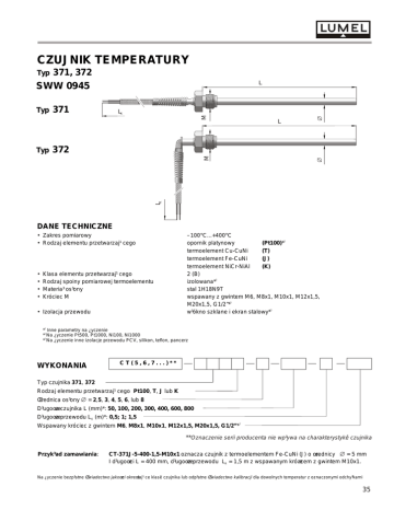 CZUJNIK TEMPERATURY 371, 372 L SWW 0945 371 372 LK M Typ L Æ LK M Typ Æ Typ DANE TECHNICZNE • Zakres pomiarowy • Rodzaj elementu przetwarzaj¹cego • • • • Klasa elementu przetwarzaj¹cego Rodzaj spoiny pomiarowej termoelementu Materia³ os³ony Króciec M • Izolacja przewodu –100°C...+400°C opornik platynowy (Pt100)*) termoelement Cu-CuNi (T) termoelement Fe-CuNi (J) termoelement NiCr-NiAl (K) 2 (B) izolowana*) stal 1H18N9T wspawany z gwintem M6, M8x1, M10x1, M12x1,5, M20x1,5, G1/2”*) w³ókno szklane i ekran stalowy*) *) Inne parametry na ¿yczenie *) Na ¿yczenie Pt500, Pt1000, Ni100, Ni1000 *) Na ¿yczenie inne izolacje przewodu PCV, silikon, teflon, pancerz WYKONANIA CT(5,6,7...)** Typ czujnika 371, 372 Rodzaj elementu przetwarzaj¹cego Pt100, T, J lub K Œrednica os³ony Æ = 2,5, 3, 4, 5, 6, lub 8 D³ugoœæ czujnika L (mm)*: 50, 100, 200, 300, 400, 600, 800 D³ugoœæ przewodu LK (m)*: 0,5; 1; 1,5 Wspawany króciec z gwintem M6, M8x1, M10x1, M12x1,5, M20x1,5, G1/2”*) **Oznaczenie serii producenta nie wp³ywa na charakterystykê czujnika Przyk³ad zamawiania: CT-371J-5-400-1,5-M10x1 oznacza czujnik z termoelementem Fe-CuNi (J) o œrednicy Æ = 5 mm I d³ugoœci L = 400 mm, d³ugoœæ przewodu LK = 1,5 m z wspawanym króæcem z gwintem M10x1. Na ¿yczenie bezp³atne Œwiadectwo jakoœci okreœlaj¹ce klasê czujnika lub odp³atne Œwiadectwo kalibracji dla dowolnych temperatur z oznaczonymi odchy³kami 35