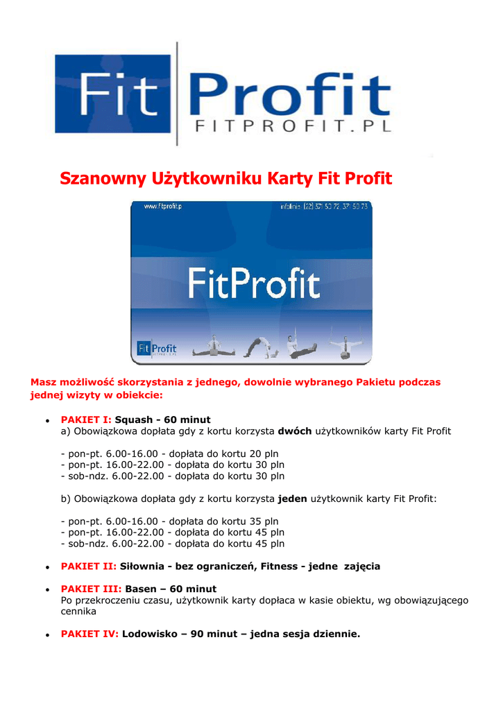 Szanowny Użytkowniku Karty Fit Profit Masz możliwość skorzystania z jednego, dowolnie wybranego Pakietu podczas jednej wizyty w obiekcie: PAKIET I: Squash - 60 minut a) Obowiązkowa dopłata gdy z kortu korzysta dwóch użytkowników karty Fit Profit - pon-pt. 6.00-16.00 - dopłata do kortu 20 pln - pon-pt. 16.00-22.00 - dopłata do kortu 30 pln - sob-ndz. 6.00-22.00 - dopłata do kortu 30 pln b) Obowiązkowa dopłata gdy z kortu korzysta jeden użytkownik karty Fit Profit: - pon-pt. 6.00-16.00 - dopłata do kortu 35 pln - pon-pt. 16.00-22.00 - dopłata do kortu 45 pln - sob-ndz. 6.00-22.00 - dopłata do kortu 45 pln PAKIET II: Siłownia - bez ograniczeń, Fitness - jedne zajęcia PAKIET III: Basen – 60 minut Po przekroczeniu czasu, użytkownik karty dopłaca w kasie obiektu, wg obowiązującego cennika PAKIET IV: Lodowisko – 90 minut – jedna sesja dziennie.