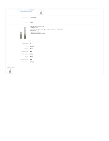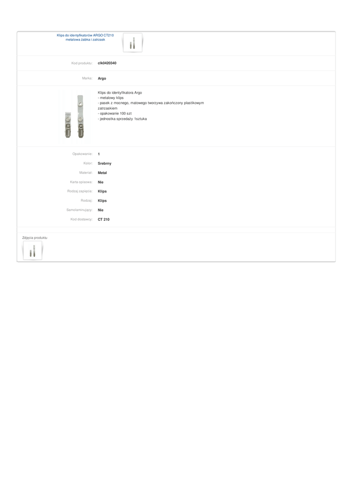 Klips do identyfikatorów ARGO CT210 metalowa żabka i zatrzask Kod produktu: Marka: clk0420340 Argo Klips do identyfikatora Argo - metalowy klips - pasek z mocnego, matowego tworzywa zakończony plastikowym zatrzaskiem - opakowanie 100 szt - jednostka sprzedaży 1sztuka Opakowanie: Kolor: Materiał: Karta opisowa: Srebrny Metal Nie Rodzaj zapięcia: Klips Rodzaj: Klips Samolaminujący: Kod dostawcy: Zdjęcia produktu 1 Nie CT 210