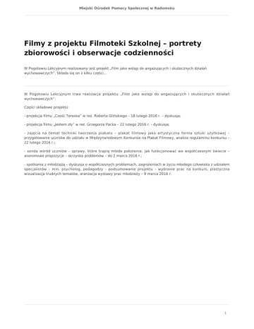 Miejski Ośrodek Pomocy Społecznej w Radomsku Filmy z projektu Filmoteki Szkolnej – portrety zbiorowości i obserwacje codzienności W Pogotowiu Lekcyjnym realizowany jest projekt „Film jako wstęp do angażujących i skutecznych działań wychowawczych”. Składa się on z kilku części... W Pogotowiu Lekcyjnym trwa realizacja projektu „Film jako wstęp do angażujących i skutecznych działań wychowawczych”. Części składowe projektu: - projekcja filmu „Cześć Tereska” w reż. Roberta Glińskiego – 18 lutego 2016 r. – dyskusja; - projekcja filmu „Jestem zły” w reż. Grzegorza Packa – 22 lutego 2016 r. - dyskusja; - zajęcia na temat techniki tworzenia plakatu – plakat filmowy jako artystyczna forma sztuki użytkowej – przygotowanie uczniów do udziału w Międzynarodowym Konkursie na Plakat Filmowy, analiza regulaminu konkursu – 22 lutego 2016 r.; - sonda wśród uczniów – sprawy, które trapią młode pokolenie, jak funkcjonować we współczesnym świecie – anonimowe propozycje – skrzynka problemów – do 2 marca 2016 r.; - spotkanie z młodzieżą – dyskusja o współczesnych problemach, zagrożeniach w życiu młodego człowieka z udziałem specjalistów – min. psycholog, pedagodzy – podsumowanie projektu – wybranie prac na konkurs, plastyczna wizualizacja trudnych tematów, aranżacja wystawy prac młodzieży – 9 marca 2016 r. 1