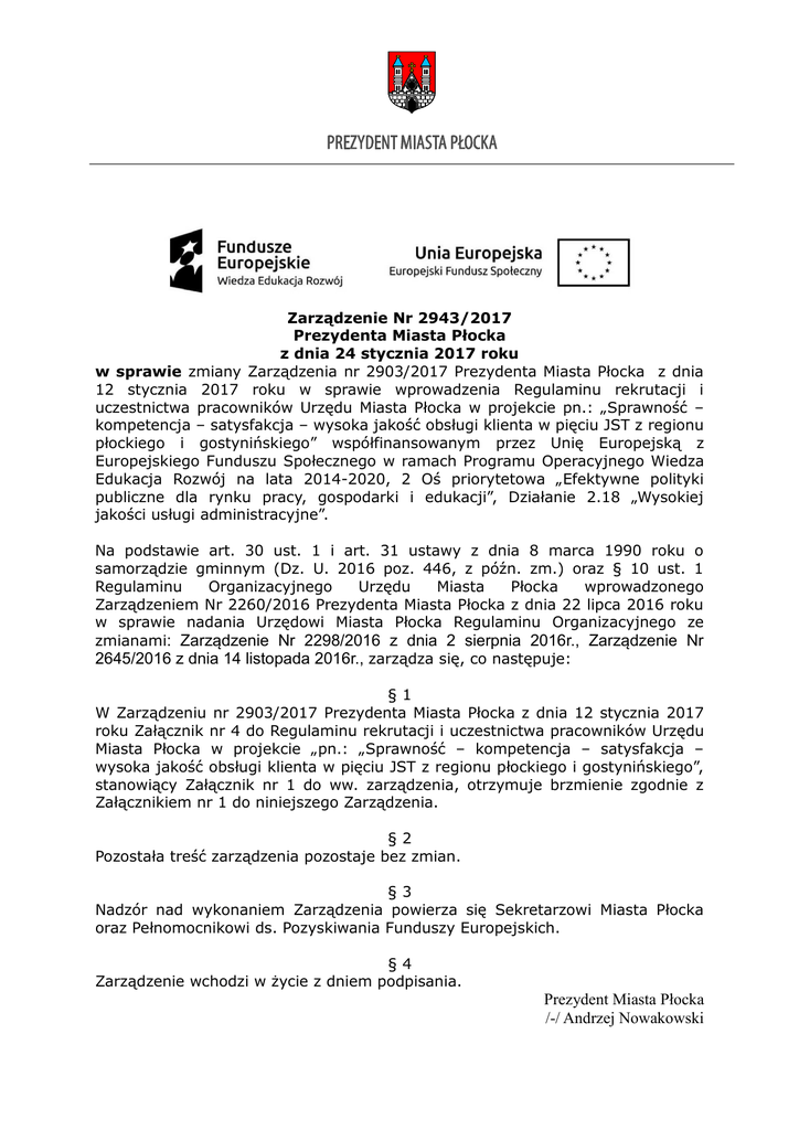 Zarządzenie Nr 2943/2017 Prezydenta Miasta Płocka z dnia 24 stycznia 2017 roku w sprawie zmiany Zarządzenia nr 2903/2017 Prezydenta Miasta Płocka z dnia 12 stycznia 2017 roku w sprawie wprowadzenia Regulaminu rekrutacji i uczestnictwa pracowników Urzędu Miasta Płocka w projekcie pn.: „Sprawność – kompetencja – satysfakcja – wysoka jakość obsługi klienta w pięciu JST z regionu płockiego i gostynińskiego” współfinansowanym przez Unię Europejską z Europejskiego Funduszu Społecznego w ramach Programu Operacyjnego Wiedza Edukacja Rozwój na lata 2014-2020, 2 Oś priorytetowa „Efektywne polityki publiczne dla rynku pracy, gospodarki i edukacji”, Działanie 2.18 „Wysokiej jakości usługi administracyjne”. Na podstawie art. 30 ust. 1 i art. 31 ustawy z dnia 8 marca 1990 roku o samorządzie gminnym (Dz. U. 2016 poz. 446, z późn. zm.) oraz § 10 ust. 1 Regulaminu Organizacyjnego Urzędu Miasta Płocka wprowadzonego Zarządzeniem Nr 2260/2016 Prezydenta Miasta Płocka z dnia 22 lipca 2016 roku w sprawie nadania Urzędowi Miasta Płocka Regulaminu Organizacyjnego ze zmianami: Zarządzenie Nr 2298/2016 z dnia 2 sierpnia 2016r., Zarządzenie Nr 2645/2016 z dnia 14 listopada 2016r., zarządza się, co następuje: §1 W Zarządzeniu nr 2903/2017 Prezydenta Miasta Płocka z dnia 12 stycznia 2017 roku Załącznik nr 4 do Regulaminu rekrutacji i uczestnictwa pracowników Urzędu Miasta Płocka w projekcie „pn.: „Sprawność – kompetencja – satysfakcja – wysoka jakość obsługi klienta w pięciu JST z regionu płockiego i gostynińskiego”, stanowiący Załącznik nr 1 do ww. zarządzenia, otrzymuje brzmienie zgodnie z Załącznikiem nr 1 do niniejszego Zarządzenia. §2 Pozostała treść zarządzenia pozostaje bez zmian. §3 Nadzór nad wykonaniem Zarządzenia powierza się Sekretarzowi Miasta Płocka oraz Pełnomocnikowi ds. Pozyskiwania Funduszy Europejskich. §4 Zarządzenie wchodzi w życie z dniem podpisania. Prezydent Miasta Płocka /-/ Andrzej Nowakowski Załącznik nr 1 do Zarządzenia Prezydenta Miasta Płocka nr 2943/2017 z dnia 24 stycznia 2017r. Regulamin rekrutacji i uczestnictwa pracowników Urzędu Miasta Płocka w projekcie pn.: „Sprawność – kompetencja – satysfakcja – wysoka jakość obsługi klienta w pięciu JST z regionu płockiego i gostynińskiego” współfinansowanym ze środków Unii Europejskiej w ramach Europejskiego Funduszu Społecznego, Program Operacyjny Wiedza Edukacja Rozwój 2014-2020, Działanie 2.18 Wysokiej jakości usługi administracyjne ZATWIERDZAM: Beneficjent Gmina - Miasto Płock Stary Rynek 1 09-400 Płock www.plock.eu Projekt pn.: „Sprawność – kompetencja – satysfakcja – wysoka jakość obsługi klienta w pięciu JST z regionu płockiego i gostynińskiego” Partnerzy projektu: Miasto i Gmina Gąbin, Gmina Stara Biała, Gmina Miasta Gostynina, Powiat Gostyniński §1 Informacje o projekcie 1. Projekt pn.: „Sprawność – kompetencja – satysfakcja – wysoka jakość obsługi klienta w pięciu JST z regionu płockiego i gostynińskiego” jest współfinansowany przez Unię Europejską w ramach Europejskiego Funduszu Społecznego z Programu Operacyjnego Wiedza Edukacja Rozwój 2014-2020, Działanie 2.18 Wysokiej jakości usługi administracyjne. 2. Celem głównym projektu jest modernizacja i podniesienie efektywności procesów świadczenia usług oraz poprawa jakości obsługi klienta, ze szczególnym uwzględnieniem przedsiębiorców, w pięciu jednostkach samorządu terytorialnego z regionu płockiego i gostynińskiego, w okresie 21 miesięcy realizacji projektu. 3. Wnioskodawcą/Beneficjentem projektu jest Gmina Miasto Płock. Gmina Miasto Płock pełni rolę Partnera wiodącego. 4. Partnerami projektu są: Gmina Stara Biała, Miasto i Gmina Gąbin, Gmina Miasta Gostynina, Powiat Gostyniński. 5. Biuro projektu mieści się w Urzędzie Miasta Płocka, ul. Stary Rynek 1, 09-400 Płock, pok. E39, tel. 024 367 17 24, fax. 024 367 14 02, e-mail: [email protected] 6. Projekt jest realizowany w okresie od 01.01.2017 r. do 30.09.2018 r. 7. Informacja o projekcie znajduje się na stronach internetowych partnerów projektu, w tym na stronie www.plock.eu w zakładce „Unia Europejska”. §2 Zakres projektu 1. Projekt zakłada dwie formy wsparcia dla uczestników (pracowników Urzędu Miasta Płocka) – szkolenia i studia podyplomowe, realizowane w ramach niżej wymienionych działań. 2. Zadanie nr 1 – Wdrożenie rozwiązań zarządczych poprawiających jakość obsługi klienta i monitorowania satysfakcji klientów, ze szczególnym uwzględnieniem obsługi przedsiębiorcy w obszarze podatków, opłat lokalnych i nieruchomości. W ramach zadania przewidziane są szkolenia związane z podniesieniem kompetencji interpersonalnych pracowników mających bezpośredni kontakt z klientem, szczególnie w obszarze podatków, opłat lokalnych, nieruchomości i obsługi przedsiębiorcy/ inwestora: a) Zarządzanie satysfakcją, w tym m.in. oczekiwanie i percepcja klienta, zadowolenie klienta, mierzenie zadowolenia klienta – 15 osób b) Zarządzanie jakością w JST dla kadry zarządzającej/ kierowniczej, w tym m.in. usprawnienie przepływu informacji, zwiększenie zaufania klienta, sprawność obsługi, optymalizacja kosztów funkcjonowania – 15 osób c) Komunikacja z klientem, w tym obsługa klienta trudnego (m.in. identyfikacja typu osobowości klienta, budowanie relacji, asertywność, radzenie sobie z niezadowoleniem klienta) – 40 osób d) Komunikacja interpersonalna, w tym m.in. przekazywanie informacji, style komunikacji, argumentowanie, świadome słuchanie, autoprezentacja – 40 osób 3. Organizatorem szkoleń określonych w pkt 2 będzie wykonawca zewnętrzny wyłoniony w drodze postępowania o udzielenie zamówienia publicznego, który będzie odpowiedzialny za realizację całego Zadania nr 1. 4. Zadanie nr 2 – Doskonalenie kompetencji kadr samorządowych poprzez realizację 