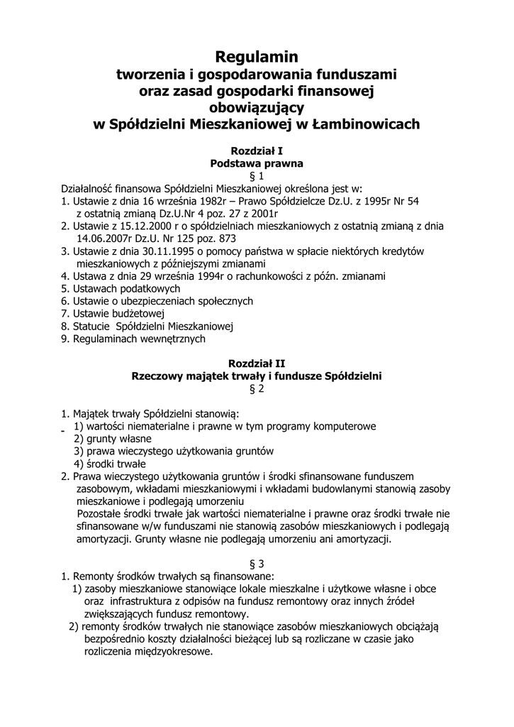 Regulamin tworzenia i gospodarowania funduszami oraz zasad gospodarki finansowej obowiązujący w Spółdzielni Mieszkaniowej w Łambinowicach Rozdział I Podstawa prawna §1 Działalność finansowa Spółdzielni Mieszkaniowej określona jest w: 1. Ustawie z dnia 16 września 1982r – Prawo Spółdzielcze Dz.U. z 1995r Nr 54 z ostatnią zmianą Dz.U.Nr 4 poz. 27 z 2001r 2. Ustawie z 15.12.2000 r o spółdzielniach mieszkaniowych z ostatnią zmianą z dnia 14.06.2007r Dz.U. Nr 125 poz. 873 3. Ustawie z dnia 30.11.1995 o pomocy państwa w spłacie niektórych kredytów mieszkaniowych z późniejszymi zmianami 4. Ustawa z dnia 29 września 1994r o rachunkowości z późn. zmianami 5. Ustawach podatkowych 6. Ustawie o ubezpieczeniach społecznych 7. Ustawie budżetowej 8. Statucie Spółdzielni Mieszkaniowej 9. Regulaminach wewnętrznych Rozdział II Rzeczowy majątek trwały i fundusze Spółdzielni §2 1. Majątek trwały Spółdzielni stanowią: 1) wartości niematerialne i prawne w tym programy komputerowe 2) grunty własne 3) prawa wieczystego użytkowania gruntów 4) środki trwałe 2. Prawa wieczystego użytkowania gruntów i środki sfinansowane funduszem zasobowym, wkładami mieszkaniowymi i wkładami budowlanymi stanowią zasoby mieszkaniowe i podlegają umorzeniu Pozostałe środki trwałe jak wartości niematerialne i prawne oraz środki trwałe nie sfinansowane w/w funduszami nie stanowią zasobów mieszkaniowych i podlegają amortyzacji. Grunty własne nie podlegają umorzeniu ani amortyzacji. §3 1. Remonty środków trwałych są finansowane: 1) zasoby mieszkaniowe stanowiące lokale mieszkalne i użytkowe własne i obce oraz infrastruktura z odpisów na fundusz remontowy oraz innych źródeł zwiększających fundusz remontowy. 2) remonty środków trwałych nie stanowiące zasobów mieszkaniowych obciążają bezpośrednio koszty działalności bieżącej lub są rozliczane w czasie jako rozliczenia międzyokresowe. 3) docieplanie ścian budynków i stropodachów może być finansowane funduszem remontowym pochodzącym z odpisów lub innych źródeł w przypadku, gdy w opinii rzeczoznawcy budowlanego docieplanie stanowi remont budynku, zgodnie z pismem Min.Fin. z dnia 28.06.2006r (Informacje i Komunikaty 6-7/2006) Finansowanie pochodzi z odpisów danej nieruchomości lub z funduszu wspólnego. 4) w przypadku zakwalifikowania przez rzeczoznawcę robót dociepleniowych jako modernizacja, nakłady te zwiększają wartość budynku i są finansowane z funduszu zasobowego wolnych środków, funduszu wkładów mieszkaniowych i budowlanych oraz środków wpłaconych przez użytkowników lokali posiadających odrębną własność w danej nieruchomości. 5) modernizacja zasobów powiększa wartość środków trwałych i jest finansowana z funduszu wkładów mieszkaniowych, budowlanych i funduszu zasobowego obrotowego przeznaczonego na fundusz zasobowy w środkach trwałych. §4 Spółdzielnia może tworzyć następujące fundusze: 1) udziałowy 2) zasobowy 3) zaliczkowy wkładów mieszkaniowych i budowlanych 4) wkładów mieszkaniowych i budowlanych 5) fundusz przeceny i waloryzacji wkładów 6) zmniejszenia funduszy z tytułu umorzeń zasobów 7) na remonty zasobów mieszkaniowych 8) zakładowy fundusz świadczeń socjalnych 9) na wynagrodzenia 10)inne fundusze celowe wg uchwał Walnego Zgromadzenia Rozdział III. Gospodarka funduszami i finansowanie działalności Spółdzielni §5 1. Spółdzielnia prowadzi działalność gospodarczą na zasadach rozrachunku ekonomicznego przy zapewnieniu korzyści członkom spółdzielni. 2. Działalność statutowa Spółdzielni może obejmować zadania wymienione w § 3-6 Statutu Spółdzielni. 3. Spółdzielnia pokrywa swoje koszty osiąganymi przychodami na zasadzie działalności bezwynikowej. Nadwyżki z całokształtu przychodów nad kosztami i odwrotnie przechodzą jako rozliczenia międzyokresowe na następny rok. §6 Działalność Spółdzielni finansowana jest ze środków własnych, które mogą być uzupełnione kredytami bankowymi oraz pożyczkami do wysokości nie przekraczającej najwyższą sumę zobowiązań, jaką Spółdzielnia może zaciągnąć oznaczonej przez Walne Zgromadzenie. §7 Spółdzielnia prowadzi działalność gospodarczą na podstawie planów gospodarczo – finansowych zatwierdzonych przez Radę Nadzorczą. §8 Fundusze zasadnicze 1. Fundusz udziałowy 1) tworzy się z tytułu: - wpłat udziałów członkowskich w wysokości określonej w statucie Spółdzielni 2) wydatkowanie: - zwrot udziałów po ustaniu członkostwa. Udziały nie podlegają waloryzacji. 2. Fundusz zasobowy A. Finansujący środki trwałe (zasoby): 1) tworzy się z tytułu: umorzenia kredytów na mieszkania lokatorskie nieodpłatne otrzymanie zasobów mieszkaniowych przeceny środków trwałych (fundusz aktualizacji zasobów) wyksięgowanie umorzeń mieszkań sfinansowanych funduszem, przeniesionych z praw lokatorskich na własność odrębną, przy księgowaniu umorzeń bieżących na tym funduszu. 2) zmniejszenie funduszu - na nieodpłatne przekazanie zasobów mieszkaniowych lub ich infrastruktury na podstawie uchwał Walnego Zgromadzenia - na zwrot do PKO kwot z tytułu cofnięcia kredytów po przeniesieniu prawa lokatorskiego na własnośc odrębną, lub uzyskania mieszkania wolnego w sensie prawnym po zwolnieniu przez członka posiadającego prawo lokatorskie. - na odpis umorzenia zasobów mieszkaniowych sfinansowanych umorzonymi kredytami (jeżeli nie przyjęto w ZPK zasady umorzeń zasobów na wspólnym koncie umorzenie zasobów) - wyksięgowanie wartości początkowej lokalu mieszkalnego sfinansowanego funduszem zasobowym w związku z przeniesieniem praw lokatorskich na własność odrębną. - B. Finansujący środki obrotowe (wolne środki) 1) tworzy się z tytułu: - wpłat wpisowego przez członków - różnicy kwot uzyskanych z ustanowienia własności odrębnej lokalu wypłaconej poprzedniemu użytkownikowi a wyższą kw