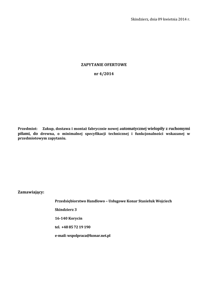 ZAPYTANIE OFERTOWE nr 4/2014 Zamawiający