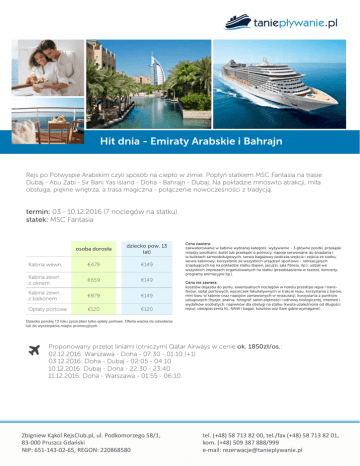 Hit dnia - Emiraty Arabskie i Bahrajn Rejs po Półwyspie Arabskim czyli sposób na ciepło w zimie. Popłyń statkiem MSC Fantasia na trasie Dubaj - Abu Zabi - Sir Bani Yas Island - Doha - Bahrajn - Dubaj. Na pokładzie mnóswto atrakcji, miła obsługa, piękne wnętrza, a trasa magiczna - połączenie nowoczesności z tradycją. termin: 03 - 10.12.2016 (7 noclegów na statku). statek: MSC Fantasia osoba dorosła dziecko pow. 13 lat) Kabina wewn. €479 €149 Kabina zewn. z oknem €659 €149 Kabina zewn. z balkonem €879 €149 Opłaty portowe €120 €120 Cena zawiera: zakwaterowanie w kabinie wybranej kategorii; wyżywienie - 3 główne posiłki, przekąski między posiłkami, bufet lub przekąski o północy; napoje serwowane do śniadania i w bufetach samoobsługowych; serwis bagażowy podczas wejścia i zejścia ze statku; serwis kabinowy; korzystanie ze wszystkich urządzeń sportowo - rekreacyjnych znajdujących się na pokładzie statku (basen, jacuzzi, sala fitness, itp.); udział we wszystkich imprezach organizowanych na statku (przedstawienia w teatrze, koncerty, programy animacyjne itp.). Cena nie zawiera: kosztów dojazdu do portu; ewentualnych noclegów w hotelu przed/po rejsie i transferów; opłat portowych, wycieczek fakultatywnych w trakcie rejsu; korzystania z barów, mini baru w kabinie oraz napojów zamawianych w restauracji; korzystania z punktów usługowych (fryzjer, pralnia, fotograf, salon piękności i odnowy biologicznej, internet) i wydatków osobistych; napiwków dla obsługi na statku (kwota uzależniona od długości rejsu); ubezpieczenia KL, NNW i bagaż, kosztów wiz (tam gdzie wymagane). Dziecko poniżej 13 roku zycia płaci tylko opłaty portowe. Oferta ważna do odwołania lub do wyczerpania miejsc promocyjnych. Proponowany przelot liniami lotniczymi Qatar Airways w cenie ok. 1850zł/os.: 02.12.2016: Warszawa - Doha - 07:30 - 01:10 (+1) 03.12.2016: Doha - Dubaj - 02:05 - 04:10 10.12.2016: Dubaj - Doha - 22:30 - 23:40 11.12.2016: Doha - Warszawa - 01:55 - 06:10. Zbigniew Kąkol RejsClub.pl, ul. Podkomorzego 58/1, 83-000 Pruszcz Gdański NIP: 651-143-02-65, REGON: 220868580 tel. (+48) 58 713 82 00, tel./fax (+48) 58 713 82 01, kom. (+48) 509 387 888/999 e-mail: [email protected]