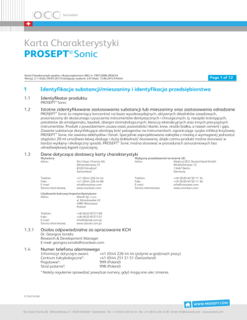 Karta Charakterystyki PROSEPT® Sonic Karta Charakterystyki zgodnie z Rozporządzeniem (WE) nr 1907/2006 (REACH) Wersja: 2.1 | Data: 09.04.2013 || Zastępuje wydanie: 2.0 | Data: 13.06.2012 || Polish Page 1 of 12 1 Identyfikacja substancji/mieszaniny i identyfikacja przedsiębiorstwa 1.1 Identyfikator produktu PROSEPT® Sonic 1.2 Istotne zidentyfikowane zastosowania substancji lub mieszaniny oraz zastosowania odradzane PROSEPT® Sonic to niepieniący koncentrat na bazie wysokowydajnych, aktywnych składników zasadowych, przeznaczony do skutecznego czyszczenia instrumentów dentystycznych i chirurgicznych, tj. narzędzi ścierających, pistoletów do amalgamatu, łopatek, dźwigni stomatologicznych, kleszczy ekstrakcyjnych oraz innych precyzyjnych instrumentów. Produkt z powodzeniem usuwa osad, pozostałości tkanki, krew, resztki białka, a nawet cement i gips. Zawarte substancje dezynfekujące obniżają ilość patogenów na instrumentach, ograniczając ryzyko infekcji krzyżowej. PROSEPT® Sonic nie zawiera aldehydów i fenoli. Specjalnie zaprojektowana nakrętka z miarką o wymaganej jednostce objętości 20 ml umożliwia łatwą obsługę i dużą dokładność dozowania, dzięki czemu produkt można stosować w bardzo wydajny i ekologiczny sposób. PROSEPT® Sonic można stosować w procedurach zanurzeniowych bez ultradźwiękowej kąpieli czyszczącej. 1.3 Dane dotyczące dostawcy karty charakterystyki Wytwórca Adres: Telefon: Faks: Email: Strona internetowa: Oro Clean Chemie AG Allmendstrasse 21 8320 Fehraltorf Switzerland Wyłączny przedstawiciel na terenie UE: Adres: Medical OCC Deutschland GmbH Wickhofstrasse 12 13467 Berlin Germany +41 (0)44 226 44 44 +41 (0)44 226 44 00 [email protected] www.oroclean.com Telefon: Faks: Email: Strona internetowa: +49 (0)30 40 50 11 34 +49 (0)30 40 50 11 36 [email protected] www.oroclean.com Użytkownik końcowy/importer/dystrybutor Adres: Abook Sp. z o.o. ul. Brzostowska 22 4985 Warszawa Poland Telefon: Faks: Email: Strona internetowa: 1.3.1 +48 (0)22 8721130 +48 (0)22 8721127 [email protected] www.abook.com.pl Osoba odpowiedzialna za opracowanie KCH Dr. Georgios Ionidis Research & Development Manager Email: [email protected] 1.4 Numer telefonu alarmowego Informacje dotyczące awarii: Centrum toksykologiczne*: Pogotowie*: Straż pożarna*: +41 (0)44 226 44 44 (jedynie w godzinach pracy) +41 (0)44 251 51 51 (Switzerland) 999 (Poland) 998 (Poland) * Należy regularnie sprawdzać powyższe numery, gdyż mogą one ulec zmianie. PL7840F049B8 Server Error in '/' Application. Oro Clean Chemie AG · Allmendstrasse 21 · 8320 Fehraltorf · Switzerland · Tel. + 41 (0) 44 226 44 44 · Fax: +41 (0) 44 226 44 00 · Email: [email protected] · www.oroclean.com Karta Charakterystyki PROSEPT® Sonic Karta Charakterystyki zgodnie z Rozporządzeniem (WE) nr 1907/2006 (REACH) Wersja: 2.1 | Data: 09.04.2013 || Zastępuje wydanie: 2.0 | Data: 13.06.2012 || Polish 2 Identyfikacja zagrożeń 2.1 Klasyfikacja substancji lub mieszaniny 2.1.1 Klasyfikacja zgodnie z Dyrektywą 1999/45/WE Page 2 of 12 C: Substancja żrąca R35 Powoduje poważne oparzenia. 2.2 Elementy oznakowania 2.2.1 Oznakowanie zgodnie z Dyrektywą 1999/45/WE Symbol: C: Substancja żrąca Zwroty R: R35 Powoduje poważne oparzenia. Zwroty S: S2 Chronić przed dziećmi. S26 Zanieczyszczone oczy przemyć natychmiast dużą ilością wody i zasięgnąć porady lekarza. S28 Zanieczyszczoną skórę natychmiast przemyć dużą ilością wody. S37/39 Nosić odpowiednie rękawice ochronne i okulary lub ochronę twarzy. S45 W przypadku awarii lub jeżeli źle się poczujesz, niezwłocznie zasięgnij porady lekarza –jeżeli to możliwe, pokaż etykietę. 2.3 Inne zagrożenia Niniejsza mieszanina nie należy do kategorii PBT lub vPvB zgodnie z REACH, aneks XIII. 3 Skład / Informacja o składnikach 3.1 Substancje Niniejszy produkt jest mieszaniną (patrz część 3.2). PL7840F049B8 Server Error in '/' Application. Oro Clean Chemie AG · Allmendstrasse 21 · 8320 Fehraltorf · Switzerland · Tel. + 41 (0) 44 226 44 44 · Fax: +41 (0) 44 226 44 00 · Email: [email protected] · www.oroclean.com Karta Charakterystyki PROSEPT® Sonic Karta Charakterystyki zgodnie z Rozporządzeniem (WE) nr 1907/2006 (REACH) Wersja: 2.1 | Data: 09.04.2013 || Zastępuje wydanie: 2.0 | Data: 13.06.2012 || Polish 3.2 Mieszaniny 3.2.1 Niebezpieczne składniki Klasyfikacja zgodnie z Dyrektywą 67/548/EWG Nazwa Numer CAS Numer EINECS Numer indeksu Wodorotlenek potasu 1310583 019002008 2151813 Page 3 of 12 Numer REACH Symbole zagrożeń: Zwroty R: Stężenie 05211577403057 0000 C R22, R35 15% < 30% Kategorie zagrożeń Zwroty wskazujące rodzaj zagrożeni Stężenie Klasyfikacja zgodnie z Rozporządzeniem (WE) nr 1272/2008 3.2.2 Nazwa Numer CAS Numer EINECS Numer indeksu Numer REACH Wodorotlenek potasu 1310583 2151813 01900200 05211577403057 8 0000 Acute Tox. 4, Skin Corr. H302, H314 1A 15% < 30% Informacje dodatkowe Pełen tekst wymienionych zwrotów R i H podano w części 16 . 4 Środki pierwszej pomocy 4.1 Opis środków pierwszej pomocy 4.1.1 Zalecenia ogólne Zapewnić środki ochrony. Stosować odpowiednie środki ochrony osobistej. Natychmiast zdjąć zanieczyszczoną odzież. Usunąć osoby ze strefy zagrożenia. W przypadku utraty przytomności lub zagrożenia utratą przytomności natychmiast skorzystać z pomocy lekarza i udzielić pierwszej pomocy. Pierwsza pomoc powinna być udzielana przez przeszkoloną osobę. W przypadku korzystania z pomocy lekarskiej pokazać niniejszą kartę charakterystyki. 4.1.2 Narażenie przez drogi oddechowe Zapewnić środki zabezpieczające przed oparami lub aerozolami wyrobu. Przenieść osobę poszkodowaną ze strefy narażenia na świeże powietrza. Nie pozostawiać osoby bez opieki. Skorzystać z pomocy lekarskiej w przypadku trudności z oddychaniem lub kaszlu, lub wystąpienia innych objawów. Poluzować opięte ubranie, na przykład kołnierzyk, krawat, pasek lub stan. 4.1.3 W przy