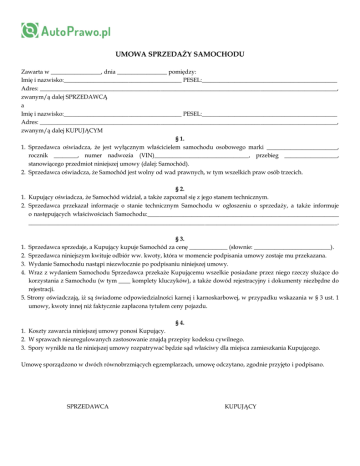 UMOWA SPRZEDAŻY SAMOCHODU Zawarta w _________________, dnia _________________ pomiędzy: Imię i nazwisko:________________________________________ PESEL:______________________________________________ Adres: _____________________________________________________________________________________________________, zwanym/ą dalej SPRZEDAWCĄ a Imię i nazwisko:________________________________________ PESEL:______________________________________________ Adres: _____________________________________________________________________________________________________, zwanym/ą dalej KUPUJĄCYM § 1. 1. Sprzedawca oświadcza, że jest wyłącznym właścicielem samochodu osobowego marki ________________________, rocznik ________, numer nadwozia (VIN)________________________________, przebieg __________________, stanowiącego przedmiot niniejszej umowy (dalej: Samochód). 2. Sprzedawca oświadcza, że Samochód jest wolny od wad prawnych, w tym wszelkich praw osób trzecich. § 2. 1. Kupujący oświadcza, że Samochód widział, a także zapoznał się z jego stanem technicznym. 2. Sprzedawca przekazał informacje o stanie technicznym Samochodu w ogłoszeniu o sprzedaży, a także informuje o następujących właściwościach Samochodu:_________________________________________________________________ _________________________________________________________________________________________________________. § 3. Sprzedawca sprzedaje, a Kupujący kupuje Samochód za cenę _____________ (słownie: __________________________). Sprzedawca niniejszym kwituje odbiór ww. kwoty, która w momencie podpisania umowy zostaje mu przekazana. Wydanie Samochodu nastąpi niezwłocznie po podpisaniu niniejszej umowy. Wraz z wydaniem Samochodu Sprzedawca przekaże Kupującemu wszelkie posiadane przez niego rzeczy służące do korzystania z Samochodu (w tym ____ komplety kluczyków), a także dowód rejestracyjny i dokumenty niezbędne do rejestracji. 5. Strony oświadczają, iż są świadome odpowiedzialności karnej i karnoskarbowej, w przypadku wskazania w § 3 ust. 1 umowy, kwoty innej niż faktycznie zapłacona tytułem ceny pojazdu. 1. 2. 3. 4. § 4. 1. Koszty zawarcia niniejszej umowy ponosi Kupujący. 2. W sprawach nieuregulowanych zastosowanie znajdą przepisy kodeksu cywilnego. 3. Spory wynikłe na tle niniejszej umowy rozpatrywać będzie sąd właściwy dla miejsca zamieszkania Kupującego. Umowę sporządzono w dwóch równobrzmiących egzemplarzach, umowę odczytano, zgodnie przyjęto i podpisano. SPRZEDAWCA KUPUJĄCY UWAGI: 1. W przypadku modyfikowania wzoru umowy poprzez skreślenia, obydwie strony powinny parafować skreślenie. 2. Przy określaniu stron umowy, można wskazać więcej niż jedną osobę po stronie Sprzedawcy lub Kupującego. W takim przypadku należy oznaczyć imię i nazwisko, numer PESEL i adres zamieszkania liczbą porządkową „1” lub „2”, aby było możliwe przyporządkowanie numeru PESEL i adresu do danej osoby. 3. W § 2 ust. 2 umowy można wskazać niecharakterystyczne wady pojazdu, o których Sprzedawca poinformował Kupującego. 4. W § 2 ust. 2 umowy możliwe jest skreślenie fragmentu „w ogłoszeniu o sprzedaży pojazdu”, jeśli Kupujący nie zapoznawał się z ogłoszeniem o sprzedaży pojazdu. 5. W § 3 ust. 1 umowy należy wskazać kwotę rzeczywiście uiszczoną za pojazd, nie zaś kwotę zaniżoną. Zaniżenie ceny pojazdu w umowie lub na fakturze może być podstawą odpowiedzialności z art. 56 k.k.s., art. 62 § 2 k.k.s., art. 271 § 1 k.k. oraz z art. 273 k.k. 6. W § 3 ust. 4 umowy należy wskazać liczbę otrzymanych kompletów kluczyków. Kupujący powinien otrzymać dwa komplety kluczyków. 7. Umowa musi być podpisana przez osoby ją zawierające. Jeśli osoba podpisująca umowę nie jest osobą wskazaną jako Sprzedawca lub Kupujący, powinna przy podpisie wskazać, że działa jako pełnomocnik danej osoby i przedłożyć stosowne pełnomocnictwo. W przypadku, gdy umowę podpisuje pełnomocnik, należy wziąć od niego oryginał pełnomocnictwa. Powyższe uwagi nie stanowią elementów powyższego wzoru umowy i nie powinny być do niej dołączane. Służą one jedynie poprawnemu wypełnieniu wzoru umowy. Powyższy wzór umowy wraz z uwagami stanowi utwór w rozumieniu Ustawy o prawie autorskim i prawach pokrewnych i może być wykorzystywany tylko na potrzeby zawierania umów sprzedaży pojazdu. Autor nie wyraża zgody na modyfikację wzoru umowy w zakresie usunięcia elementów graficznych zawartych w nagłówku.