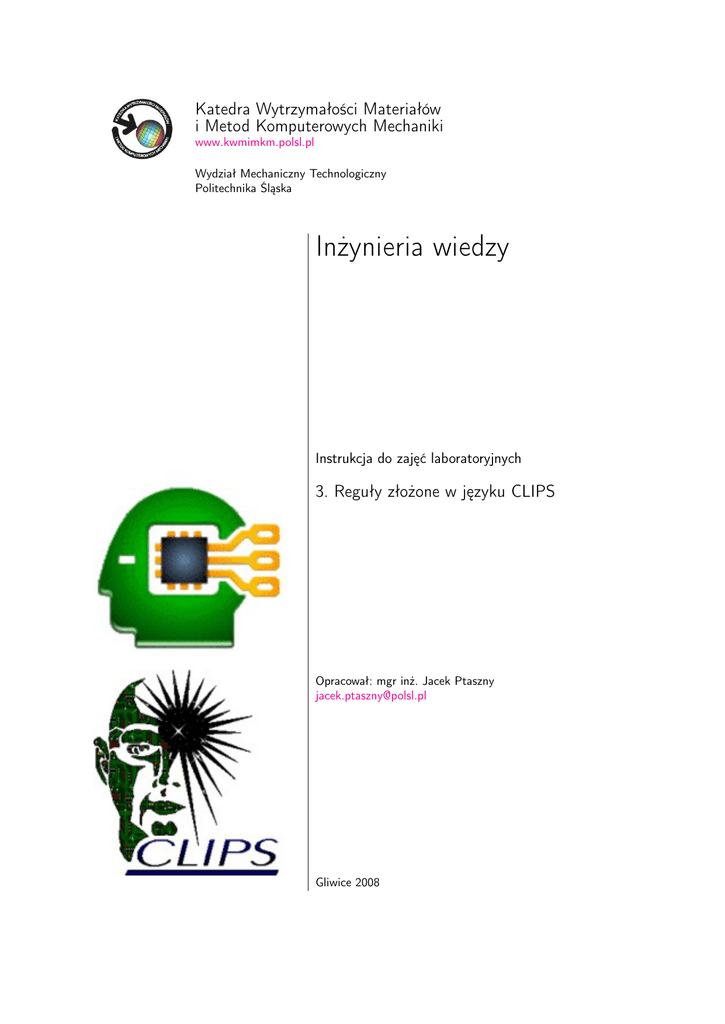 Katedra Wytrzymałości Materiałów i Metod Komputerowych Mechaniki www.kwmimkm.polsl.pl Wydział Mechaniczny Technologiczny Politechnika Śląska Inżynieria wiedzy Instrukcja do zajęć laboratoryjnych 3. Reguły złożone w języku CLIPS Opracował: mgr inż. Jacek Ptaszny [email protected] Gliwice 2008 Inżynieria wiedzy. Reguły złożone w języku CLIPS 1 1 Cel ćwiczenia Wykonując ćwiczenie udoskonalisz umiejętność formułowania reguł złożonych za pomocą języka CLIPS. 2 Zanim przejdziemy dalej Zapoznaj się z informacjami podanymi poniżej. Wyróżniamy dwa rodzaje reguł: proste oraz złożone. Reguły proste mają postać wniosków pośrednich. Ich zaletą jest łatwość weryfikacji zbioru reguł i ograniczenie ich redundancji. Wadą jest konieczność realizacji złożonych zadań przez procedurę wnioskującą, ponieważ konieczne jest uaktywnienie wielu reguł. Kolejne wnioski pośrednie tworzą łańcuch wnioskowania [5]. Reguły złożone umożliwiają bezpośrednie formułowanie wniosków przez system ekspertowy. Reguły te nie wymagają skomplikowanej procedury wnioskującej. Do osiągnięcia wyniku wystarcza uaktywnienie jednej reguły. Wadą reguł złożonych jest trudność formułowania zbioru reguł oraz złożony sposób jego weryfikacji i uzupełniania [5]. Podczas tworzenia reguł złożonych przydatne będą operatory i polecenia języka CLIPS zestawione w poniższych tablicach. Operator + * / ** = Elementarne operatory arytmetyczne Opis działania Przykład użycia Dodawanie +123 Odejmowanie - 2 ?a Mnożenie * ?x 10 2 Dzielenie /12 Potęgowanie ** 10 2 Utworzenie atomu z wyniku działania (assert (wynik =(** 10 2))) Wynik działania 1+2+3 2-?a ?x*10*2 1/2 102 (wynik 100) Operatory i funkcje w języku CLIPS mają postać prefiksową - najpierw występuje operator lub funkcja, a później jego (jej) argumenty. Funkcje logiczne, funkcje porównania oraz ich użycie Funkcja Znaczenie ! Negacja (NOT) && Koniunkcja (AND) || Suma logiczna (OR) = Równy (tylko dla liczb) eq Równy (dla liczb i dla łańcuchów znaków) != Nie równy >= Większy lub równy > Większy <= Mniejszy lub równy < Mniejszy test Funkcja testująca, np. (test (|| (< ?a 10) (> ?b 20))) Inżynieria wiedzy. Reguły złożone w języku CLIPS 2 Operatory logiczne dla atomów Operator Znaczenie Przykład użycia ∼ Negacja (liczba ∼10) & Koniunkcja (AND) (liczba ?b&∼10) | Suma logiczna (OR) (liczba 10|20) 3 Zaczynamy! Twoim zadaniem jest napisanie programu, który określi wartości zmiennych spełniających następujące działanie1 : + = A E F B D F C C F D B F E A F Zmienne A÷F są liczbami całkowitymi z przedziału od 0 do 9. Dodatkowo zmienne A÷E są różnymi liczbami, a ich suma wynosi 10. Liczba utworzona z cyfr ABCDE zawiera się w przedziale od 20 000 do 99 999. Jak się pewnie domyślasz, aby rozwiązać zadanie należy najpierw wygenerować pewien zbiór kombinacji przyporządkowujących literom liczby (te kombinacje to fakty). Następnie spośród tych kombinacji należy wybrać te, które spełnią wymienione powyżej warunki. Posłuży do tego odpowiednia reguła złożona. Wykonaj poniższe polecenia. 3.1 Wprowadź kod programu (defrule start => (printout t t "Definicja zadania" t t) (printout t " A B C D E" t) (printout t " + E D C B A" t) (printout t " ---------" t) (printout t " = F F F F F" t t) (assert (cyfra 0) (cyfra 1) (cyfra 2) (cyfra 3) (cyfra 4) (cyfra 5) (cyfra 6) (cyfra 7) (cyfra 8) (cyfra 9) (litera A) (litera B) (litera C) (litera D) (litera E) (litera F))) (defrule generuj-kombinacje (cyfra ?x) (litera ?a) => (assert (kombinacja ?a ?x))) 1 Przykład zaczerpnięto z książki [3] Inżynieria wiedzy. Reguły złożone w języku CLIPS 3 (defrule znajdz-rozwiazanie (kombinacja A ?a) (kombinacja B ?b&~?a) (kombinacja C ?c&~?b&~?a) (kombinacja D ?d&~?c&~?b&~?a) (kombinacja E ?e&~?d&~?c&~?b&~?a) (kombinacja F ?f) (test (= (+ ?e ?a) ?f ) ) (test (= (+ ?d ?b) ?f ) ) (test (= (+ ?c ?c) ?f ) ) (test (= (+ ?a ?b ?c ?d ?e) 10)) (test (>= ?a 2) ) => (printout t "Rozwiazanie:" t) (printout t ?a ?b ?c ?d ?e t)) 3.2 Uruchom program i sprawdź jego działanie Program powinien znaleźć cztery rozwiązania: ABCDE = 34201, 30241, 43210, 41230. 3.3 4 Napisz program rozwiązujący zadanie przedstawione przez prowadzącego zajęcia Podsumowanie Wykonując ćwiczenie zdobyłeś(aś) umiejętność tworzenia reguł złożonych w jezyku CLIPS, z wykorzystaniem: • operatorów arytmetycznych, • funkcji logicznych, • funkcji porównania, • operatorów logicznych dla atomów. Literatura [1] Cholewa W., Pedrycz W., Systemy doradcze. Wydawnictwo Politechniki Śląskiej, Gliwice 1987. [2] Giarratano J. C., CLIPS User’s Guide, http://clipsrules.sourceforge.net/. [3] Jeleński S., Rozrywki matematyczne. I Lilavati, WSiP, Warszawa 1992. [4] Kendal S., Creen M., An Introduction to Knowledge Engineering. Springer-Verlag, London 2007. [5] Mulawka J. J., Systemy ekspertowe. WNT, Warszawa 1996. [6] Rutkowski L., Metody i techniki sztucznej inteligencji. WNT, Warszawa 2005. [7] Russel S., Norvig P., Artificial intelligence: A Modern Approach. Prentice Hall, 2002.