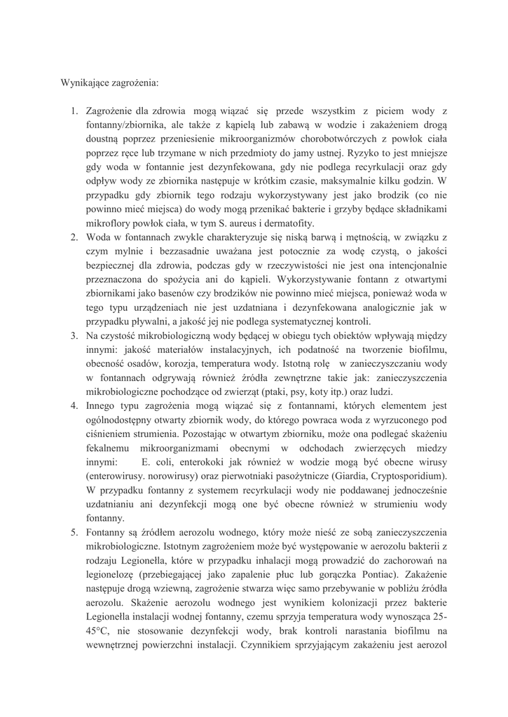 Wynikające zagrożenia: 1. Zagrożenie dla zdrowia mogą wiązać się przede wszystkim z piciem wody z fontanny/zbiornika, ale także z kąpielą lub zabawą w wodzie i zakażeniem drogą doustną poprzez przeniesienie mikroorganizmów chorobotwórczych z powłok ciała poprzez ręce lub trzymane w nich przedmioty do jamy ustnej. Ryzyko to jest mniejsze gdy woda w fontannie jest dezynfekowana, gdy nie podlega recyrkulacji oraz gdy odpływ wody ze zbiornika następuje w krótkim czasie, maksymalnie kilku godzin. W przypadku gdy zbiornik tego rodzaju wykorzystywany jest jako brodzik (co nie powinno mieć miejsca) do wody mogą przenikać bakterie i grzyby będące składnikami mikroflory powłok ciała, w tym S. aureus i dermatofity. 2. Woda w fontannach zwykle charakteryzuje się niską barwą i mętnością, w związku z czym mylnie i bezzasadnie uważana jest potocznie za wodę czystą, o jakości bezpiecznej dla zdrowia, podczas gdy w rzeczywistości nie jest ona intencjonalnie przeznaczona do spożycia ani do kąpieli. Wykorzystywanie fontann z otwartymi zbiornikami jako basenów czy brodzików nie powinno mieć miejsca, ponieważ woda w tego typu urządzeniach nie jest uzdatniana i dezynfekowana analogicznie jak w przypadku pływalni, a jakość jej nie podlega systematycznej kontroli. 3. Na czystość mikrobiologiczną wody będącej w obiegu tych obiektów wpływają między innymi: jakość materiałów instalacyjnych, ich podatność na tworzenie biofilmu, obecność osadów, korozja, temperatura wody. Istotną rolę w zanieczyszczaniu wody w fontannach odgrywają również źródła zewnętrzne takie jak: zanieczyszczenia mikrobiologiczne pochodzące od zwierząt (ptaki, psy, koty itp.) oraz ludzi. 4. Innego typu zagrożenia mogą wiązać się z fontannami, których elementem jest ogólnodostępny otwarty zbiornik wody, do którego powraca woda z wyrzuconego pod ciśnieniem strumienia. Pozostając w otwartym zbiorniku, może ona podlegać skażeniu fekalnemu mikroorganizmami obecnymi w odchodach zwierzęcych miedzy innymi: E. coli, enterokoki jak również w wodzie mogą być obecne wirusy (enterowirusy. norowirusy) oraz pierwotniaki pasożytnicze (Giardia, Cryptosporidium). W przypadku fontanny z systemem recyrkulacji wody nie poddawanej jednocześnie uzdatnianiu ani dezynfekcji mogą one być obecne również w strumieniu wody fontanny. 5. Fontanny są źródłem aerozolu wodnego, który może nieść ze sobą zanieczyszczenia mikrobiologiczne. Istotnym zagrożeniem może być występowanie w aerozolu bakterii z rodzaju Legionełla, które w przypadku inhalacji mogą prowadzić do zachorowań na legionelozę (przebiegającej jako zapalenie płuc lub gorączka Pontiac). Zakażenie następuje drogą wziewną, zagrożenie stwarza więc samo przebywanie w pobliżu źródła aerozolu. Skażenie aerozolu wodnego jest wynikiem kolonizacji przez bakterie Legionełla instalacji wodnej fontanny, czemu sprzyja temperatura wody wynosząca 2545°C, nie stosowanie dezynfekcji wody, brak kontroli narastania biofilmu na wewnętrznej powierzchni instalacji. Czynnikiem sprzyjającym zakażeniu jest aerozol wodny o średnicy kropel 2.0 µm – 5.0 µm, które łatwiej osiągają dystalne odcinki dolnych dróg oddechowych. Ryzyko zakażenia skutecznie minimalizuje okresowa kontrola stanu instalacji wodnej, połączona z usuwaniem ewentualnego biofilmu, utrzymywanie temperatury wody na poziomie poniżej 20°C, dezynfekcja wody (związki chloru, promieniowanie UV). Właściwe zaprojektowanie fontanny powinno zapewniać także laminarny (nie turbulentny) wypływ wody.