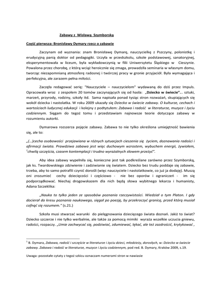 Zabawy z Wisławą Szymborską Część pierwsza: Bronisławy Dymary rzecz o zabawie Zaczynam od wyznania: znam Bronisławę Dymarę, nauczycielkę z Pszczyny, polonistkę i erudycyjną panią doktor od pedagogiki. Uczyła w przedszkolu, szkole podstawowej, sanatoryjnej, eksperymentowała w liceum, była wykładowczynią w filii Uniwersytetu Śląskiego w Cieszynie. Powalona przez chorobę, z którą wciąż heroicznie się zmaga, prowadziła seminaria w własnym domu, tworząc niezapomnianą atmosferę radosnej i twórczej pracy w gronie przyjaciół. Była wymagająca i perfekcyjna, ale zarazem pełna miłości. Zaczęła redagować serię: "Nauczyciele – nauczycielom" wydawaną do dziś przez Impuls. Opracowała wraz z zespołem 20 tomów zaczynających się od hasła: „Dziecko w świecie”... sztuki, marzeń, przyrody, rodziny, szkoły itd. Sama napisała ponad tysiąc stron rozważań, skupiających się wokół dziecka i nastolatka. W roku 2009 ukazały się Dziecko w świecie zabawy. O kulturze, cechach i wartościach ludycznej edukacji i kolejny z podtytułem: Zabawa i radość w literaturze, muzyce i życiu codziennym. Sięgam do tegoż tomu i przedstawiam najnowsze teorie dotyczące zabawy w rozumieniu autorki. Dymarowa rozszerza pojęcie zabawy. Zabawa to nie tylko określona umiejętność bawienia się, ale to: „(…)cecha osobowości przejawiana w różnych sytuacjach cieszenia się życiem, doznawania radości i afirmacji świata. Prawdziwa zabawa jest więc duchowym wzrostem, wybuchem energii, żywiołem, 1 chwilą szczęścia, czasem kontemplacji i trudno wyrażalnych słowem przeżyć”. Aby idea zabawy wypełniła się, konieczne jest tak podkreślane zarówno przez Szymborską, jak ks. Twardowskiego zdziwienie i zadziwianie się światem. Dziecko bez trudu poddaje się zabawie, trzeba, aby to samo potrafili czynić dorośli (więc nauczyciele i nastolatkowie, co już ja dodaję). Muszą oni zrozumieć cechy dziecięcości i częściowo - nie bez oporów i ograniczeń - im się podporządkować. Niechaj drogowskazem dla nich będą słowa wybitnego lekarza i humanisty, Adana Szczeklika: „Nauka to tylko jeden ze sposobów poznania rzeczywistości. Wiedział o tym Platon. I gdy docierał do kresu poznania naukowego, sięgał po poezję, by przekroczyć granicę, przed którą musiał cofnąć się rozumem.” (s.21.) Szkoła musi stwarzać warunki do pielęgnowania dziecięcego świata doznań. Jakiż to świat? Dziecko szczerze i nie tylko werbalnie, ale także za pomocą mimiki wyraża wszelkie uczucia gniewu, radości, rozpaczy. „Umie zachwycać się, podziwiać, zdumiewać, lękać, ale też zazdrościć, krytykować , 1 B. Dymara, Zabawa, radość i szczęście w literaturze i życiu dzieci, młodzieży, dorosłych, w: Dziecko w świecie zabawy. Zabawa i radość w literaturze, muzyce i życiu codziennym, pod red. B. Dymary, Kraków 2009, s.19. Uwaga: pozostałe cytaty z tegoż szkicu oznaczam numerami stron w nawiasie oskarżać.” (s.22.) Dorośli muszą zrozumieć i usprawiedliwić te reakcje, czyli zrezygnować z własnej dominacji. Dziecko bez przerwy pyta. Nie wie, co to jest tęcza, niebo, ziemia, deszcz, anioł, diabeł. Intuicyjne myślenie dziecka nie zna granic. Dziecko przekształca obcowanie z rzeczami w zabawę, jest pełne radości, spontaniczności i zmysłowości. „Dzieci lubią rzeczy niezwykłe i cudowne. Rozmawiają z nimi. Animują je lub personifikują. Nadają dziwaczne imiona …” (s.23.), stąd tak zaskakujące zabawy językowe. Dla dziecka granica między pracą a zabawą zaciera się, ono uczy się bawiąc . „Świat fikcji – pisze W. Okoń – w każdym dziecku może przyjmować ważne role i działać we właściwych dla niego granicach, gdzie fotel może być okrętem, a miejsce pod stołem pieczarą rozbójników, jest światem rozszerzającym egzystencję dzieci poza granice odpowiadające ich właściwemu, realnemu przygotowaniu do życia. W tym fikcyjnym świecie dziecko może działać niczym dorosły, sycąc się przy tym urokiem zabawy i opanowując sztukę bycia dorosłym.” (s.48.) Wszystkie te zabawy z językowymi włącznie są poczuciem sprawstwa, stanowią trening twórczy, gimnastykują wyobraźnię. Dziecko, nie wiedząc o tym tworzy arcydzieła językowe, plastyczne czy muzyczne. „Zabawa, taniec, gra, magia i mitologizacja rzeczywistości stanowią podstawę specyficznego kodu dziecięcej komunikacji.” (s.25.) Dziecko powtarza, przedrzeźnia, żartuje, chroni także w języku swą niezależność. I jak się świetnie bawi! Dymarowa przywołuje wiele przykładów językowych zaskoczeń, między innymi te z książki Lindgen: „ – Tu się będzie smażyć naleśnikarzy! -- Tu się będzie piekło naleśniciekło! --Tu się będzie jadło naleśniczadło!” (s.61.) Towarzyszą tym wykrzyknikom gesty Pippi imitujące smażenie, więc rozbijanie jajek (podrzuca je w górę), rozbijanie ciasta (tłucze je szczotką do szorowania pleców). Naleśniki także skaczą pod sufit! Oto przykład swoistej r e n a r r a c j i, wzbogacania wątków, naśladownictwa, ale jakiego – z nadwyżką, z dodawaniem własnych pomysłów, które nie mają niczego wspólnego z kopią, są przekształcaniem wzoru. W tym miejscu robię dygresję o intertekstualności, modnej dziś teorii, która nie tylko uwielbia cytowanie, ale świadomie czyni z niej metodę twórczą. Wolno brać za pierwowzór tekst cudzy, dawny lub powstały przed chwilą, rozbudowywać go, dopełniać, skracać, bawić się nim, przedrzeźniać go, stylizować własne opowiadanie na takie, które powstało przed wiekami. Proza powieściowa, ale także i film uwielbiają grę z motywami czy sytuacjami, z mitem, legendą, ale także z konwencją realistyczną. Gdy trzeba z konieczności powtarzać tematy, gdy nie można niczego nowego wymyślić, pozostaje sięganie po wątki i opowieści gotowe, a dystans wobec nich usprawiedliwia artystę, co wi