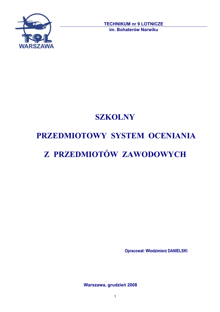TECHNIKUM nr 9 LOTNICZE im. Bohaterów Narwiku SZKOLNY PRZEDMIOTOWY SYSTEM OCENIANIA Z PRZEDMIOTÓW ZAWODOWYCH Opracował: Włodzimierz DANIELSKI Warszawa, grudzień 2008 1 SPIS TREŚCI 1. 2. 3. 4. 5. 6. 7. 8. 9. 10. 11. 12. 13. 14. 15. 16. 17. CELE PRZEDMIOTOWEGO SYSTEMU OCENIANIA ZAKRES PRZEDMIOTOWEGO SYSTEMU OCENIANIA KONTRAKT Z UCZNIAMI OBSZARY AKTYWNOŚCI UCZNIA SPOSOBY SPRAWDZANIA OSIĄGNIĘĆ UCZNIÓW CZĘSTOTLIWOŚĆ SPRAWDZANIA ZASADY PRZEPROWADZANIA SPRAWDZIANÓW SPOSOBY WYSTAWIANIA OCENY ŚRÓDROCZNEJ I ROCZNEJ SPOSOBY INFORMOWANIA UCZNIÓW O POSTĘPACH I NIEDOCIĄGNIĘCIACH SPOSOBY INFORMOWANIA RODZICÓW ZASADY I FORMY WSPÓŁDZIAŁANIA Z RODZICAMI I UCZNIAMI W CELU POPRAWY NIEZADOWALAJĄCYCH WYNIKÓW NAUCZANIA PRAWA I OBOWIĄZKI OCENIANYCH W PRZYPADKU USTALENIA STOPNIA Z NARUSZENIEM PRAWA SYSTEM OCENIANIA ZAJĘĆ LABORATORYJNYCH • • • • ZNACZENIE PRZEDMIOTU W STRUKTURZE KSZTAŁCENIA CHARAKTER ZAJĘĆ PROWADZONYCH METODĄ ĆWICZEŃ LABORATORYJNYCH TOK ZAJĘĆ LABORATORYJNYCH REGUŁY OCENIANIA SYSTEM OCENIANIA ZAJĘĆ PRAKTYCZNYCH SYSTEM OCENIANIA PRAKTYK ZAWODOWYCH PLANY WYNIKOWE ZAŁĄCZNIKI • FORMY I TYPY ZADAŃ DO SPRAWDZANIA WIADOMOŚCI I UMIEJĘTNOŚCI • DOSTOSOWANIE CZASOWNIKÓW OPERACYJNYCH DO POZIOMÓW TAKSONOMICZNYCH • • • • • • ZALETY I WADY PISEMNYCH ZADAŃ TESTOWYCH KRYTERIA OCENY UCZNIÓW NA ZAJĘCIACH PRAKTYCZNYCH KRYTERIA OCENY UCZNIÓW Z PRZEDMIOTÓW ZAWODOWYCH KRYTERIA DO OPRACOWANIA I OCENIANIA ZADAŃ TESTOWYCH WZÓR KARTY SPRAWOZDANIA WZÓR HARMONOGRAMU PRZEJŚĆ 2 SZKOLNY PRZEDMIOTOWY SYSTEM OCENIANIA z przedmiotów zawodowych Podstawa prawna: Rozporządzenie Ministra Edukacji Narodowej i Sportu z dnia z dnia 7 września 2004 r. (wraz z późniejszymi zmianami) w sprawie warunków i sposobu oceniania, klasyfikowania i promowania uczniów i słuchaczy oraz przeprowadzania sprawdzianów i egzaminów w szkołach publicznych obliguje nauczycieli do sformułowania (zatem zaplanowania) wymagań edukacyjnych i podania ich do wiadomości uczniom oraz ich rodzicom. Plan wynikowy jest podrzędny w stosunku do innych dokumentów, takich jak podstawa programowa, program nauczania, wewnątrzszkolny oraz przedmiotowy system oceniania i musi być zgodny z ich założeniami. Celem przedmiotowego systemu oceniania jest: 1. Wspieranie rozwoju ucznia przez diagnozowanie jego osiągnięć w odniesieniu do wymagań edukacyjnych przewidzianych w programach nauczania. 2. Dostarczenie uczniom, rodzicom i nauczycielom informacji o postępach, osiągnięciach oraz trudnościach ucznia 3. Pomoc w zorganizowaniu samodzielnego uczenia się oraz logicznego myślenia na podstawie właściwych pomocy naukowych; 4. Wspieranie rozwoju psychicznego, kształtowanie jego dojrzałości, samodzielności i odpowiedzialności za posiadaną dokumentację techniczną, narzędzia wykorzystywane przy obsłudze samolotu i jego urządzeniach; 5. Sprawdzenie prawidłowego stosunku do bezpieczeństwa lotniczego; 6. Kształtowanie umiejętności współdziałania w grupie, co stanowi podstawowe kryterium pracy w lotnictwie zgodnie z PART- 145 ; 7. Wykorzystywanie osiągnięć uczniów do planowania pracy dydaktycznej nauczyciela. 8. Ocenie podlegają: • osiągnięcia edukacyjne w zakresie wiedzy teoretycznej i praktycznej realizowanej przez nauczyciela według programu nauczania; • wiedza ucznia na temat kultury technicznej i prawidłowego stosunku do bezpieczeństwa lotniczego zgodnie z wymogami EASA PART-147. 85 (d,f); • stosowanie zasad bezpiecznej i ekologicznej obsługi urządzeń; 3 PONIŻSZY PRZEDMIOTOWY SYSTEM OCENIANIA DOTYCZY PRZEDMIOTÓW: • • • • • • • • • • • • • • • • • • • • Podstawy elektrotechniki Podstawy elektroniki Technika cyfrowa Ogólnotechniczne podstawy obsługi urządzeń lotniczych Aerodynamika i mechanika lotu Konstrukcja statków powietrznych i ich zespołów napędowych Budowa i eksploatacja wyposażenia elektrycznego statków powietrznych Budowa i eksploatacja systemów i urządzeń awioniki, w tym: - Przyrządy pokładowe; - Układy automatyki; - Komputery pokładowe; - Wyposażenie radiowe; - Pracownia technik pomiarowych: Język angielski dla awioników Mechanika i wytrzymałość materiałów Podstawy konstrukcji maszyn Materiałoznawstwo ogólne i lotnicze Termodynamika techniczna Elektrotechnika i elektronika, w tym: - Podstawy elektrotechniki; - Podstawy elektroniki; Technika cyfrowa i przyrządy elektroniczne Budowa i eksploatacja silników lotniczych Budowa i eksploatacja statków powietrznych, w tym: - Płatowiec i instalacje; - Wyposażenie elektryczne; - Awionika dla mechaników; - Pracownia technik pomiarowych; Język angielski dla mechaników lotniczych Zajęcia praktyczne Praktyka zawodowa 1. Informacje o przebiegu i wynikach nauczania ucznia są poufne dla osób postronnych. 2. Okres przechowywania dokumentacji związanej z ocenianiem określają odrębne przepisy. 3. Uczniowie uczestniczący w zajęciach specjalistycznych z dziedziny lotnictwa spełniają warunki zdrowotne określone oddzielnymi przepisami (Rozporządzenie Ministra Infrastruktury z dnia 26 sierpnia 2003 r. w sprawie wymagań w zakresie sprawności psychicznej i fizycznej osób ubiegających się o świadectwo kwalifikacji członka personelu lotniczego lub posiadających świadectwo członka personelu lotniczego Dz. U. Nr 167 poz. 1625 i 1626) – na podstawie ustawy z dnia 3 lipca 2002 r. - Prawo lotnicze. 4. Ewidencja oraz oceny z odbytych zajęć praktycznych, praktyk zawodowych i pracowni specjalistycznych są odnotowywane w Dzienniku praktycznej nauki zawodu. 5. Oceny z egzaminów teoretycznych i praktycznych są odnotowywane w indeksach. Nauczyciel na bieżąco stosuje ocenę ustną, której celem jest uwidocznienie poprawnych działań i nawyków uczniów oraz wskazanie luk i braków w wiadomościach i umiejętnościach uczniów. Nauczyciel sprawdza wiadomości teoretyczne i praktyczne uczniów (często w formie kilku