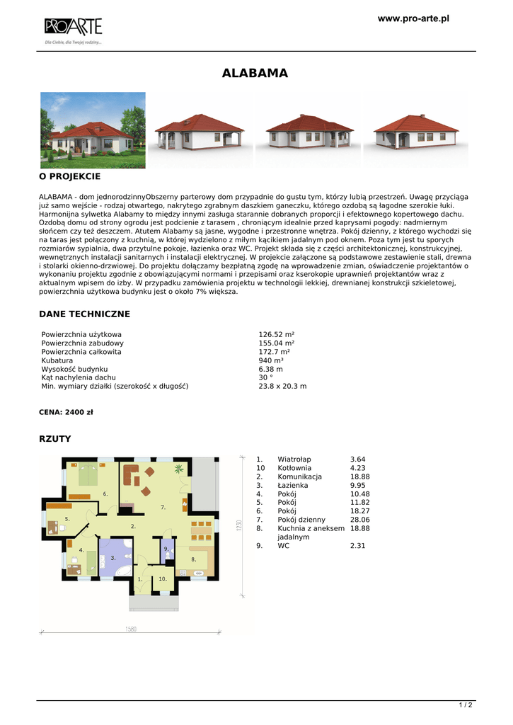 www.pro-arte.pl ALABAMA O PROJEKCIE ALABAMA - dom jednorodzinnyObszerny parterowy dom przypadnie do gustu tym, którzy lubią przestrzeń. Uwagę przyciąga już samo wejście - rodzaj otwartego, nakrytego zgrabnym daszkiem ganeczku, którego ozdobą są łagodne szerokie łuki. Harmonijna sylwetka Alabamy to między innymi zasługa starannie dobranych proporcji i efektownego kopertowego dachu. Ozdobą domu od strony ogrodu jest podcienie z tarasem , chroniącym idealnie przed kaprysami pogody: nadmiernym słońcem czy też deszczem. Atutem Alabamy są jasne, wygodne i przestronne wnętrza. Pokój dzienny, z którego wychodzi się na taras jest połączony z kuchnią, w której wydzielono z miłym kącikiem jadalnym pod oknem. Poza tym jest tu sporych rozmiarów sypialnia, dwa przytulne pokoje, łazienka oraz WC. Projekt składa się z części architektonicznej, konstrukcyjnej, wewnętrznych instalacji sanitarnych i instalacji elektrycznej. W projekcie załączone są podstawowe zestawienie stali, drewna i stolarki okienno-drzwiowej. Do projektu dołączamy bezpłatną zgodę na wprowadzenie zmian, oświadczenie projektantów o wykonaniu projektu zgodnie z obowiązującymi normami i przepisami oraz kserokopie uprawnień projektantów wraz z aktualnym wpisem do izby. W przypadku zamówienia projektu w technologii lekkiej, drewnianej konstrukcji szkieletowej, powierzchnia użytkowa budynku jest o około 7% większa. DANE TECHNICZNE Powierzchnia użytkowa Powierzchnia zabudowy Powierzchnia całkowita Kubatura Wysokość budynku Kąt nachylenia dachu Min. wymiary działki (szerokość x długość) 126.52 m² 155.04 m² 172.7 m² 940 m³ 6.38 m 30 ° 23.8 x 20.3 m CENA: 2400 zł RZUTY 1. 10 2. 3. 4. 5. 6. 7. 8. 9. Wiatrołap Kotłownia Komunikacja Łazienka Pokój Pokój Pokój Pokój dzienny Kuchnia z aneksem jadalnym WC 3.64 4.23 18.88 9.95 10.48 11.82 18.27 28.06 18.88 2.31 1/2 www.pro-arte.pl tel. (32) 43-50-829, 502 575 920, [email protected], www.pro-arte.pl 2/2 Powered by TCPDF (www.tcpdf.org)
