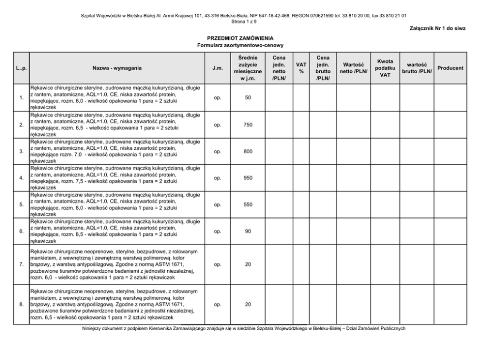 Szpital Wojewódzki w Bielsku-Białej Al. Armii Krajowej 101, 43-316 Bielsko-Biała, NIP 547-18-42-468, REGON 070621590 tel. 33 810 20 00, fax 33 810 21 01 Strona 1 z 9 Załącznik Nr 1 do siwz PRZEDMIOT ZAMÓWIENIA Formularz asortymentowo-cenowy J.m. Średnie zużycie miesięczne w j.m. op. 50 op. 750 op. 800 op. 950 op. 550 op. 90 7. Rękawice chirurgiczne neoprenowe, sterylne, bezpudrowe, z rolowanym mankietem, z wewnętrzną i zewnętrzną warstwą polimerową, kolor brązowy, z warstwą antypoślizgową. Zgodne z normą ASTM 1671, pozbawione tiuramów potwierdzone badaniami z jednostki niezależnej, rozm. 6,0 - wielkość opakowania 1 para = 2 sztuki rękawiczek op. 20 8. Rękawice chirurgiczne neoprenowe, sterylne, bezpudrowe, z rolowanym mankietem, z wewnętrzną i zewnętrzną warstwą polimerową, kolor brązowy, z warstwą antypoślizgową. Zgodne z normą ASTM 1671, pozbawione tiuramów potwierdzone badaniami z jednostki niezależnej, rozm. 6,5 - wielkość opakowania 1 para = 2 sztuki rękawiczek op. 20 L..p. 1. 2. 3. 4. 5. 6. Nazwa - wymagania Rękawice chirurgiczne sterylne, pudrowane mączką kukurydzianą, długie z rantem, anatomiczne, AQL=1.0, CE, niska zawartość protein, niepękające, rozm. 6,0 - wielkość opakowania 1 para = 2 sztuki rękawiczek Rękawice chirurgiczne sterylne, pudrowane mączką kukurydzianą, długie z rantem, anatomiczne, AQL=1.0, CE, niska zawartość protein, niepękające, rozm. 6,5 - wielkość opakowania 1 para = 2 sztuki rękawiczek Rękawice chirurgiczne sterylne, pudrowane mączką kukurydzianą, długie z rantem, anatomiczne, AQL=1.0, CE, niska zawartość protein, niepękające rozm. 7,0 - wielkość opakowania 1 para = 2 sztuki rękawiczek Rękawice chirurgiczne sterylne, pudrowane mączką kukurydzianą, długie z rantem, anatomiczne, AQL=1.0, CE, niska zawartość protein, niepękające, rozm. 7,5 - wielkość opakowania 1 para = 2 sztuki rękawiczek Rękawice chirurgiczne sterylne, pudrowane mączką kukurydzianą, długie z rantem, anatomiczne, AQL=1.0, CE, niska zawartość protein, niepękające, rozm. 8,0 - wielkość opakowania 1 para = 2 sztuki rękawiczek Rękawice chirurgiczne sterylne, pudrowane mączką kukurydzianą, długie z rantem, anatomiczne, AQL=1.0, CE, niska zawartość protein, niepękające, rozm. 8,5 - wielkość opakowania 1 para = 2 sztuki rękawiczek Cena jedn. netto /PLN/ VAT % Cena jedn. brutto /PLN/ Wartość netto /PLN/ Kwota podatku VAT wartość brutto /PLN/ _________________________________________________ Niniejszy dokument z podpisem Kierownika Zamawiającego znajduje się w siedzibie Szpitala Wojewódzkiego w Bielsku-Białej – Dział Zamówień Publicznych Producent Szpital Wojewódzki w Bielsku-Białej Al. Armii Krajowej 101, 43-316 Bielsko-Biała, NIP 547-18-42-468, REGON 070621590 tel. 33 810 20 00, fax 33 810 21 01 Strona 2 z 9 Rękawice chirurgiczne neoprenowe, sterylne, bezpudrowe, z rolowanym mankietem, z wewnętrzną i zewnętrzną warstwą polimerową, kolor brązowy, z warstwą antypoślizgową. Zgodne z normą ASTM 1671, pozbawione tiuramów potwierdzone badaniami z jednostki niezależnej, rozm. 7,0 - wielkość opakowania 1 para = 2 sztuki rękawiczek op. 25 Rękawice chirurgiczne neoprenowe, sterylne, bezpudrowe, z rolowanym mankietem, z wewnętrzną i zewnętrzną warstwą polimerową, kolor 10. brązowy, z warstwą antypoślizgową. Zgodne z normą ASTM 1671, pozbawione tiuramów potwierdzone badaniami z jednostki niezależnej, rozm. 7,5 - wielkość opakowania 1 para = 2 sztuki rękawiczek op. 20 Rękawice chirurgiczne neoprenowe, sterylne, bezpudrowe, z rolowanym mankietem, z wewnętrzną i zewnętrzną warstwą polimerową, kolor 11. brązowy, z warstwą antypoślizgową. Zgodne z normą ASTM 1671, pozbawione tiuramów potwierdzone badaniami z jednostki niezależnej, rozm. 8,5 - wielkość opakowania 1 para = 2 sztuki rękawiczek op. 10 Rękawice diagnostyczne, lateksowe, bezpudrowe, z wewnętrzną warstwą polimerową, z rolowanym mankietem, teksturowane jednorodnie na całej powierzchni dłoni i palców. Grubość na palcu 0,12mm, dłoni 0,11mm, 12. mankiecie 0,08mm, długość 240mm. Odporne na przenikanie wirusów zgodnie z normą ASTM F1671 oraz substancji chemicznych zgodnie z EN 374-3 potwierdzone badaniami z jednostki niezależnej. Rozmiar XS. Maksymalna wielkość opakowania 200 sztuk rękawiczek. szt. = 1 rękawica 200 Rękawice diagnostyczne, lateksowe, bezpudrowe, z wewnętrzną warstwą polimerową, z rolowanym mankietem, teksturowane jednorodnie na całej powierzchni dłoni i palców. Grubość na palcu 0,12mm, dłoni 0,11mm, 13. mankiecie 0,08mm, długość 240mm. Odporne na przenikanie wirusów zgodnie z normą ASTM F1671 oraz substancji chemicznych zgodnie z EN 374-3 potwierdzone badaniami z jednostki niezależnej. Rozmiar S. Maksymalna wielkość opakowania 200 sztuk rękawiczek. szt. = 1 rękawica 1 500 Rękawice diagnostyczne, lateksowe, bezpudrowe, z wewnętrzną warstwą polimerową, z rolowanym mankietem, teksturowane jednorodnie na całej powierzchni dłoni i palców. Grubość na palcu 0,12mm, dłoni 0,11mm, 14. mankiecie 0,08mm, długość 240mm. Odporne na przenikanie wirusów zgodnie z normą ASTM F1671 oraz substancji chemicznych zgodnie z EN 374-3 potwierdzone badaniami z jednostki niezależnej. Rozmiar M. Maksymalna wielkość opakowania 200 sztuk rękawiczek. szt. = 1 rękawica 1 500 9. _________________________________________________ Niniejszy dokument z podpisem Kierownika Zamawiającego znajduje się w siedzibie Szpitala Wojewódzkiego w Bielsku-Białej – Dział Zamówień Publicznych Szpital Wojewódzki w Bielsku-Białej Al. Armii Krajowej 101, 43-316 Bielsko-Biała, NIP 547-18-42-468, REGON 070621590 tel. 33 810 20 00, fax 33 810 21 01 Strona 3 z 9 Rękawice diagnostyczne, lateksowe, bezpudrowe, z wewnętrzną warstwą polimerową, z rolowanym mankietem, teksturowane jednorodnie na całej powierzchni dłoni i palców. Grubość na palcu 