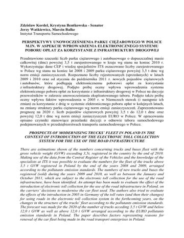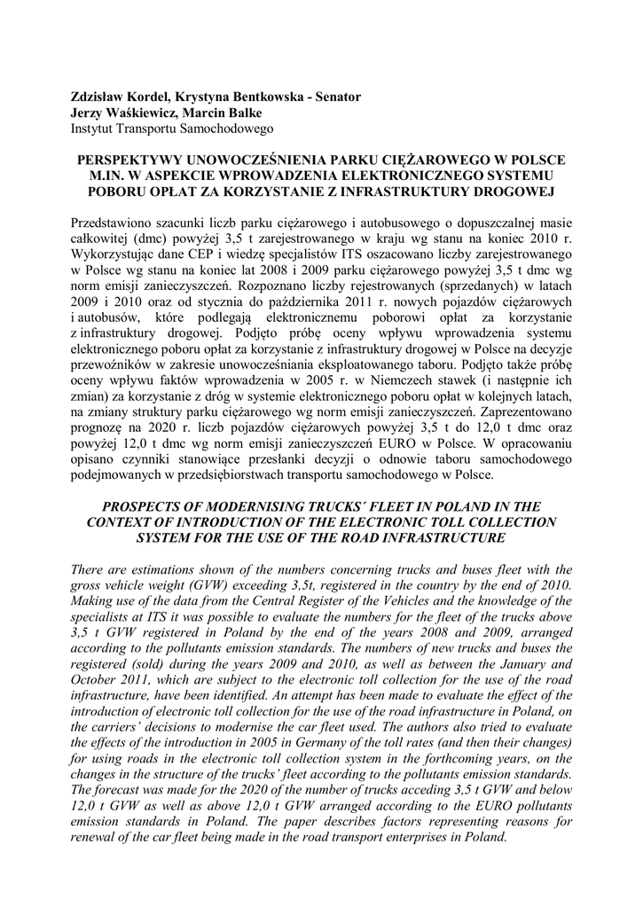 Zdzisław Kordel, Krystyna Bentkowska - Senator Jerzy Waśkiewicz, Marcin Balke Instytut Transportu Samochodowego PERSPEKTYWY UNOWOCZEŚNIENIA PARKU CIĘŻAROWEGO W POLSCE M.IN. W ASPEKCIE WPROWADZENIA ELEKTRONICZNEGO SYSTEMU POBORU OPŁAT ZA KORZYSTANIE Z INFRASTRUKTURY DROGOWEJ Przedstawiono szacunki liczb parku ciężarowego i autobusowego o dopuszczalnej masie całkowitej (dmc) powyżej 3,5 t zarejestrowanego w kraju wg stanu na koniec 2010 r. Wykorzystując dane CEP i wiedzę specjalistów ITS oszacowano liczby zarejestrowanego w Polsce wg stanu na koniec lat 2008 i 2009 parku ciężarowego powyżej 3,5 t dmc wg norm emisji zanieczyszczeń. Rozpoznano liczby rejestrowanych (sprzedanych) w latach 2009 i 2010 oraz od stycznia do października 2011 r. nowych pojazdów ciężarowych i autobusów, które podlegają elektronicznemu poborowi opłat za korzystanie z infrastruktury drogowej. Podjęto próbę oceny wpływu wprowadzenia systemu elektronicznego poboru opłat za korzystanie z infrastruktury drogowej w Polsce na decyzje przewoźników w zakresie unowocześniania eksploatowanego taboru. Podjęto także próbę oceny wpływu faktów wprowadzenia w 2005 r. w Niemczech stawek (i następnie ich zmian) za korzystanie z dróg w systemie elektronicznego poboru opłat w kolejnych latach, na zmiany struktury parku ciężarowego wg norm emisji zanieczyszczeń. Zaprezentowano prognozę na 2020 r. liczb pojazdów ciężarowych powyżej 3,5 t do 12,0 t dmc oraz powyżej 12,0 t dmc wg norm emisji zanieczyszczeń EURO w Polsce. W opracowaniu opisano czynniki stanowiące przesłanki decyzji o odnowie taboru samochodowego podejmowanych w przedsiębiorstwach transportu samochodowego w Polsce. PROSPECTS OF MODERNISING TRUCKS΄ FLEET IN POLAND IN THE CONTEXT OF INTRODUCTION OF THE ELECTRONIC TOLL COLLECTION SYSTEM FOR THE USE OF THE ROAD INFRASTRUCTURE There are estimations shown of the numbers concerning trucks and buses fleet with the gross vehicle weight (GVW) exceeding 3,5t, registered in the country by the end of 2010. Making use of the data from the Central Register of the Vehicles and the knowledge of the specialists at ITS it was possible to evaluate the numbers for the fleet of the trucks above 3,5 t GVW registered in Poland by the end of the years 2008 and 2009, arranged according to the pollutants emission standards. The numbers of new trucks and buses the registered (sold) during the years 2009 and 2010, as well as between the January and October 2011, which are subject to the electronic toll collection for the use of the road infrastructure, have been identified. An attempt has been made to evaluate the effect of the introduction of electronic toll collection for the use of the road infrastructure in Poland, on the carriers’ decisions to modernise the car fleet used. The authors also tried to evaluate the effects of the introduction in 2005 in Germany of the toll rates (and then their changes) for using roads in the electronic toll collection system in the forthcoming years, on the changes in the structure of the trucks’ fleet according to the pollutants emission standards. The forecast was made for the 2020 of the number of trucks acceding 3,5 t GVW and below 12,0 t GVW as well as above 12,0 t GVW arranged according to the EURO pollutants emission standards in Poland. The paper describes factors representing reasons for renewal of the car fleet being made in the road transport enterprises in Poland. Transport Samochodowy 2-2012 1. Wprowadzenie Naturalnym jest, że z biegiem lat następuje proces unowocześniania eksploatowanego parku samochodowego. W rezultacie eliminacji pojazdów zużytych pod względem technicznym lub podlegających tzw. moralnemu zużyciu, odnowiony park prezentuje nowocześniejszą strukturę pod względem energochłonności i emisji zanieczyszczeń z silników spalinowych. Firmy przewozowe podejmują decyzje o wymianie dotychczas eksploatowanego taboru kierując się aktualną własną oceną stanu i przewidywaniem przyszłych uwarunkowań koniunkturalnych na rynku przewozowym. Decyzje przewoźników, dotyczące odnowy własnego parku ciężarowego, warunkowane są wpływem różnorakich czynników zewnętrznych, w tym wpływem czynników o charakterze ekonomicznym. Jednym z takich czynników, mającym za przesłanie (wg założeń organów kreujących politykę transportową) m.in. unowocześnienie struktury ekologicznej parku samochodowego, może być obciążanie użytkowników dróg opłatami za korzystanie z infrastruktury drogowej, zależnymi od klasy emisji zanieczyszczeń powietrza z silników samochodowych. W Polsce od lipca 2011 r. wprowadzono pierwszy etap systemu elektronicznego poboru opłat za korzystanie z określonych odcinków dróg. Opłatom za korzystanie z dróg w Polsce objętej systemem elektronicznego poboru opłat podlega park ciężarowy (w tym ciągniki siodłowe z naczepami) o dopuszczalnej masie całkowitej (dmc) przekraczającej 3,5 t i autobusy. Koszty, które ponoszą w zawiązku z tym przewoźnicy, są zależne od kategorii dróg (autostrady i drogi ekspresowe oraz pozostałe drogi krajowe) oraz od normy emisji zanieczyszczeń, którą spełniają silniki pojazdów samochodowych. Tworząc tabele opłat za korzystanie z infrastruktury drogowej przyjęto jako zasadę, że im pojazd samochodowy spełnia wyższe wymagania norm emisji zanieczyszczeń, tym obowiązujące stawki za 1 km przebiegu są niższe. Nasuwa się w związku z tym pytanie, czy rzeczywiście istniejący system elektronicznego pobierania opłat za korzystanie z infrastruktury drogowej, preferujący nowoczesny tabor samochodowy spełniający wysokie wymagania norm emisji zanieczyszczeń, może wpłynąć na przyspieszenie procesu odnowy polskiego parku samochodowego o dopuszczalnej masie całkowitej powyżej 3,5 t? 2. System elektronicznego poboru opłat za korzystanie z dróg w Polsce Opłata elektroniczna za korzystanie z dróg krajowych w Polsce, objętych syste