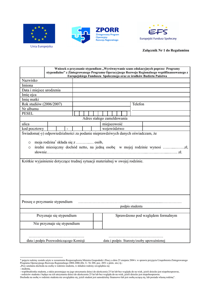 Unia Europejska Załącznik Nr 1 do Regulaminu Wniosek o przyznanie stypendium ,,Wyrównywanie szans edukacyjnych poprzez Programy stypendialne” z Zintegrowanego Programu Operacyjnego Rozwoju Regionalnego współfinansowanego z Europejskiego Funduszu Społecznego oraz ze środków Budżetu Państwa Nazwisko Imiona Data i miejsce urodzenia Imię ojca Imię matki Rok studiów (2006/2007) Nr albumu PESEL Telefon Adres stałego zameldowania ulica miejscowość kod pocztowy województwo Świadoma(-y) odpowiedzialności za podanie nieprawdziwych danych oświadczam, że o moja rodzina* składa się z ………..… osób, o średni miesięczny dochód netto, na jedną osobę w mojej rodzinie wynosi ….…....…….zł, słownie…………………………………………………………………...……..……....……. zł. Krótkie wyjaśnienie dotyczące trudnej sytuacji materialnej w swojej rodzinie. Proszę o przyznanie stypendium ……………………………………..............................…………… podpis studenta Przyznaje się stypendium Sprawdzono pod względem formalnym Nie przyznaje się stypendium ……………………………….…… data i podpis Przewodniczącego Komisji …………………………………… data i podpis Starosty/osoby upoważnionej * pojęcie rodziny zostało użyte w rozumieniu Rozporządzenia Ministra Gospodarki i Pracy a dnia 25 sierpnia 2004 r. w sprawie przyjęcia Uzupełnienia Zintegrowanego Programu Operacyjnego Rozwoju Regionalnego 2004-2006 (Dz. U. Nr 200, poz. 2051 z późn. zm.) tj.: „Przy ustalaniu dochodu na osobę w rodzinie studenta, w składzie rodziny uwzględnia się: - studenta, - współmałżonka studenta, a także pozostające na jego utrzymaniu dzieci do ukończenia 25 lat lub bez względu do na wiek, jeżeli dziecko jest niepełnosprawne, - rodziców studenta i będące na ich utrzymaniu dzieci do ukończenia 25 lat lub bez względu do na wiek, jeżeli dziecko jest niepełnosprawne. Dochodu na osobę w rodzinie studenta nie uwzględnia się, jeżeli student jest samodzielny finansowo lub jest osobą uczącą się, lub posiada własną rodzinę”. Oświadczenie Oświadczam, że informacje zawarte w niniejszym wniosku są zgodne z prawdą. Jednocześnie wyrażam zgodę na udostępnienie niniejszego wniosku innym instytucjom oraz ekspertom dokonującym ewaluacji i oceny. Oświadczam, że nie byłem(am) karany(a) za przestępstwa popełnione umyślnie. Wyrażam zgodę na przetwarzanie moich danych osobowych zgodnie z ustawą z dnia 29 sierpnia 1997r. o ochronie danych osobowych (Dz. U. z 2002 r. Nr 101, poz. 926 z późn. zm.). Ponadto oświadczam, że jestem świadom(a) praw i obowiązków związanych z realizacją projektu finansowanego z Europejskiego Funduszu Społecznego. Jednocześnie oświadczam, że zapoznałem/łam się z Regulaminem przyznawania i przekazywania stypendiów na wyrównywanie szans edukacyjnych dla studentów w roku akademickim 2006/2007. ……………….. data ................................ podpis studenta Unia Europejska Załącznik Nr 2 do Regulaminu OŚWIADCZENIE O DOCHODACH RODZINY UZYSKANYCH W ROKU POPRZEDZAJĄCYM DATĘ ZŁOŻENIA WNIOSKU I. Imię i nazwisko studenta/studentki ........................................................... PESEL .................................. 1. Miejsce zamieszkania (dokładny adres) ................................................................................................... .................................................................................................................................................................. 2. Imiona rodziców ....................................................................................................................................... II. Oświadczam, że moja rodzina składa się z następujących osób i w podanym wyżej okresie dochody moje i członków mojej rodziny, wynosiły: Lp. Imię i nazwisko Data urodzenia Nazwa instytucji miejsca pracy /nauki Stopień Wysokość pokrewieństwa dochodu netto w zł Łączny dochód rodziny Średni łączny dochód netto na 1 członka rodziny wynosi ............................................................... zł, to jest miesięcznie ............................................ zł ZA DOCHÓD UWAŻA SIĘ, PO ODLICZENIU KWOT ALIMENTÓW ŚWIADCZONYCH NA RZECZ INNYCH OSÓB: 1) 2) 3) • • • • • • • • • • przychody podlegające opodatkowaniu na zasadach ogólnych na podstawie przepisów o podatku dochodowym od osób fizycznych, pomniejszone o koszty uzyskania przychodu, należny podatek dochodowy od osób fizycznych, składki na ubezpieczenia społeczne niezaliczone do kosztów uzyskania przychodu oraz składki na ubezpieczenie zdrowotne, deklarowany w oświadczeniu dochód z działalności podlegającej opodatkowaniu na podstawie przepisów o zryczałtowanym podatku dochodowym od niektórych przychodów osiąganych przez osoby fizyczne, pomniejszony o należny zryczałtowany podatek dochodowy i zapłacone składki na ubezpieczenia społeczne i zdrowotne, inne dochody niepodlegające opodatkowaniu na podstawie przepisów o podatku dochodowym od osób fizycznych: renty określone w przepisach o zaopatrzeniu inwalidów wojennych i wojskowych oraz ich rodzin, renty wypłacone osobom represjonowanym i członkom ich rodzin, przyznane na zasadach określonych w przepisach o zaopatrzeniu inwalidów wojennych i wojskowych oraz ich rodzin, świadczenia pieniężne oraz ryczałt energetyczny określone w przepisach o świadczeniu pieniężnym i uprawnieniach przysługujących żołnierzom zastępczej służby wojskowej przymusowo zatrudnianym w kopalniach węgla, kamieniołomach, zakładach rud uranu i batalionach budowlanych, dodatek kombatancki, ryczałt energetyczny i dodatek kompensacyjny określone w przepisach o kombatantach oraz niektórych osobach będących ofiarami represji wojennych i okresu powojennego, świ