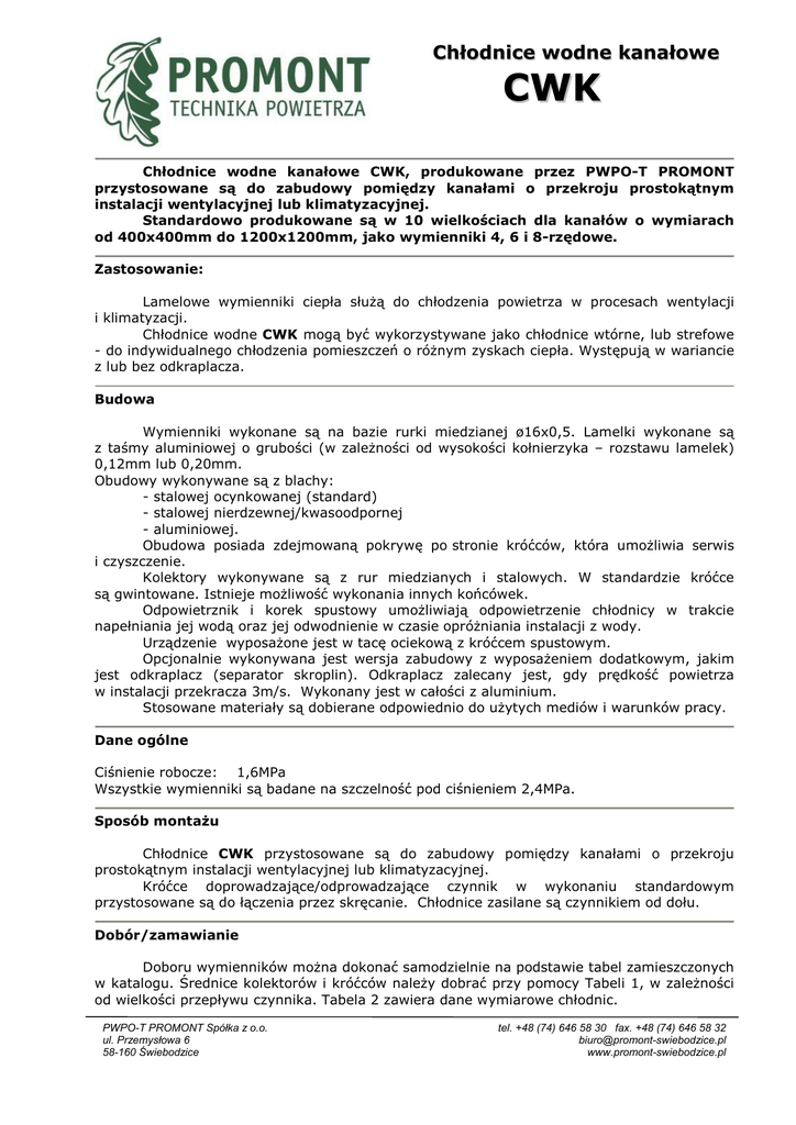 Chłodnice wodne kanałowe CWK Chłodnice wodne kanałowe CWK, produkowane przez PWPO-T PROMONT przystosowane są do zabudowy pomiędzy kanałami o przekroju prostokątnym instalacji wentylacyjnej lub klimatyzacyjnej. Standardowo produkowane są w 10 wielkościach dla kanałów o wymiarach od 400x400mm do 1200x1200mm, jako wymienniki 4, 6 i 8-rzędowe. Zastosowanie: Lamelowe wymienniki ciepła służą do chłodzenia powietrza w procesach wentylacji i klimatyzacji. Chłodnice wodne CWK mogą być wykorzystywane jako chłodnice wtórne, lub strefowe - do indywidualnego chłodzenia pomieszczeń o różnym zyskach ciepła. Występują w wariancie z lub bez odkraplacza. Budowa Wymienniki wykonane są na bazie rurki miedzianej ø16x0,5. Lamelki wykonane są z taśmy aluminiowej o grubości (w zależności od wysokości kołnierzyka – rozstawu lamelek) 0,12mm lub 0,20mm. Obudowy wykonywane są z blachy: - stalowej ocynkowanej (standard) - stalowej nierdzewnej/kwasoodpornej - aluminiowej. Obudowa posiada zdejmowaną pokrywę po stronie króćców, która umożliwia serwis i czyszczenie. Kolektory wykonywane są z rur miedzianych i stalowych. W standardzie króćce są gwintowane. Istnieje możliwość wykonania innych końcówek. Odpowietrznik i korek spustowy umożliwiają odpowietrzenie chłodnicy w trakcie napełniania jej wodą oraz jej odwodnienie w czasie opróżniania instalacji z wody. Urządzenie wyposażone jest w tacę ociekową z króćcem spustowym. Opcjonalnie wykonywana jest wersja zabudowy z wyposażeniem dodatkowym, jakim jest odkraplacz (separator skroplin). Odkraplacz zalecany jest, gdy prędkość powietrza w instalacji przekracza 3m/s. Wykonany jest w całości z aluminium. Stosowane materiały są dobierane odpowiednio do użytych mediów i warunków pracy. Dane ogólne Ciśnienie robocze: 1,6MPa Wszystkie wymienniki są badane na szczelność pod ciśnieniem 2,4MPa. Sposób montażu Chłodnice CWK przystosowane są do zabudowy pomiędzy kanałami o przekroju prostokątnym instalacji wentylacyjnej lub klimatyzacyjnej. Króćce doprowadzające/odprowadzające czynnik w wykonaniu standardowym przystosowane są do łączenia przez skręcanie. Chłodnice zasilane są czynnikiem od dołu. Dobór/zamawianie Doboru wymienników można dokonać samodzielnie na podstawie tabel zamieszczonych w katalogu. Średnice kolektorów i króćców należy dobrać przy pomocy Tabeli 1, w zależności od wielkości przepływu czynnika. Tabela 2 zawiera dane wymiarowe chłodnic. PWPO-T PROMONT Spółka z o.o. ul. Przemysłowa 6 58-160 Świebodzice tel. +48 (74) 646 58 30 fax. +48 (74) 646 58 32 [email protected] www.promont-swiebodzice.pl Przy parametrach odbiegających od podanych w tabelach moce chłodnic i temperatury końcowe powietrza określone mogą być przez projektantów PWPO-T PROMONT. Do doboru chłodnic należy podać następujące dane: - strumień przepływającego powietrza, - parametry czynnika chłodzącego, - temperaturę i wilgotność powietrza na wlocie chłodnicy, - temperaturę na wylocie z chłodnicy lub wymaganą moc wymiennika, - wymiar kanału przyłączeniowego lub wymiary zewnętrzne chłodnicy. Tabela 1. Dobór średnicy kolektora. Przepływ czynnika [m3/h] Średnica kolektora 0,1-1,10 Cu 18mm/ 1/2" 1,11-1,80 Cu 22mm/ 3,4" 1,81-3,10 Cu 28mm/ 1" 3,11-4,60 Cu 35mm/ 1 1/4" 4,61-6,90 Cu 42mm/ 1 1/2" 6,91-12,00 Cu 54mm/ 2" 12,01-16,80 ST DN65/ 2 1/2" 16,81-26,00 ST DN80/ 3" 26,01-48,00 ST DN100/ 4" Tabela 2. Dane wymiarowe chłodnic. L.p. TYP Symbol wymiennika A B L L* 1 CWK -400x400 CW 16 KZ/06T-04,06,08R-270A-30P-02NC 400 400 400 600 2 CWK -500x500 CW 16 KZ/08T-04,06,08R-370A-30P-02NC 500 500 400 600 3 CWK -600x600 CW 16 KZ/10T-04,06,08R-460A-30P-04NC 600 600 400 600 4 CWK -800x600 CW 16 KZ/10T-04,06,08R-660A-30P-04NC 600 800 400 600 5 CWK -800x800 CW 16 KZ/14T-04,06,08R-650A-30P-11NC 800 800 400 600 6 CWK -1000x600 CW 16 KZ/10T-04,06,08R-830A-30P-08NC 600 1000 400 600 7 CWK -1000x800 CW 16 KZ/14T-04,06,08R-830A-30P-14NC 800 1000 400 600 8 CWK -1000x1000 CW 16 KZ/17T-04,06,08R-830A-30P-17NC 1000 1000 400 600 9 CWK -1200x1000 CW 16 KZ/17T-04,06,08R-1020A-30P-17NC 1000 1200 400 600 10 CWK -1200x1200 CW 16 KZ/21T-04,06,08R-1020A-30P-21NC 1200 1200 400 600 L* - wersja z odkraplaczem Rys. 1. Chłodnica kanałowa w wykonaniu prawym (wykonanie lewe – lustrzane odbicie). PWPO-T PROMONT Spółka z o.o. ul. Przemysłowa 6 58-160 Świebodzice tel. +48 (74) 646 58 30 fax. +48 (74) 646 58 32 [email protected] www.promont-swiebodzice.pl