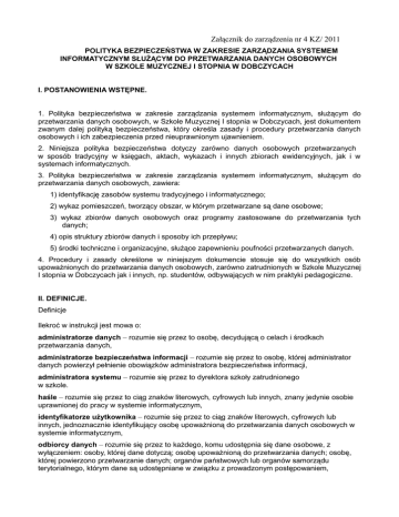 Załącznik do zarządzenia nr 4 KZ/ 2011 POLITYKA BEZPIECZEŃSTWA W ZAKRESIE ZARZĄDZANIA SYSTEMEM INFORMATYCZNYM SŁUŻĄCYM DO PRZETWARZANIA DANYCH OSOBOWYCH W SZKOLE MUZYCZNEJ I STOPNIA W DOBCZYCACH I. POSTANOWIENIA WSTĘPNE. 1. Polityka bezpieczeństwa w zakresie zarządzania systemem informatycznym, służącym do przetwarzania danych osobowych, w Szkole Muzycznej I stopnia w Dobczycach, jest dokumentem zwanym dalej polityką bezpieczeństwa, który określa zasady i procedury przetwarzania danych osobowych i ich zabezpieczenia przed nieuprawnionym ujawnieniem. 2. Niniejsza polityka bezpieczeństwa dotyczy zarówno danych osobowych przetwarzanych w sposób tradycyjny w księgach, aktach, wykazach i innych zbiorach ewidencyjnych, jak i w systemach informatycznych. 3. Polityka bezpieczeństwa w zakresie zarządzania systemem informatycznym, służącym do przetwarzania danych osobowych, zawiera: 1) identyfikację zasobów systemu tradycyjnego i informatycznego; 2) wykaz pomieszczeń, tworzący obszar, w którym przetwarzane są dane osobowe; 3) wykaz zbiorów danych osobowych oraz programy zastosowane do przetwarzania tych danych; 4) opis struktury zbiorów danych i sposoby ich przepływu; 5) środki techniczne i organizacyjne, służące zapewnieniu poufności przetwarzanych danych. 4. Procedury i zasady określone w niniejszym dokumencie stosuje się do wszystkich osób upoważnionych do przetwarzania danych osobowych, zarówno zatrudnionych w Szkole Muzycznej I stopnia w Dobczycach jak i innych, np. studentów, odbywających w nim praktyki pedagogiczne. II. DEFINICJE. Definicje Ilekroć w instrukcji jest mowa o: administratorze danych – rozumie się przez to osobę, decydującą o celach i środkach przetwarzania danych, administratorze bezpieczeństwa informacji – rozumie się przez to osobę, której administrator danych powierzył pełnienie obowiązków administratora bezpieczeństwa informacji, administratora systemu – rozumie się przez to dyrektora szkoły zatrudnionego w szkole. haśle – rozumie się przez to ciąg znaków literowych, cyfrowych lub innych, znany jedynie osobie uprawnionej do pracy w systemie informatycznym, identyfikatorze użytkownika – rozumie się przez to ciąg znaków literowych, cyfrowych lub innych, jednoznacznie identyfikujący osobę upoważnioną do przetwarzania danych osobowych w systemie informatycznym, odbiorcy danych – rozumie się przez to każdego, komu udostępnia się dane osobowe, z wyłączeniem: osoby, której dane dotyczą; osobę upoważnioną do przetwarzania danych; osobę, której powierzono przetwarzanie danych; organów państwowych lub organów samorządu terytorialnego, którym dane są udostępniane w związku z prowadzonym postępowaniem, osobie upoważnionej do przetwarzania danych osobowych – rozumie się przez to pracownika szkoły, która upoważniona została do przetwarzania danych osobowych przez dyrektora szkoły na piśmie, poufności danych – rozumie się przez to właściwość zapewniającą, że dane nie są udostępniane nieupoważnionym osobom, raporcie – rozumie się przez to przygotowane przez system informatyczny zestawienia zakresu i treści przetwarzanych danych, rozporządzeniu MSWiA – rozumie się przez to rozporządzenie Ministra Spraw Wewnętrznych i Administracji z dnia 29 kwietnia 2004 r. w sprawie dokumentacji przetwarzania danych osobowych oraz warunków technicznych i organizacyjnych, jakim powinny odpowiadać urządzenia i systemy informatyczne, służące do przetwarzania danych osobowych (Dz. U. z 2004 r., nr 100, poz. 1024.) serwisancie – rozumie się przez to firmę lub pracownika firmy, zajmującej się instalacją, naprawą i konserwacją sprzętu komputerowego, sieci publicznej – rozumie się przez to sieć telekomunikacyjną, wykorzystywaną głównie do świadczenia publicznie dostępnych usług telekomunikacyjnych, systemie informatycznym – rozumie się przez to zespół współpracujących ze sobą urządzeń, programów, procedur przetwarzania informacji i narzędzi programowych zastosowanych w celu przetwarzania danych, szkole – rozumie się przez to Szkołę Muzyczną I stopnia w Dobczycach. teletransmisji – rozumie się przez to przesyłanie informacji za pośrednictwem sieci telekomunikacyjnej, ustawie – rozumie się przez to ustawę z dnia 29 sierpnia 1997 r. o ochronie danych osobowych (Dz. U. z 2002 r., nr 101, poz. 926. z późn. zm.) uwierzytelnianiu – rozumie się przez to działanie, którego celem jest weryfikacja deklarowanej tożsamości podmiotu, użytkowniku – rozumie się przez to osobę upoważnioną do przetwarzania danych osobowych, której nadano identyfikator i przyznano hasło. III. ORGANIZACJA PRZETWARZANIA DANYCH OSOBOWYCH. 1. Administrator danych osobowych. Administrator danych osobowych, reprezentowany przez dyrektora szkoły, realizuje zadania w zakresie ochrony danych osobowych, w tym zwłaszcza: 1) podejmuje decyzje o celach i środkach przetwarzania danych osobowych z uwzględnieniem przede wszystkim zmian w obowiązującym prawie, organizacji administratora danych oraz technik zabezpieczenia danych osobowych, 2) upoważnia poszczególne osoby do przetwarzania danych osobowych w określonym indywidualnie zakresie, odpowiadającym zakresowi jej obowiązków, oraz odwołuje te upoważnienia lub wyrejestrowuje użytkownika z systemu informatycznego, 3) wyznacza administratora bezpieczeństwa informacji oraz administratora sieci oraz określa zakres ich zadań i czynności, 4) prowadzi ewidencję osób upoważnionych do przetwarzania danych osobowych oraz pozostałą dokumentację z zakresu ochrony danych, o ile jako właściwą do jej prowadzenia nie wskaże inną osobę, 5) zapewnia we współpracy z administratorem bezpieczeństwa informacji i systemu użytkownikom odpowiednie stanowiska i warunki pracy, umożliwiające bezpieczne przetwarzanie danych, 6) podejmuje odpowiednie działania w przypadku naruszenia lub pod