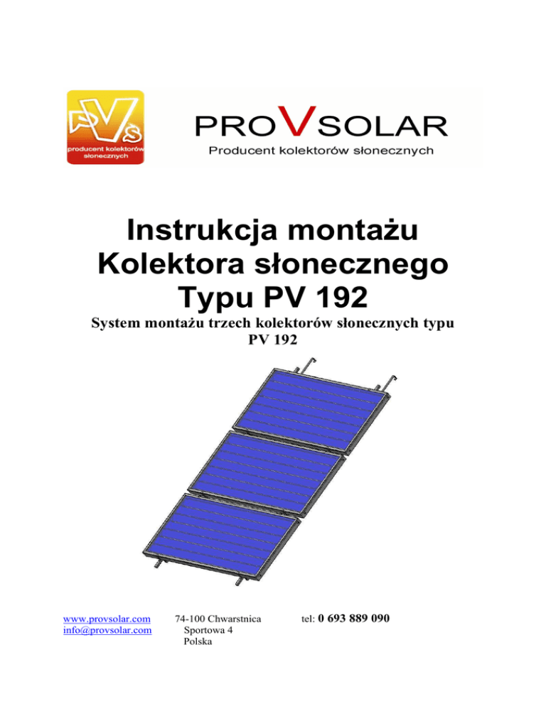 Instrukcja montaŜu Kolektora słonecznego Typu PV 192 System montaŜu trzech kolektorów słonecznych typu PV 192 www.provsolar.com [email protected] 74-100 Chwarstnica Sportowa 4 Polska tel: 0 693 889 090 Zestaw do montaŜu trzech kolektorów PV 192 na dachu. Symbol 1 2 3 4 5 6 7 8 9 10 11 Nazwa elementu Profil aluminiowy wzdłuŜny – nośny Uchwyt ze stali nierdzewnej poddachówkowy S Uchwyt ze stali nierdzewnej trzymający Z Uchwyt „U” łączący dwa kolektory środkowy Nakrętka M8 Podkładka M8 Śruba łącząca uchwyty trzymające z profilem nośnym M8 Nakrętka M10 Podkładka M10 Śruba łącząca profil nośny z uchwytem pod dachówkowym M10 Zaślepka profila aluminiowego Ilość elementów w konstrukcji 2 8 4 4 8 8 8 8 8 8 4 Rys. 1 Elementy konstrukcji stosowanej do montaŜu trzech kolektorów. www.provsolar.com [email protected] 74-100 Chwarstnica Sportowa 4 Polska tel: 0 693 889 090 Instrukcja montaŜu konstrukcji na dwa kolektory 1. Zdjąć dachówki na uchwyt poddachówkowy (2) umieścić kształtownik na legarach konstrukcji dachowej zaczepiając za łatę. Końcówki profila poddachówkowego posiadający otwór powinny wystawać ponad połać dachu (Rys.2) Rys 2. Mocowanie uchwytu poddachówkowego S 2. Rozstaw uchwytów poddachówkowych w poziomie (wymiar X) powinien wynosić około 1400mm. natomiast w pionie (wymiar Y) około 700mm (Rys 3). Rozstaw uchwytów naleŜy dopasować do rzeczywistych warunków, panujących na miejscu montaŜu. Rys. 3 Wymiary orientacyjne rozstawu uchwytów poddachówkowych S www.provsolar.com [email protected] 74-100 Chwarstnica Sportowa 4 Polska tel: 0 693 889 090 Po załoŜeniu dachówek nad połać dachu wystają końce haków z nawierconymi otworami, do których mocowane będą profile wzdłuŜne nośne. 3. Dwa profile wzdłuŜne nośne ułoŜyć gładką powierzchnią ku górze. W dolny rowek profili wsunąć śruby zamkowe krótkie M10x20 następnie włoŜyć je w otwory istniejące w uchwytach poddachówkowych i skręcić nakrętką (Rys 4). Do profila nośnego przymocować za pomocą śrub dolne kształtowniki „Z” i skręcić je lekko śrubami M.8x20. Rys 4. MontaŜ profili wzdłuŜnych na uchwytach poddachówkowych 4. Na tak przygotowane profile (Rys 5) nałoŜyć kolektor słoneczny typu PV 192 w taki sposób aby kolektor słoneczny znajdował się w gnieździe kształtownika „Z” dolnego (Rys.6) , następnie mocujemy uchwyt środkowy „U” (Rys 7) i przykręcamy go śrubą po zamontowaniu uchwytu ustawiamy drugi kolektor PV 192. Po zamontowaniu drugiego kolektora mocujemy drugi uchwyt środkowy „U” przykręcamy go śrubą i ustawiamy trzeci kolektor słoneczny PV192. !!!UWAGA!!! Podczas montaŜu kolektora słonecznego naleŜy przesłonić szybę lub pozostawić kolektor zapakowany. www.provsolar.com [email protected] 74-100 Chwarstnica Sportowa 4 Polska tel: 0 693 889 090 Rys 5. Widok konstrukcji przygotowanej do montaŜu kolektora PV192 Rys 6. Mocowanie kolektora słonecznego w kształtowniku dolnym Z Wyciąganie kolektora na dach powinno się odbywać za pomocą dwóch pasów mocowanych przy brzegach kolektora słonecznego. www.provsolar.com [email protected] 74-100 Chwarstnica Sportowa 4 Polska tel: 0 693 889 090 Rys 7 Mocowanie kolektora w uchwycie środkowym trzymającym U 5. Ostatnim etapem montaŜu jest przykręcenie kształtownika „Z” i przykręcenie go a do profila nośnego. Rys. 8 Mocowanie kolektora słonecznego w kształtowniku górnym Z Po prawidłowo wykonanym montaŜu kolektora słonecznego na konstrukcji dachowej moŜna przystąpić do montaŜu instalacji hydraulicznej. www.provsolar.com [email protected] 74-100 Chwarstnica Sportowa 4 Polska tel: 0 693 889 090 !!!UWAGA!!! MontaŜ instalacji powinien być wykonany przez osobę posiadającą odpowiednie uprawnienia zezwalające na montaŜ urządzeń energetycznych. www.provsolar.com [email protected] 74-100 Chwarstnica Sportowa 4 Polska tel: 0 693 889 090